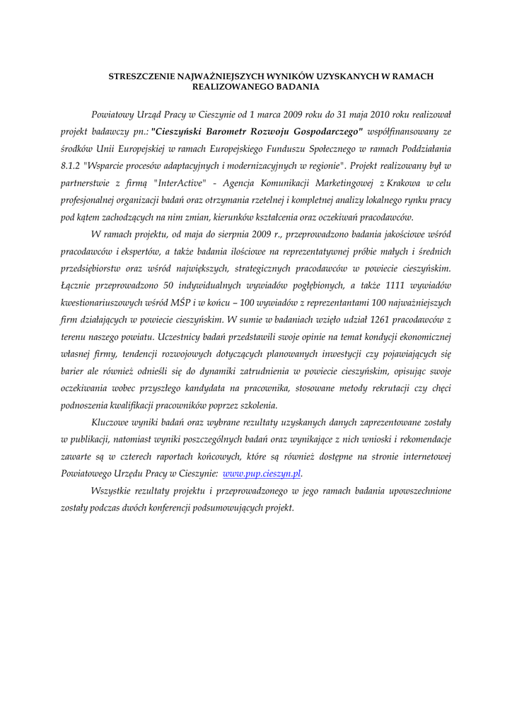 STRESZCZENIE NAJWAśNIEJSZYCH WYNIKÓW UZYSKANYCH W RAMACH REALIZOWANEGO BADANIA Powiatowy Urząd Pracy w Cieszynie od 1 marca 2009 roku do 31 maja 2010 roku realizował projekt badawczy pn.: "Cieszyński Barometr Rozwoju Gospodarczego" współfinansowany ze środków Unii Europejskiej w ramach Europejskiego Funduszu Społecznego w ramach Poddziałania 8.1.2 "Wsparcie procesów adaptacyjnych i modernizacyjnych w regionie". Projekt realizowany był w partnerstwie z firmą "InterActive" - Agencja Komunikacji Marketingowej z Krakowa w celu profesjonalnej organizacji badań oraz otrzymania rzetelnej i kompletnej analizy lokalnego rynku pracy pod kątem zachodzących na nim zmian, kierunków kształcenia oraz oczekiwań pracodawców. W ramach projektu, od maja do sierpnia 2009 r., przeprowadzono badania jakościowe wśród pracodawców i ekspertów, a takŜe badania ilościowe na reprezentatywnej próbie małych i średnich przedsiębiorstw oraz wśród największych, strategicznych pracodawców w powiecie cieszyńskim. Łącznie przeprowadzono 50 indywidualnych wywiadów pogłębionych, a takŜe 1111 wywiadów kwestionariuszowych wśród MŚP i w końcu – 100 wywiadów z reprezentantami 100 najwaŜniejszych firm działających w powiecie cieszyńskim. W sumie w badaniach wzięło udział 1261 pracodawców z terenu naszego powiatu. Uczestnicy badań przedstawili swoje opinie na temat kondycji ekonomicznej własnej firmy, tendencji rozwojowych dotyczących planowanych inwestycji czy pojawiających się barier ale równieŜ odnieśli się do dynamiki zatrudnienia w powiecie cieszyńskim, opisując swoje oczekiwania wobec przyszłego kandydata na pracownika, stosowane metody rekrutacji czy chęci podnoszenia kwalifikacji pracowników poprzez szkolenia. Kluczowe wyniki badań oraz wybrane rezultaty uzyskanych danych zaprezentowane zostały w publikacji, natomiast wyniki poszczególnych badań oraz wynikające z nich wnioski i rekomendacje zawarte są w czterech raportach końcowych, które są równieŜ dostępne na stronie internetowej Powiatowego Urzędu Pracy w Cieszynie: www.pup.cieszyn.pl. Wszystkie rezultaty projektu i przeprowadzonego w jego ramach badania upowszechnione zostały podczas dwóch konferencji podsumowujących projekt.