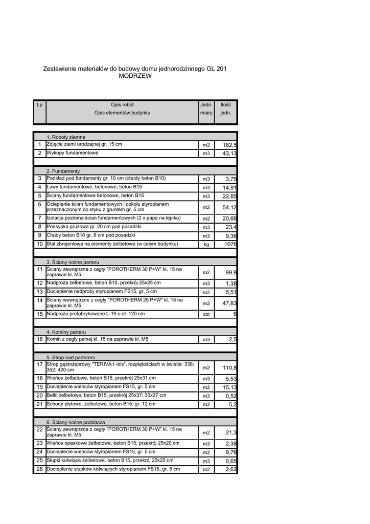 Zestawienie materiałów do budowy domu jednorodzinnego GL 201