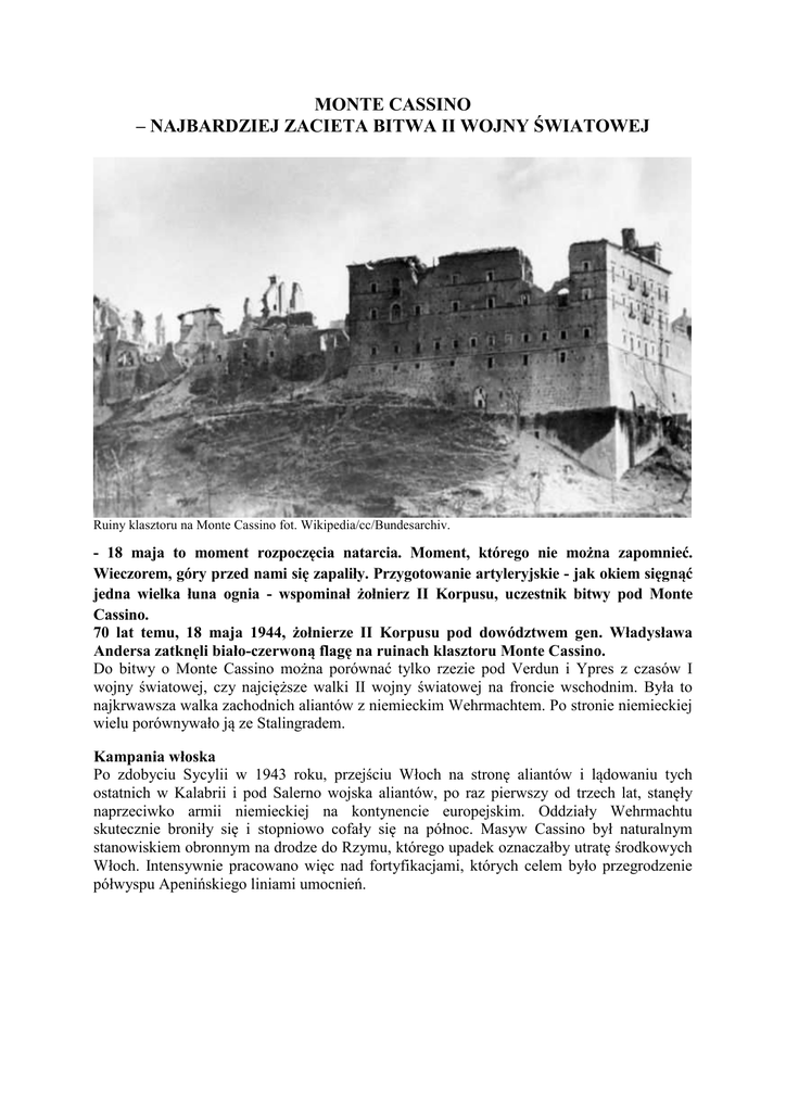 MONTE CASSINO – NAJBARDZIEJ ZACIETA BITWA II WOJNY ŚWIATOWEJ Ruiny klasztoru na Monte Cassino fot. Wikipedia/cc/Bundesarchiv. - 18 maja to moment rozpoczęcia natarcia. Moment, którego nie można zapomnieć. Wieczorem, góry przed nami się zapaliły. Przygotowanie artyleryjskie - jak okiem sięgnąć jedna wielka łuna ognia - wspominał żołnierz II Korpusu, uczestnik bitwy pod Monte Cassino. 70 lat temu, 18 maja 1944, żołnierze II Korpusu pod dowództwem gen. Władysława Andersa zatknęli biało-czerwoną flagę na ruinach klasztoru Monte Cassino. Do bitwy o Monte Cassino można porównać tylko rzezie pod Verdun i Ypres z czasów I wojny światowej, czy najcięższe walki II wojny światowej na froncie wschodnim. Była to najkrwawsza walka zachodnich aliantów z niemieckim Wehrmachtem. Po stronie niemieckiej wielu porównywało ją ze Stalingradem. Kampania włoska Po zdobyciu Sycylii w 1943 roku, przejściu Włoch na stronę aliantów i lądowaniu tych ostatnich w Kalabrii i pod Salerno wojska aliantów, po raz pierwszy od trzech lat, stanęły naprzeciwko armii niemieckiej na kontynencie europejskim. Oddziały Wehrmachtu skutecznie broniły się i stopniowo cofały się na północ. Masyw Cassino był naturalnym stanowiskiem obronnym na drodze do Rzymu, którego upadek oznaczałby utratę środkowych Włoch. Intensywnie pracowano więc nad fortyfikacjami, których celem było przegrodzenie półwyspu Apenińskiego liniami umocnień. Niemcy mieli doskonały wgląd w doliny fot. Wikipedia/cc/Bundesarchiv. Linia Gustawa Najsilniejszą z nich była linia Gustawa - system połączonych niemieckich linii obronnych biegnących przez całą szerokość najwęższej części Włoch między Gaetą i Ortoną. Był to przykład imponującej inżynierii wojskowej. Najpotężniejszy system obronny, z jakim podczas wojny zetknęli się Brytyjczycy i Amerykanie i zapewne najdoskonalsza pozycja obronna w Europie. Niemcy mieli czas na zbadanie każdej możliwej drogi ataku i podjęcie środków zaradczych. Wszędzie kryły się śmiertelne niespodzianki - w każdym miejscu, mogacym posłużyć za osłone podczas natarcia, umieszczono miny lub bomby pułapki. Linia przebiegała przez miejscowość Cassino, leżącą u stóp góry z opactwem benedyktynów na szczycie. Właśnie tutaj niemiecki dowódca Kesselring postanowił stawić opór. Włoski but Przez Cassino wiodła jedna z dwóch dróg umożliwiających marsz na Rzym (druga droga wiodła wzdłuż Morza Tyrreńskiego). Pozostałą część półwyspu przegradzały trudno dostępne góry. Obsadziwszy masywy górskie Niemcy mogli panować nad wiodącymi dolinami drogami, całkowicie blokując wojska alianckie. Postęp kampanii włoskiej był tak boleśnie powolny, że zaczęła budzić zażenowanie, doprowadzając do konfliktów w obozie aliantów. Zadanie, które postawili przed sobą zachodni dowódcy było piekielnie trudne. Już przecież Hannibal wolał przebyć Alpy niż obrać bezpośrednią drogę z Kartaginy na stolicę Imperium Rzymskiego, a Napoleon miał powiedzieć: ”Włochy to but. Trzeba wchodzić w nie od góry”. Od Belizariusza w 536 roku, Rzymu od południa nie zajął nikt. Ruiny miasteczka Cassino w czasie walk fot. Wikimedia Commons. Klasztor Monte Cassino Górujący nad doliną klasztor Monte Cassino był jednym z najświętszych miejsc chrześcijaństwa. Założone, podobno przez rzymskiego arystokratę św. Benedykta w 529 roku, opactwo, przez wiele wieków uchodziło za bastion wiary chrześcijańskiej. Po zażartej i brutalnej bitwie, która odbyła się w jego cieniu podczas II wojny światowej, zaczął też reprezentować coś innego: ludzkie poświęcenie i niemal niewyobrażalne cierpienie. - Prowadziłem go, ale proszę sobie wyobrazić to słońce, maj, niektóre trupy leżały dwa, czy trzy dni. Ja byłem bardzo małomówny. Co mogłem mu powiedzieć? Leży tu Tadzio Gasińki, podchorąży, który był na froncie tylko parę godzin - wspominał weteran walk pod Monte Cassino, któremu przypadło zadanie oprowadzenia po terenie walk Melchiora Wańkowicza. Stosunek sił 24 stycznia 1944 alianckie bombowce zrzuciły obrońcom Monte Cassino ulotki z propozycją ”Stalingrad czy Tunis - okrążenie i zniszczenie lub honorowa kapitulacja". Hitler zarządził jednak, że we Włoszech nie będzie już więcej odwrotów. W tym samym miesiącu przywódca niemiecki wydał następujący rozkaz: ”W ciągu kilku następnych dni rozpocznie się bitwa o Rzym. Będzie miała decydujące znaczenie dla obrony środkowych Włoch i przesądzi o losie 10. Armii (…) Bitwa musi się toczyć w duchu świętej nienawiści do wroga, który prowadzi okrutną wojnę w celu eksterminacji narodu niemieckiego”. Krótka przerw w walce: zbieranie rannych fot. Wikipedia/cc/Bundesarchiv. Alianci panowali na morzu i w powietrzu. Mieli też przewagę w czołgach i transporterach opancerzonych, ale ukształtowanie terenu i zimowa aura często niwelowały tę przewagę. Linię obronną mogła przełamać jedynie piechota. Bitwa o Monte Cassino jako żywo przypominała front zachodni w latach 1916-1917, walkę z epoki przedmechanicznej. Było to więc starcie żołnierza z żołnierzem. Toczona za pomocą granatów, bagnetów, a czasami gołych rąk. O jej wyniku miały przesądzić umiejętności i determinacja żołnierzy. - Nacieraliśmy w mesztach. Niemiec strzelał ponad naszymi głowami i w tym huku podszedłem. Gdy napadłem na nich zaczęła się walka wręcz. Złamałem kolbę w pistolecie automatycznym Thompson, dlatego, bo on mnie uderzył w szczękę pistoletem. Ja go uderzyłem w głowę. Ta walka była prawdziwa. Z niego się krew lała i ze mnie. Tylko dlatego przeżyłem, że działałem z zaskoczenia - mówił żołnierz II Korpusu plut. Antoni Adamus. Przebieg walk Pierwsze uderzenie alianckie na Cassino, prowadzone przez oddziały brytyjskie, amerykańskie i francuskie, rozpoczęło się 17 stycznia 1944. Zostało k