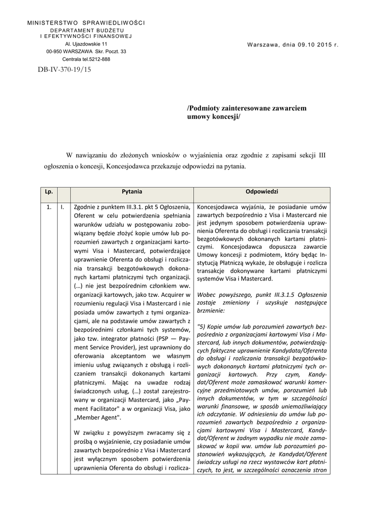 MI N I S T E R S TW O S P R A W I E D L IW O Ś C I DEPARTAME NT BUDŻETU I E F E K T YW N O Ś C I F I N A N S O W E J Al. Ujazdowskie 11 W ar s za wa , d n i a 0 9 . 1 0 2 0 1 5 r . 00-950 WARSZAWA Skr. Poczt. 33 Centrala tel.5212-888 DB-IV-370-19/15 /Podmioty zainteresowane zawarciem umowy koncesji/ W nawiązaniu do złożonych wniosków o wyjaśnienia oraz zgodnie z zapisami sekcji III ogłoszenia o koncesji, Koncesjodawca przekazuje odpowiedzi na pytania. Lp. 1. I. Pytania Odpowiedzi Zgodnie z punktem III.3.1. pkt 5 Ogłoszenia, Oferent w celu potwierdzenia spełniania warunków udziału w postępowaniu zobowiązany będzie złożyć kopie umów lub porozumień zawartych z organizacjami kartowymi Visa i Mastercard, potwierdzające uprawnienie Oferenta do obsługi i rozliczania transakcji bezgotówkowych dokonanych kartami płatniczymi tych organizacji. (…) nie jest bezpośrednim członkiem ww. organizacji kartowych, jako tzw. Acquirer w rozumieniu regulacji Visa i Mastercard i nie posiada umów zawartych z tymi organizacjami, ale na podstawie umów zawartych z bezpośrednimi członkami tych systemów, jako tzw. integrator płatności (PSP — Payment Service Provider), jest uprawniony do oferowania akceptantom we własnym imieniu usług związanych z obsługą i rozliczaniem transakcji dokonanych kartami płatniczymi. Mając na uwadze rodzaj świadczonych usług, (…) został zarejestrowany w organizacji Mastercard, jako „Payment Facilitator" a w organizacji Visa, jako „Member Agent". Koncesjodawca wyjaśnia, że posiadanie umów zawartych bezpośrednio z Visa i Mastercard nie jest jedynym sposobem potwierdzenia uprawnienia Oferenta do obsługi i rozliczania transakcji bezgotówkowych dokonanych kartami płatniczymi. Koncesjodawca dopuszcza zawarcie Umowy koncesji z podmiotem, który będąc Instytucją Płatniczą wykaże, że obsługuje i rozlicza transakcje dokonywane kartami płatniczymi systemów Visa i Mastercard. W związku z powyższym zwracamy się z prośbą o wyjaśnienie, czy posiadanie umów zawartych bezpośrednio z Visa i Mastercard jest wyłącznym sposobem potwierdzenia uprawnienia Oferenta do obsługi i rozlicza- Wobec powyższego, punkt III.3.1.5 Ogłoszenia zostaje zmieniony i uzyskuje następujące brzmienie: "5) Kopie umów lub porozumień zawartych bezpośrednio z organizacjami kartowymi Visa i Mastercard, lub innych dokumentów, potwierdzających faktyczne uprawnienie Kandydata/Oferenta do obsługi i rozliczania transakcji bezgotówkowych dokonanych kartami płatniczymi tych organizacji kartowych. Przy czym, Kandydat/Oferent może zamaskować warunki komercyjne przedmiotowych umów, porozumień lub innych dokumentów, w tym w szczególności warunki finansowe, w sposób uniemożliwiający ich odczytanie. W odniesieniu do umów lub porozumień zawartych bezpośrednio z organizacjami kartowymi Visa i Mastercard, Kandydat/Oferent w żadnym wypadku nie może zamaskować w kopii ww. umów lub porozumień postanowień wykazujących, że Kandydat/Oferent świadczy usługi na rzecz wystawców kart płatniczych, to jest, w szczególności oznaczenia stron Lp. II. Pytania Odpowiedzi nia transakcji bezgotówkowych dokonanych kartami płatniczymi? Innymi słowy, czy posiadanie statusu Acquirera, jest warunkiem koniecznym udziału w Postępowaniu, czy też dopuszcza się zawarcie Umowy koncesji z podmiotem, który będąc Krajową Instytucją Płatniczą wykaże, że obsługuje karty płatnicze systemów Visa i Mastercard, na podstawie umów z bezpośrednimi członkami tych organizacji (Acquirerami), pod warunkiem spełniania pozostałych wymogów, o których mowa w Ogłoszeniu. umowy oraz przedmiotu umowy lub porozumienia. Kandydat/Oferent nie może zamaskować w innych dokumentach, o których mowa w niniejszym punkcie postanowień wykazujących, że faktycznie posiada uprawnienia do obsługi kart płatniczych systemu Visa i Mastercard." Zgodnie z punktem III.3.3. Ogłoszenia, warunkiem zawarcia Umowy koncesji z wybranym już Oferentem będzie przedłożenie polisy ubezpieczeniowej na ubezpieczenie od odpowiedzialności cywilnej wyłącznie z tytułu zobowiązań Operatora Płatności wynikających z Umowy koncesji, o wartości nie mniejszej nit 20.000.000,00 zł. W dalszej części nin. punktu wskazano, że w przypadku braku polisy, Oferent będzie mógł złożyć inny dokument potwierdzający, że Oferent jest ubezpieczony od odpowiedzialności cywilnej. W związku z powyższym zwracamy się z wnioskiem o: Odnośnie pytania postawionego w pkt. 1 powyżej, Koncesjodawca wyjaśnia, że posiadanie polisy ubezpieczeniowej zabezpieczającej wyłącznie zobowiązania wynikające z Umowy koncesji (i żadnej innej umowy) będzie warunkiem koniecznym zawarcia Umowy koncesji. 1. Potwierdzenie, że posiadanie polisy zabezpieczającej wyłącznie zobowiązania wynikające z Umowy koncesji (i żadnej innej umowy), nie jest warunkiem koniecznym zawarcia Umowy koncesji, o której mowa w Ogłoszeniu, 2. Wyjaśnienie, jakie wymagania powinien spełniać wspomniany „inny dokument" potwierdzający, ze Oferent jest ubezpieczony od odpowiedzialności cywilnej, aby spełniał kryterium należytego zabezpieczenia wykonywania Umowy koncesji, w szczególności, jaka powinna być wysokość sumy ubezpieczenie oraz zakres ochrony ubezpieczeniowej. Odnośnie pytania postanowionego w pkt. 2 powyżej, Koncesjodawca wyjaśnia, że szczegółowe wymagania dotyczące przedmiotowego ubezpieczenia, w szczególności: okres jego obowiązywania, szczegółowe warunki ubezpieczenia, zostaną podane w OWK i Umowie koncesji. Przez inny dokument potwierdzający, że Operator Płatności jest ubezpieczony należy w szczególności rozumieć zaświadczenie od ubezpieczyciela, certyfikat poświadczający, ze Operator Płatności jest ubezpieczony. Suma ubezpieczenia wynosi nie mniej niż 20.000.000 zł (dwadzieścia milionów złotych). 2. I. "KONCESJODAWCA MOŻE UDZIELAĆ ODPOWIEDZI na pytania Zainter