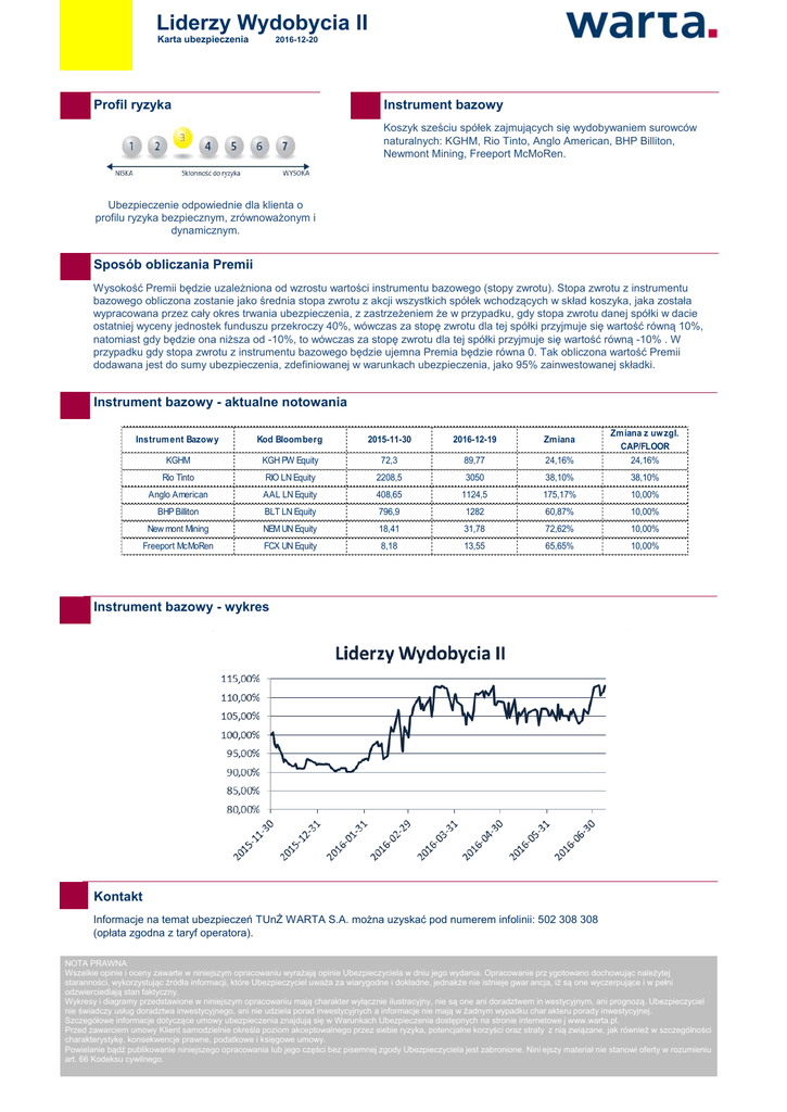 Liderzy Wydobycia II Karta ubezpieczenia 2016-12-20 Profil ryzyka Instrument bazowy Koszyk sześciu spółek zajmujących się wydobywaniem surowców naturalnych: KGHM, Rio Tinto, Anglo American, BHP Billiton, Newmont Mining, Freeport McMoRen. Ubezpieczenie odpowiednie dla klienta o profilu ryzyka bezpiecznym, zrównoważonym i dynamicznym. Sposób obliczania Premii Wysokość Premii będzie uzależniona od wzrostu wartości instrumentu bazowego (stopy zwrotu). Stopa zwrotu z instrumentu bazowego obliczona zostanie jako średnia stopa zwrotu z akcji wszystkich spółek wchodzących w skład koszyka, jaka została wypracowana przez cały okres trwania ubezpieczenia, z zastrzeżeniem że w przypadku, gdy stopa zwrotu danej spółki w dacie ostatniej wyceny jednostek funduszu przekroczy 40%, wówczas za stopę zwrotu dla tej spółki przyjmuje się wartość równą 10%, natomiast gdy będzie ona niższa od -10%, to wówczas za stopę zwrotu dla tej spółki przyjmuje się wartość równą -10% . W przypadku gdy stopa zwrotu z instrumentu bazowego będzie ujemna Premia będzie równa 0. Tak obliczona wartość Premii dodawana jest do sumy ubezpieczenia, zdefiniowanej w warunkach ubezpieczenia, jako 95% zainwestowanej składki. Instrument bazowy - aktualne notowania Instrument Bazow y Kod Bloomberg 2015-11-30 2016-12-19 Zmiana Zmiana z uw zgl. CAP/FLOOR KGHM KGH PW Equity 72,3 89,77 24,16% 24,16% Rio Tinto RIO LN Equity 2208,5 3050 38,10% 38,10% Anglo American AAL LN Equity 408,65 1124,5 175,17% 10,00% BHP Billiton BLT LN Equity 796,9 1282 60,87% 10,00% New mont Mining NEM UN Equity 18,41 31,78 72,62% 10,00% Freeport McMoRen FCX UN Equity 8,18 13,55 65,65% 10,00% Instrument bazowy - wykres Kontakt Informacje na temat ubezpieczeń TUnŻ WARTA S.A. można uzyskać pod numerem infolinii: 502 308 308 (opłata zgodna z taryf operatora). NOTA PRAWNA Wszelkie opinie i oceny zawarte w niniejszym opracowaniu wyrażają opinie Ubezpieczyciela w dniu jego wydania. Opracowanie prz ygotowano dochowując należytej staranności, wykorzystując źródła informacji, które Ubezpieczyciel uważa za wiarygodne i dokładne, jednakże nie istnieje gwar ancja, iż są one wyczerpujące i w pełni odzwierciedlają stan faktyczny. Wykresy i diagramy przedstawione w niniejszym opracowaniu mają charakter wyłącznie ilustracyjny, nie są one ani doradztwem in westycyjnym, ani prognozą. Ubezpieczyciel nie świadczy usług doradztwa inwestycyjnego, ani nie udziela porad inwestycyjnych a informacje nie mają w żadnym wypadku char akteru porady inwestycyjnej. Szczegółowe informacje dotyczące umowy ubezpieczenia znajdują się w Warunkach Ubezpieczenia dostępnych na stronie internetowe j www.warta.pl. Przed zawarciem umowy Klient samodzielnie określa poziom akceptowalnego przez siebie ryzyka, potencjalne korzyści oraz straty z nią związane, jak również w szczególności charakterystykę, konsekwencje prawne, podatkowe i księgowe umowy. Powielanie bądź publikowanie niniejszego opracowania lub jego części bez pisemnej zgody Ubezpieczyciela jest zabronione. Nini ejszy materiał nie stanowi oferty w rozumieniu art. 66 Kodeksu cywilnego.