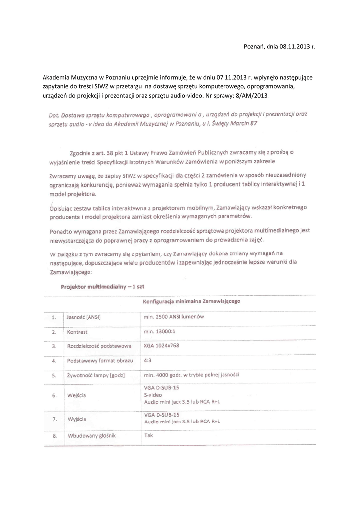 Poznań, dnia 08.11.2013 r. Akademia Muzyczna w Poznaniu uprzejmie informuje, że w dniu 07.11.2013 r. wpłynęło następujące zapytanie do treści SIWZ w przetargu na dostawę sprzętu komputerowego, oprogramowania, urządzeń do projekcji i prezentacji oraz sprzętu audio-video. Nr sprawy: 8/AM/2013. Odpowiedź zamawiającego. Ad. 1. W tabeli poniżej przedstawiamy zmodyfikowaną specyfikację zestawu tablica z projektorem mobilnym. Przez mobilność projektora rozumiemy, możliwość wykorzystania jego również po odłączeniu od zestawu (praca samodzielna). Ad. 2. Zamawiający uważa, że podana przez niego rozdzielczość projektora multimedialnego (dotyczy Części 2 - Zał. nr 6b do SIWZ : pkt. II/1.) jest wystarczająca dla podanych funkcji, ponadto podane parametry są to wartości minimalne, które mogą być przez Dostawcę zmodyfikowane i przedstawione w postaci sprzętu o lepszej jakości. Tablica interaktywna min. 79” 1. Przekątna powierzchni roboczej 2. Rodzaj powierzchni magnetyczna matowa sucho ścieralna odporna na uszkodzenie 3. Sposób obsługi palec lub dowolny wskaźnik 4. 5. 6. 7. 8. Format obrazu Rozdzielczość min. 4096 x 4096 Dokładność odczytu Komunikacja Paski skrótów 4:3 min. 4096 x 4096 1 mm USB po obu stronach tablicy 9. 10. USB Windows XP/Vista/7/8 (32 i 64 bit), Linux, MacOS X 11. Zasilanie Zgodność z systemami operacyjnymi Oprogramowanie 12. Akcesoria - min. 3 pisaki w różnych kolorach - instrukcja obsługi w języku polskim - kabel USB min. 7.5 m - statyw mobilny do tablic interaktywnych zgodny z zaoferowanym typem tablicy, pozwalający na zamontowanie tablicy i projektora, o konstrukcji stalowej, wyposażony w kółka jezdne umożliwiające przemieszczanie całego zestawu (tablica, projektor, statyw), wyposażony w uniwersalne ramię do projektorów krótkoogniskowych, regulacja wysokości położenia tablicy ( minimalna odległość od podłoża 0,4m, regulacja wysokości tablicy w zakresie min. 0,4m) 13. Gwarancja min. 36 miesięcy Oprogramowanie do obsługi tablicy w języku polskim, licencja umożliwiająca na zainstalowanie i użytkowanie w całej organizacji Zamawiającego Projektor krótkoogniskowy 1. Jasność [ANSI] min. 3000 ANSI lumenów 2. Kontrast min. 10 000 : 1 3. 4. 5. Rozdzielczość podstawowa Podstawowy format obrazu Żywotność lampy [h] 6. Wejścia 7. Wyposażenie i akcesoria XGA 1024x768 4:3 min. 4000 h w trybie pełnej jasności min. 6000 h w trybie eco VGA D-SUB-15 S-Video Audio mini Jack 3.5 lub RCA R+L HDMI 1.3 Kabel VGA (D-Sub-15) min. 10m Kabel zasilający Pilot 8. Funkcje 9. Gwarancja Korekcja Keystone Menu ekranowe w języku polskim min. 36 miesięcy Niniejsza modyfikacja SIWZ nie prowadzi do zmiany ogłoszenia o zamówieniu. Zamieszczono na stronie internetowej www.amuz.edu.pl