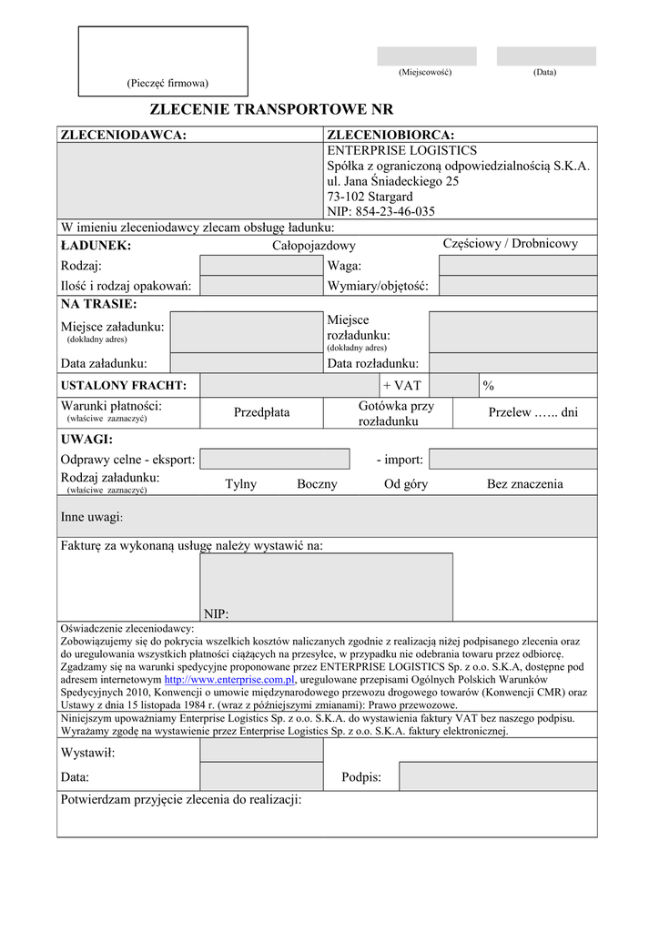 (Miejscowość) (Data) (Pieczęć firmowa) ZLECENIE TRANSPORTOWE NR ZLECENIODAWCA: ZLECENIOBIORCA: ENTERPRISE LOGISTICS Spółka z ograniczoną odpowiedzialnością S.K.A. ul. Jana Śniadeckiego 25 73-102 Stargard NIP: 854-23-46-035 W imieniu zleceniodawcy zlecam obsługę ładunku: Częściowy / Drobnicowy ŁADUNEK: Całopojazdowy Rodzaj: Waga: Ilość i rodzaj opakowań: NA TRASIE: Wymiary/objętość: Miejsce załadunku: Miejsce rozładunku: (dokładny adres) (dokładny adres) Data załadunku: Data rozładunku: + VAT USTALONY FRACHT: Warunki płatności: Gotówka przy rozładunku Przedpłata (właściwe zaznaczyć) % Przelew .….. dni UWAGI: Odprawy celne - eksport: Rodzaj załadunku: (właściwe zaznaczyć) - import: Tylny Boczny Od góry Bez znaczenia Inne uwagi: Fakturę za wykonaną usługę należy wystawić na: NIP: Oświadczenie zleceniodawcy: Zobowiązujemy się do pokrycia wszelkich kosztów naliczanych zgodnie z realizacją niżej podpisanego zlecenia oraz do uregulowania wszystkich płatności ciążących na przesyłce, w przypadku nie odebrania towaru przez odbiorcę. Zgadzamy się na warunki spedycyjne proponowane przez ENTERPRISE LOGISTICS Sp. z o.o. S.K.A, dostępne pod adresem internetowym http://www.enterprise.com.pl, uregulowane przepisami Ogólnych Polskich Warunków Spedycyjnych 2010, Konwencji o umowie międzynarodowego przewozu drogowego towarów (Konwencji CMR) oraz Ustawy z dnia 15 listopada 1984 r. (wraz z późniejszymi zmianami): Prawo przewozowe. Niniejszym upoważniamy Enterprise Logistics Sp. z o.o. S.K.A. do wystawienia faktury VAT bez naszego podpisu. Wyrażamy zgodę na wystawienie przez Enterprise Logistics Sp. z o.o. S.K.A. faktury elektronicznej. Wystawił: Data: Potwierdzam przyjęcie zlecenia do realizacji: Podpis: