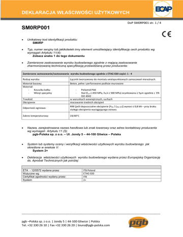 DEKLARACJA WŁAŚCIWOŚCI UŻYTKOWYCH DoP SM0RP001 str. 1 / 4 SM0RP001 Unikatowy kod identyfikacji produktu: SM0RP Typ, numer seryjny lub jakikolwiek inny element umożliwiający identyfikację cech produktu wg wymagań Artykułu 11(4): Zobacz aneks 1 do tego dokumentu Zamierzone zastosowanie wyrobu budowlanego zgodnie z mającą zastosowanie zharmonizowaną techniczną specyfikacją przewidzianą przez producenta: Zamierzone zastosowanie/zastosowania wyrobu budowlanego zgodnie z ETAG 020 części: 1 - 4 Rodzaj wyrobu Łącznik tworzywowy do montażu wielopunktowych zamocowań nienośnych. Materiał bazowy Materiał: Koszulka kołka Wkręt specjalny Beton, pełne i perforowane podłoże murowane Trwałość Obciążenie - Poliamid PA6 Stal (fy,k ≥ 450 MPa, fu,k ≥ 580 MPa) ocynkowana ≥ 5µm zgodnie z EN ISO 4042 w warunkach wewnętrznych, suchych mocowanie średnich obciążeń Odporność ogniowa: R90 (jeśli dopuszczalne obciążenie [FRK / (M.F)] wynosi ≤ 0,8 kN – przy braku stałego obciążenia wyciągającego osiowo. Zakres temperaturowy 24/40°C Nazwa, zarejestrowana nazwa handlowa lub znak towarowy oraz adres kontaktowy producenta wg wymagań Artykułu 11 (5): pgb-Polska sp. z o.o. – Ul. Jondy 5 – 44-100 Gliwice – Polska System lub systemy oceny i weryfikacji właściwości użytkowych wyrobu budowlanego jak określone w aneksie V: System 2+ Deklaracja właściwości użytkowych wyrobu budowlanego wydana przez Europejską Organizację ds. Aprobat Technicznych jak poniżej: ETA - 12/0572 wydana przez Wytyczne wg Certyfikat zgodności wydany przez: System ITB Poland ETAG 020 ITB 2+ -------------------------------------------------------------------------------------------------------------------------------------pgb –Polska sp. z o.o. | Jondy 5 | 44-100 Gliwice | Polska Tel. +32 330 26 10 | Fax +32 330 26 20 | [email protected] DEKLARACJA WŁAŚCIWOŚCI UŻYTKOWYCH DoP SM0RP001 str. 2 / 4 Deklarowane właściwości – Istotne parametry – Właściwości Parametry instalacyjne: d0 hef Średnica otworu wierconego Całkowita głębokość zakotwienia łącznika tworzywowego 10 70 [mm] [mm] Deklarowane właściwości w odniesieniu do ETAG 020 części: 1 - 4 NRk,s Wytrzymałość charakterystyczna na wyrywanie Ms VRk,s Częściowy współczynnik bezpieczeństwa wytrzymałości charakterystycznej na wyrywanie Wytrzymałość charakterystyczna na ścinanie Ms Częściowy współczynnik bezpieczeństwa wytrzymałości charakterystycznej na ścinanie MRk,s Wytrzymałość charakterystyczna na zginanie Ms Częściowy współczynnik bezpieczeństwa wytrzymałości charakterystycznej na zginanie hmin [kN] 16,35 [-] 1,54 [kN] 11,08 [-] 1,28 [Nm] 22,62 [-] 1,28 Minimalna grubość elementu betonowego [mm] 100 smin Minimalny rozstaw łączników Beton ≥ C16/20 Beton C12/15 [mm] 100 140 cmin Minimalna odległość łącznika od krawędzi podłoża Beton ≥ C16/20 Beton C12/15 [mm] 100 140 Wytrzymałość charakterystyczna na wyrywanie w spękanym betonie: C12/15 C16/20 [kN] 1,2 2,0 NRk,p,ucr Wytrzymałość charakterystyczna na wyrywanie w niespękanym betonie: [kN] 4,01 Mc Współczynnik bezpieczeństwa [-] 1,8 ccr,N Maksymalna odległość łącznika od krawędzi podłoża Beton ≥ C16/20 Beton C12/15 [mm] 120 170 F Rozciąganie pod wpływem sił wyrywających [kN] 0,79 N0,cr Krótkoterminowe przemieszczenie pod wpływem sił wyrywających: [mm] 0,55 N∞,cr Długoterminowe przemieszczenie pod wpływem sił wyrywających: [mm] 0,55 F Rozciąganie pod wpływem sił ścinających [kN] 1,14 V0 Krótkoterminowe przemieszczenie pod wpływem sił ścinających: Długoterminowe przemieszczenie pod wpływem sił ścinających [mm] 0,89 [mm] 1,33 NRk,p,cr V∞ 1 Zgodnie z raportem: n° LOK 02-6026/12/R080SK -------------------------------------------------------------------------------------------------------------------------------------pgb –Polska sp. z o.o. | Jondy 5 | 44-100 Gliwice | Polska Tel. +32 330 26 10 | Fax +32 330 26 20 | [email protected] DEKLARACJA WŁAŚCIWOŚCI UŻYTKOWYCH DoP SM0RP001 str. 3 / 4 hmin Minimalna grubość materiału: Cegła pełna HD 250x120x65 EN771-1 Cegła perforowana pionowo Porotherm 25 P+W, EN 771-1 [mm] 120 250 smin Minimalny rozstaw łączników w wypadku montażu pojedynczych kotew: [mm] 250 cmin Minimalna odległość łącznika od krawędzi podłoża [mm] 100 [mm] 200 400 kotew2 Smin1 Smin2 FRk Mc F N0,cr N∞,cr F V0 V∞ Minimalny rozstaw łączników dla grupy Obciążenia montowane prostopadle do krawędzi Obciążenia montowane równolegle do krawędzi Wytrzymałość charakterystyczna na wyrywanie w podłożu murowanym: Cegła pełna HD 250x120x65 EN771-1 Cegła perforowana pionowo Porotherm 25 P+W, EN 771-1 Współczynnik bezpieczeństwa Przemieszczenie pod wpływem sił wyrywających: Cegła pełna HD 250x120x65 EN771-1 Cegła perforowana pionowo Porotherm 25 P+W, EN 771-1 Krótkoterminowe przemieszczenie pod wpływem sił wyrywających: Cegła pełna HD 250x120x65 EN771-1 Cegła perforowana pionowo Porotherm 25 P+W, EN 771-1 Długoterminowe przemieszczenie pod wpływem sił wyrywających: Cegła pełna HD 250x120x65 EN771-1 Cegła perforowana pionowo Porotherm 25 P+W, EN 771-1 Rozciąganie pod wpływem sił ścinających Cegła pełna HD 250x120x65 EN771-1 Cegła perforowana pionowo Porotherm 25 P+W, EN 771-1 Krótkoterminowe przemieszczenie pod wpływem sił ścinających: Cegła pełna HD 250x120x65 EN771-1 Cegła perforowana pionowo Porotherm 25 P+W, EN 771-1 Długoterminowe przemieszczenie pod wpływem sił ścinających: Cegła pełna HD 250x120x65 EN771-1 Cegła perforowana pionowo Porotherm 25 P+W, EN 771-1 [kN] 3,5 0,5 [-] 2,5 [kN] 0,48 0,17 [mm] 0,92 0,13 [mm] 1,84 0,26 [kN] 0,48 0,17 [mm] 0,40 0,14 [mm] 0,60 0,21 Właściwości wyrobu określonego powyższym kodem identyfikacyjnym są zgodne z deklarowanymi właściwościami wyrobu. Niniejsza deklaracja wydana jest na wyłączną odpowiedzialność ECAP. Podpisano w