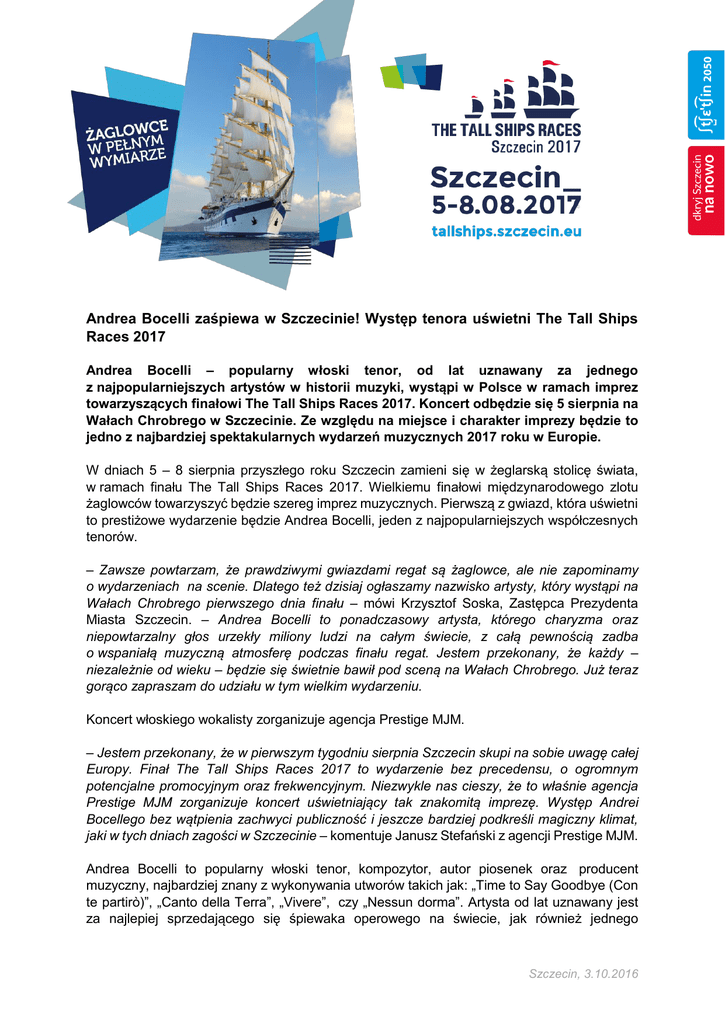 Andrea Bocelli zaśpiewa w Szczecinie! Występ tenora uświetni The Tall Ships Races 2017 Andrea Bocelli – popularny włoski tenor, od lat uznawany za jednego z najpopularniejszych artystów w historii muzyki, wystąpi w Polsce w ramach imprez towarzyszących finałowi The Tall Ships Races 2017. Koncert odbędzie się 5 sierpnia na Wałach Chrobrego w Szczecinie. Ze względu na miejsce i charakter imprezy będzie to jedno z najbardziej spektakularnych wydarzeń muzycznych 2017 roku w Europie. W dniach 5 – 8 sierpnia przyszłego roku Szczecin zamieni się w żeglarską stolicę świata, w ramach finału The Tall Ships Races 2017. Wielkiemu finałowi międzynarodowego zlotu żaglowców towarzyszyć będzie szereg imprez muzycznych. Pierwszą z gwiazd, która uświetni to prestiżowe wydarzenie będzie Andrea Bocelli, jeden z najpopularniejszych współczesnych tenorów. – Zawsze powtarzam, że prawdziwymi gwiazdami regat są żaglowce, ale nie zapominamy o wydarzeniach na scenie. Dlatego też dzisiaj ogłaszamy nazwisko artysty, który wystąpi na Wałach Chrobrego pierwszego dnia finału – mówi Krzysztof Soska, Zastępca Prezydenta Miasta Szczecin. – Andrea Bocelli to ponadczasowy artysta, którego charyzma oraz niepowtarzalny głos urzekły miliony ludzi na całym świecie, z całą pewnością zadba o wspaniałą muzyczną atmosferę podczas finału regat. Jestem przekonany, że każdy – niezależnie od wieku – będzie się świetnie bawił pod sceną na Wałach Chrobrego. Już teraz gorąco zapraszam do udziału w tym wielkim wydarzeniu. Koncert włoskiego wokalisty zorganizuje agencja Prestige MJM. – Jestem przekonany, że w pierwszym tygodniu sierpnia Szczecin skupi na sobie uwagę całej Europy. Finał The Tall Ships Races 2017 to wydarzenie bez precedensu, o ogromnym potencjalne promocyjnym oraz frekwencyjnym. Niezwykle nas cieszy, że to właśnie agencja Prestige MJM zorganizuje koncert uświetniający tak znakomitą imprezę. Występ Andrei Bocellego bez wątpienia zachwyci publiczność i jeszcze bardziej podkreśli magiczny klimat, jaki w tych dniach zagości w Szczecinie – komentuje Janusz Stefański z agencji Prestige MJM. Andrea Bocelli to popularny włoski tenor, kompozytor, autor piosenek oraz producent muzyczny, najbardziej znany z wykonywania utworów takich jak: „Time to Say Goodbye (Con te partirò)”, „Canto della Terra”, „Vivere”, czy „Nessun dorma”. Artysta od lat uznawany jest za najlepiej sprzedającego się śpiewaka operowego na świecie, jak również jednego Szczecin, 3.10.2016 z najlepiej sprzedających się artystów w historii muzyki. Jego dotychczasowe albumy sprzedały się w nakładzie ponad 80 milionów egzemplarzy. Wokalista znany jest również z wielu niezapomnianych duetów, m.in. z Celine Dion, Sarah Brightman oraz Luciano Pavarottim. Trudno wskazać drugiego wykonawcę muzyki poważnej, którego twórczość zajmowałaby nieprzerwanie tak wysokie miejsca na szczytach międzynarodowych list przebojów muzyki rozrywkowej. Włoski tenor zrobił imponującą karierę zarówno w świecie muzyki poważnej, jak i popularnej, a jego wpływ na współczesny przemysł muzyczny jest nie do przecenienia. Andrea Bocelli znany jest z niezwykłych koncertów w trakcie których oczarowuje publiczność imponującą skalą głosu i wyjątkową osobowością. W latach 1995 - 2016 tenor wystąpił na żywo ponad 400 razy, dając średnio zaledwie kilkanaście koncertów rocznie. Dlatego też każdy występ artysty przed publicznością na żywo to niezwykle prestiżowe wydarzenie muzyczne. Do najważniejszych występów scenicznych w karierze tenora należały: występ podczas Festiwalu Piosenki Włoskiej w San Remo (1994), koncert wraz z Sarah Brightman w amerykańskim Liberty State Park (2002), występ w trakcie 71. ceremonii wręczenia Oscarów (1999) oraz koncert przed finałem piłkarskiej Ligii Mistrzów (2016). W 2010 roku Andrea Bocelli zaśpiewał też na koncercie podczas Mistrzostw Świata w piłce nożnej w RPA. W duecie ze słynnym włoskim tenorem zaprezentował się wówczas kanadyjski wokalista rockowy Bryan Adams i południowoafrykańska sopranistka Pretty Yende. Tenor wydał dotychczas piętnaście albumów studyjnych, w tym kilka kompletnych oper. Zdecydowana większość z nich cieszy się zarówno w naszym kraju, jak i na świecie statusem Złotej Płyty. Ogromnym sukcesem okazały się zwłaszcza ostatnie wydawnictwa. Tak było między innymi w przypadku albumu "Passione" wydanego w 2013 roku, który zawiera kolekcję śródziemnomorskich utworów miłosnych, nagranych przez Bocellego w duetach m.in. z Jennifer Lopez oraz Nelly Furtado. W tym samym roku światło dzienne ujrzała również płyta "Love In Portofino", zawierająca nagranie wideo z koncertu Andrei Bocellego we Włoszech, w trakcie którego wykonał na żywo utwory z wydawnictwa "Passione". Z kolei w październiku 2015 roku ukazała się piętnasta płyta artysty, zatytułowana "Cinema", zawierająca najbardziej znane kompozycje muzyki filmowej wszech czasów, m.in. z filmów takich jak „Doktor Żywago”, „Love Story”, „Ojciec Chrzestny”, „Życie jest piękne”, „Gladiator” oraz „Śniadanie u Tiffany’ego”. Najnowszy album Bocellego także otrzymał w naszym kraju status Złotej Płyty. – Choć perspektywa wydaje się odległa, to czas biegnie bardzo szybko. Zaczynamy odliczać dni do kolejnego finału regat wielkich żaglowców w Szczecinie. To dla nas ogromne wyzwanie, nad którym pracujemy od wielu miesięcy. Już dzisiaj zapraszam do uczestnictwa w tym wyjątkowym wydarzeniu – mówi Krzysztof Soska, Zastępca Prezydent Miasta Szczecin. Andrea Bocelli wystąpi w Szczecinie 5 sierpnia 2017 roku. Organizatorem koncertu będzie agencja Prestige MJM. Sprzedaż biletów na koncert rozpocznie się w środę, 5 października 2016 roku. Bilety będzie można nabywać za pośrednictwem strony: prestigemjm.com, a także eBilet