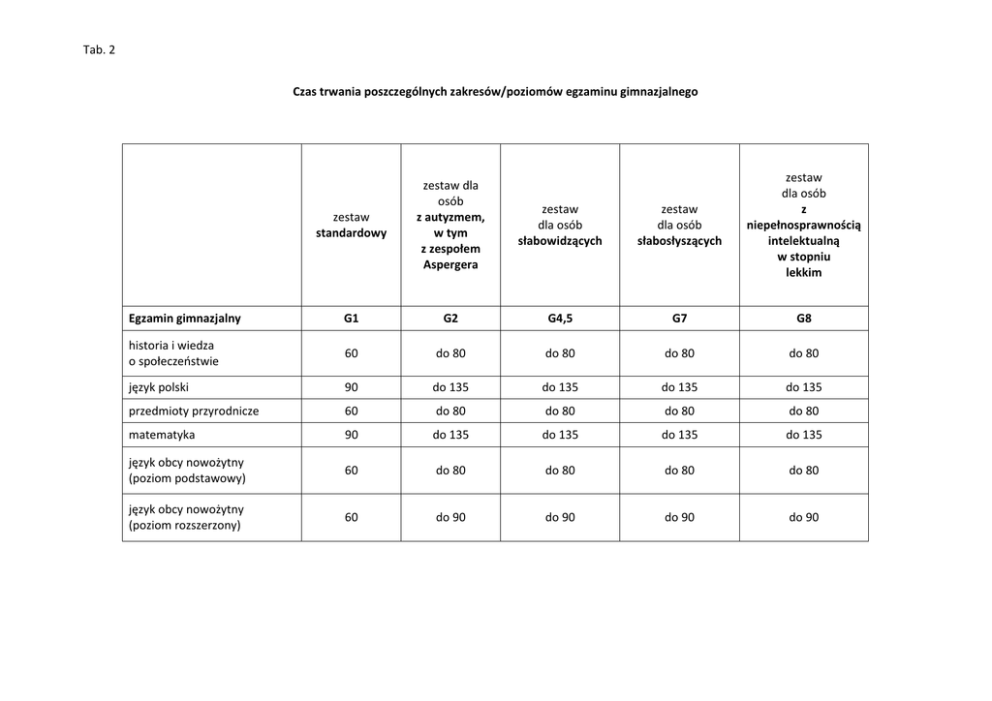 Tab. 2 Czas trwania poszczególnych zakresów/poziomów egzaminu gimnazjalnego zestaw standardowy zestaw dla osób z autyzmem, w tym z zespołem Aspergera zestaw dla osób słabowidzących zestaw dla osób słabosłyszących zestaw dla osób z niepełnosprawnością intelektualną w stopniu lekkim Egzamin gimnazjalny G1 G2 G4,5 G7 G8 historia i wiedza o społeczeństwie 60 do 80 do 80 do 80 do 80 język polski 90 do 135 do 135 do 135 do 135 przedmioty przyrodnicze 60 do 80 do 80 do 80 do 80 matematyka 90 do 135 do 135 do 135 do 135 język obcy nowożytny (poziom podstawowy) 60 do 80 do 80 do 80 do 80 język obcy nowożytny (poziom rozszerzony) 60 do 90 do 90 do 90 do 90