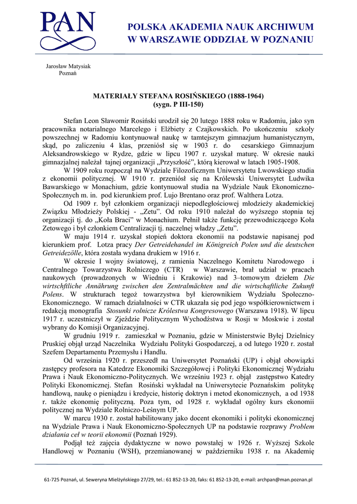 POLSKA AKADEMIA NAUK ARCHIWUM W WARSZAWIE ODDZIAŁ W POZNANIU Jarosław Matysiak Poznań MATERIAŁY STEFANA ROSIŃSKIEGO (1888-1964) (sygn. P III-150) Stefan Leon Sławomir Rosiński urodził się 20 lutego 1888 roku w Radomiu, jako syn pracownika notarialnego Marcelego i Elżbiety z Czajkowskich. Po ukończeniu szkoły powszechnej w Radomiu kontynuował naukę w tamtejszym gimnazjum humanistycznym, skąd, po zaliczeniu 4 klas, przeniósł się w 1903 r. do cesarskiego Gimnazjum Aleksandrowskiego w Rydze, gdzie w lipcu 1907 r. uzyskał maturę. W okresie nauki gimnazjalnej należał tajnej organizacji „Przyszłość”, którą kierował w latach 1905-1908. W 1909 roku rozpoczął na Wydziale Filozoficznym Uniwersytetu Lwowskiego studia z ekonomii politycznej. W 1910 r. przeniósł się na Królewski Uniwersytet Ludwika Bawarskiego w Monachium, gdzie kontynuował studia na Wydziale Nauk EkonomicznoSpołecznych m. in. pod kierunkiem prof. Lujo Brentano oraz prof. Walthera Lotza. Od 1909 r. był członkiem organizacji niepodległościowej młodzieży akademickiej Związku Młodzieży Polskiej - „Zetu”. Od roku 1910 należał do wyższego stopnia tej organizacji tj. do „Koła Braci” w Monachium. Pełnił także funkcję przewodniczącego Koła Zetowego i był członkiem Centralizacji tj. naczelnej władzy „Zetu”. W maju 1914 r. uzyskał stopień doktora ekonomii na podstawie napisanej pod kierunkiem prof. Lotza pracy Der Getreidehandel im Königreich Polen und die deutschen Getreidezölle, która została wydana drukiem w 1916 r. W okresie I wojny światowej, z ramienia Naczelnego Komitetu Narodowego i Centralnego Towarzystwa Rolniczego (CTR) w Warszawie, brał udział w pracach naukowych (prowadzonych w Wiedniu i Krakowie) nad 3–tomowym dziełem Die wirtschftliche Annährung zwischen den Zentralmächten und die wirtschaftliche Zukunft Polens. W strukturach tegoż towarzystwa był kierownikiem Wydziału SpołecznoEkonomicznego. W ramach działalności w CTR ukazała się pod jego współkierownictwem i redakcją monografia Stosunki rolnicze Królestwa Kongresowego (Warszawa 1918). W lipcu 1917 r. uczestniczył w Zjeździe Politycznym Wychodźstwa w Rosji w Moskwie i został wybrany do Komisji Organizacyjnej. W grudniu 1919 r. zamieszkał w Poznaniu, gdzie w Ministerstwie Byłej Dzielnicy Pruskiej objął urząd Naczelnika Wydziału Polityki Gospodarczej, a od lutego 1920 r. został Szefem Departamentu Przemysłu i Handlu. Od września 1920 r. przeszedł na Uniwersytet Poznański (UP) i objął obowiązki zastępcy profesora na Katedrze Ekonomiki Szczegółowej i Polityki Ekonomicznej Wydziału Prawa i Nauk Ekonomiczno-Politycznych. We wrześniu 1923 r. objął zastępstwo Katedry Polityki Ekonomicznej. Stefan Rosiński wykładał na Uniwersytecie Poznańskim politykę handlową, naukę o pieniądzu i kredycie, historię doktryn i metod ekonomicznych, a od 1938 r. także ekonomię polityczną. Poza tym, od 1928 r. wykładał ogólny kurs ekonomii politycznej na Wydziale Rolniczo-Leśnym UP. W marcu 1930 r. został habilitowany jako docent ekonomiki i polityki ekonomicznej na Wydziale Prawa i Nauk Ekonomiczno-Społecznych UP na podstawie rozprawy Problem działania ceł w teorii ekonomii (Poznań 1929). Podjął też zajęcia dydaktyczne w nowo powstałej w 1926 r. Wyższej Szkole Handlowej w Poznaniu (WSH), przemianowanej w październiku 1938 r. na Akademię 61-725 Poznań, ul. Seweryna Mielżyńskiego 27/29, tel.: 61 852-13-20, faks: 61 852-13-20, e-mail: [email protected] POLSKA AKADEMIA NAUK ARCHIWUM W WARSZAWIE ODDZIAŁ W POZNANIU Handlową w Poznaniu (AH). W listopadzie 1934 r. został mianowany profesorem nadzwyczajnym ekonomii społecznej w WSH i powołany na Katedrę Nadzwyczajną Ekonomii Społecznej tej uczelni. W maju 1939 r. objął obowiązki zastępcy prorektora AH. Do 1939 r. Stefan Rosiński wykładał w WSH/AH naukę o pieniądzu i kredycie, a od 1938 r. także ekonomię polityczną. Brał udział w pracach Kuratorium uczelni - organu podejmującego decyzje w sprawach organizacji studiów, wyposażenia i finansów. Uczestniczył także w pracach Komisji Morskiej Instytutu Bałtyckiego. W latach 19291935 był radcą Izby Przemysłowo-Handlowej w Poznaniu. Po wybuchu II wojny światowej, jesienią 1939 r. poprzez niemiecki obóz przejściowy dla wysiedlanej ludności polskiej, został przesiedlony do Generalnego Gubernatorstwa, gdzie do końca wojny pracował w Krakowie, w Zarządzie Głównym Banku Emisyjnego w Polsce. Wiosną 1945 r. Stefan Rosiński powrócił do Poznania i podjął zajęcia na UP i AH. Obok kontynuowania przedwojennych wykładów na obydwu uczelniach, wykładał ponadto na UP politykę ekonomiczną. W lipcu 1945 r. został mianowany profesorem nadzwyczajnym ekonomii politycznej na Wydziale Prawno-Ekonomicznym UP, a w latach 1949-1952 prowadził jako dyrektor wspólnie z prof. Janem Zdzitowieckim Zakład Nauk Ekonomicznych. W 1954 r. otrzymał tytuł profesora zwyczajnego UP. We wrześniu 1960 r. przeszedł na emeryturę. W lipcu 1945 r. na podstawie uchwały Rady Profesorów Akademii Handlowej w Poznaniu otrzymał tytuł profesora zwyczajnego (zatwierdzenie uchwały przez Ministra Oświaty nastąpiło w październiku 1945 r.). W latach 1945-1950 kierował na tej uczelni Katedrą Ekonomii Politycznej. Od września 1945 r. do sierpnia 1949 r. pełnił również obowiązki Prorektora. Był także stałym, aktywnym członkiem Rady Profesorów, mającej w swojej pieczy problemy organizacji studiów, treści nauczania, pracy wychowawczej z młodzieżą oraz doboru kadry nauczającej. W roku akademickim 1950/1951, po przekształceniu Akademii Handlowej na wielowydziałową Wyższą Szkołę Ekonomiczną, pełnił funkcje dziekana nowo utworzonego Wydziału Handlu. Zorganizował i uruchomił także Katedrę Finansów i Kredytu, którą kierował do marca 1952 r. Uczestniczył także w pracach Kuratorium. W marcu 1952 r. WSE rozwiązała z nim stosu