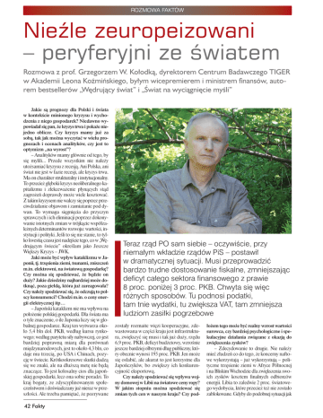 ROZMOWA FAKTÓW Nieźle zeuropeizowani – peryferyjni ze światem Rozmowa z prof. Grzegorzem W. Kołodką, dyrektorem Centrum Badawczego TIGER w Akademii Leona Koźmińskiego, byłym wicepremierem i ministrem finansów, autorem bestsellerów „Wędrujący świat” i „Świat na wyciągnięcie myśli” Jakie są prognozy dla Polski i świata w kontekście minionego kryzysu i wychodzenia z niego gospodarek? Niedawno wypowiadał się pan, że kryzys trwa i pokaże niejedno oblicze. Czy kryzys mamy już za sobą, tak jak można wyczytać w wielu prognozach i ocenach analityków, czy jest to optymizm „na wyrost”? – Analityków mamy głównie od tego, by się mylili... Przede wszystkim nie należy utożsamiać kryzysu z recesją. Ani Polska, ani świat nie jest w fazie recesji, ale kryzys trwa. Ma on charakter strukturalny i instytucjonalny. To przecież głęboki kryzys neoliberalnego kapitalizmu i zlekceważenie płynących stąd zagrożeń doprawdy może wiele kosztować. Z takim kryzysem nie walczy się poprzez przeciwdziałanie objawom i zamiatanie pod dywan. To wymaga sięgnięcia do przyczyn sprawczych i ich eliminacji poprzez dokonywanie istotnych zmian w trójkącie współzależnych determinantów rozwoju: wartości, instytucji i polityki. Jeśli to się nie stanie, to tylko kwestią czasu jest nadejście tego, co w „Wędrującym świecie” określam jako Jeszcze Większy Kryzys – JWK. Jaki może być wpływ kataklizmu w Japonii, tj. trzęsienia ziemi, tsunami, zniszczeń m.in. elektrowni, na światową gospodarkę? Czy można się spodziewać, że będzie on duży? Jakie dziedziny najbardziej może dotknąć, poza giełdą, która już zareagowała? Czy należy spodziewać się, że odczują to polscy konsumenci? Chodzi m.in. o ceny energii elektrycznej itp… – Japoński kataklizm nie ma wpływu na położenie polskiej gospodarki. Dla świata ma o tyle znaczenie, o ile Japonia liczy się w globalnej gospodarce. Kraj ten wytwarza około 5,4 bln dol. PKB, według kursu rynkowego; według parytetu siły nabywczej, co jest bardziej poprawną miarą dla porównań międzynarodowych, jest to około 4,3 bln, co daje mu trzecią, po USA i Chinach, pozycję w świecie. Krótkookresowe skutki dadzą się we znaki, ale na dłuższą metę nie będą znaczące. To jest kolosalny cios dla japońskiej gospodarki, lecz ona sobie poradzi. To kraj bogaty, ze zdyscyplinowanym społeczeństwem i doświadczany już nieraz w przeszłości. Ale trzeba pamiętać, że pozrywane 42 Fakty Teraz rząd PO sam siebie – oczywiście, przy niemałym wkładzie rządów PiS – postawił w dramatycznej sytuacji. Musi przeprowadzić bardzo trudne dostosowanie fiskalne, zmniejszając deficyt całego sektora finansowego z prawie 8 proc. poniżej 3 proc. PKB. Chwyta się więc różnych sposobów. Tu podnosi podatki, tam tnie wydatki, tu zwiększa VAT, tam zmniejsza ludziom zasiłki pogrzebowe zostały rozmaite więzi kooperacyjne, zdewastowana w części kraju jest infrastruktura, zwiększyć się musi i tak już duży, rzędu 6,9 proc. PKB, deficyt budżetowy, wzrośnie jeszcze bardziej olbrzymi dług publiczny, który obecnie wynosi 195 proc. PKB. Jen może się osłabić, ale akurat to jest korzystne dla Japończyków, bo zwiększy ich konkurencyjność eksportową. Czy należy spodziewać się wpływu wojny domowej w Libii na światowe ceny ropy? W jakim stopniu można spodziewać się zmian tych cen w naszym kraju? Czy pod- łożem tego może być realny wzrost wartości surowca, czy bardziej psychologiczne i spekulacyjne działania związane z okazją do zwiększenia zysków? – Zdecydowanie to drugie. Nie należy mieć złudzeń co do tego, że koncerny naftowe wykorzystają – już wykorzystują – polityczne trzęsienie ziemi w Afryce Północnej i na Bliskim Wschodzie dla zwiększenia swoich zysków kosztem finalnych odbiorców energii. Libia to zaledwie 2 proc. światowego wydobycia, które przecież też nie zostało zablokowane. Gdyby do podobnej sytuacji jak ROZMOWA FAKTÓW w Libii doszło w Arabii Saudyjskiej, to sytuacja byłaby dużo poważniejsza. Liczą się także bardzo Irak, Iran, a dalej też Nigeria, Angola, Wenezuela… Scena jest bardzo niestabilna. I dlatego ceny będą rosły, nawet jeśli nie będzie spadać produkcja. Od tego przecież mamy rynek. Jaka jest obecna kondycja polskiej gospodarki? Czy polska gospodarka jest faktycznie „zielona wyspą”? – Rzeczywista kondycja naszej gospodarki powinna być postrzegana nie w kontekście rządowej propagandy o „zielonej wyspie”, lecz na tle sytuacji, która miałaby miejsce przy właściwej polityce gospodarczej. Wtedy tempo wzrostu gospodarczego byłoby szybsze, bezrobocie i emigracja zarobkowa mniejsze, baza podatkowa szersza i nie doszłoby do de facto załamania budżetu państwa. Polskę ominęła recesja, bo spadaliśmy z wysokiego wskaźnika ponad 7-proc. wzrostu PKB i udało się zatrzymać „powyżej kreski”, ale niestety nie ominął nas kryzys. Przejawia się on w jednym z najwyższych w Unii Europejskiej poziomie bezrobocia, niskim stopniu wykorzystania istniejących mocy wytwórczych, spadku inwestycji i olbrzymim deficycie budżetowym. „Wyspa” zatem mocno poczerwieniała, gdyż w roku 2010 na 25 krajów tzw. wyłaniających się rynków, dla których dane co tydzień przytacza „The Economist”, aż w 20 tempo wzrostu gospodarczego było wyższe niż w Polsce. Jak pan ocenia proponowane przez rząd zmiany systemu emerytalnego i OFE? Czy zmiany proponowane przez prof. L. Balcerowicza to dobry kierunek? – Ostatnie rządy swą wadliwą polityką podczas minionych pięciu lat doprowadziły do załamania równowagi budżetowej. Na podobną skalę, jak doprowadziła to tego neoliberalna polityka na początku lat 90. wskutek szoku bez terapii i pod ich koniec w wyniku przechłodzenia gospodarki bez potrzeby. Być może L. Balcerowicz chciał zatrzeć przykre wspomnienia, jakie wywołują jego b