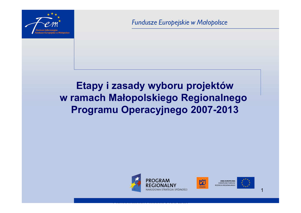 Etapy i zasady wyboru projektów w ramach Małopolskiego Regionalnego Programu Operacyjnego 2007-2013 Szkolenie współfinansowane ze środków Unii Europejskiej z Europejskiego Funduszy Rozwoju 1 Pełna dokumentacja Informacje na temat Działania 4.3 Tworzenie i rozwój stref aktywności gospodarczej Wniosek o dofinansowanie Studium wykonalności Szkolenie współfinansowane ze środków Unii Europejskiej z Europejskiego Funduszy Rozwoju 2 CELE MRPO Cel główny Tworzenie warunków dla wzrostu gospodarczego i zatrudnienia. Cele szczegółowe Podnoszenie konkurencyjności i innowacyjności gospodarki Małopolski Spójność wewnętrzna regionu osiągana w oparciu o zasadę zrównowaŜonego rozwoju Wzmacnianie potencjału instytucjonalnego podmiotów z terenu Małopolski Szkolenie współfinansowane ze środków Unii Europejskiej z Europejskiego Funduszy Rozwoju 3 ALOKACJA MRPO 1 290 mln EURO Szkolenie współfinansowane ze środków Unii Europejskiej z Europejskiego Funduszy Rozwoju 4 ALOKACJA W RAMACH POSZCZEGÓLNYCH PRIORYTETÓW MRPO Priorytet Wielkość alokacji (EUR) I. Warunki dla rozwoju społeczeństwa opartego na wiedzy 162 841 230 II. Gospodarka regionalnej szansy 161 000 000 III. Turystyka i przemysł kulturowy 101 004 036 IV. Infrastruktura dla rozwoju regionalnego 390 836 457 V. Krakowski obszar metropolitalny 171 897 053 VI. Spójność wewnątrzregionalna 155 981 854 VII. Infrastruktura ochrony środowiska 93 003 516 VIII. Współpraca międzyregionalna 10 000 399 IX. Pomoc Techniczna 47 059 716 Szkolenie współfinansowane ze środków Unii Europejskiej z Razem: Europejskiego Funduszy Rozwoju 5 1 290 274 402 CEL DZIAŁANIA 4.3 Tworzenie i rozwój stref aktywności gospodarczej Podniesienie atrakcyjności inwestycyjnej regionu, poprzez tworzenie korzystnych warunków do lokowania na jego obszarze przedsiębiorstw / inwestycji. Szkolenie współfinansowane ze środków Unii Europejskiej z Europejskiego Funduszy Rozwoju 6 DZIAŁANIE 4.3 Tworzenie i rozwój stref aktywności gospodarczej Schemat A Strefy aktywności gospodarczej o powierzchni 2 – 20 ha Nabór zamknięty: 24 sierpnia – 22 września 2009 r. Schemat B Strefy aktywności gospodarczej o powierzchni powyŜej 20 ha Nabór ciągły: od 24 sierpnia do dnia wyboru do dofinansowania projektu, który wyczerpie środki alokacji przewidzianej na konkurs Szkolenie współfinansowane ze środków Unii Europejskiej z Europejskiego Funduszy Rozwoju 7 DZIAŁANIE 4.3 Tworzenie i rozwój stref aktywności gospodarczej Schemat A Strefy aktywności gospodarczej o powierzchni 2 – 20 ha Schemat B Strefy aktywności gospodarczej o powierzchni powyŜej 20 ha Rodzaje projektów: 1. Kompleksowe uzbrojenie terenów przeznaczonych na nową strefę aktywności gospodarczej (w szczególności zlokalizowana na terenie strefy infrastruktura: wodno-kanalizacyjna, energetyczna (elektryczna), drogi wewnętrzne). Wydatki poniesione przez Beneficjenta na doprowadzenie do granic strefy aktywności gospodarczej niezbędnej infrastruktury technicznej oraz budowę/przebudowę/modernizację lub rozbudowę dróg dojazdowych do strefy nie mogą łącznie stanowić więcej niŜ 30% wydatków kwalifikowanych projektu. Natomiast wydatki poniesione na nabycie nieruchomości gruntowej (tereny przeznaczone na nową strefę aktywności gospodarczej) kwalifikowane są do wysokości 10% całkowitych wydatków kwalifikowanych projektu. Szkolenie współfinansowane ze środków Unii Europejskiej z Europejskiego Funduszy Rozwoju 8 DZIAŁANIE 4.3 Tworzenie i rozwój stref aktywności gospodarczej Rodzaje projektów c.d.: 2. Poszerzenie istniejącej strefy inwestycyjnej poprzez kompleksowe uzbrojenie nowych terenów inwestycyjnych oraz uzbrojenie terenów obecnej strefy aktywności gospodarczej w infrastrukturę niezbędną, aby nowo przyłączone tereny stanowiły funkcjonalną całość z dotychczasowym obszarem strefy (w szczególności zlokalizowana na terenie strefy infrastruktura: wodnokanalizacyjna, energetyczna (elektryczna), drogi wewnętrzne). Wydatki poniesione przez Beneficjenta na doprowadzenie do granic strefy aktywności gospodarczej niezbędnej infrastruktury technicznej oraz budowę/przebudowę/modernizację lub rozbudowę dróg dojazdowych do strefy nie mogą łącznie stanowić więcej niŜ 30% wydatków kwalifikowanych projektu. Natomiast wydatki poniesione na nabycie nieruchomości gruntowej (tereny przeznaczone na poszerzenie istniejącej strefy aktywności gospodarczej) kwalifikowane są do wysokości 10% całkowitych wydatków kwalifikowanych projektu. Szkolenie współfinansowane ze środków Unii Europejskiej z Europejskiego Funduszy Rozwoju 9 DZIAŁANIE 4.3 Tworzenie i rozwój stref aktywności gospodarczej Rodzaje projektów c.d.: 3. Kompleksowe dozbrojenie strefy aktywności gospodarczej, polegające w szczególności na uzupełnieniu zlokalizowanej na terenie strefy infrastruktury: wodno-kanalizacyjnej, gazowej i energetycznej (elektrycznej), drogi wewnętrzne. Wydatki poniesione przez Beneficjenta na doprowadzenie do granic strefy aktywności gospodarczej niezbędnej infrastruktury technicznej oraz budowę/przebudowę/modernizację lub rozbudowę dróg dojazdowych do strefy nie mogą łącznie stanowić więcej niŜ 30% wydatków kwalifikowanych projektu. 4. Inwestycje w budowę nowych, rozbudowę lub przebudowę istniejących budynków na cele tworzonego inkubatora przedsiębiorczości, wyłącznie na obszarze strefy aktywności gospodarczej, jako element projektów wskazanych w pkt. od 1 do 3. Projekt moŜe łączyć w sobie elementy przykładowych rodzajów projektów wskazanych w pkt.1do 3. Szkolenie współfinansowane ze środków Unii Europejskiej z Europejskiego Funduszy Rozwoju 10 DZIAŁANIE 4.3 Tworzenie i rozwój stref aktywności gospodarczej Schemat A Strefy aktywności gospodarczej o powierzchni 2-20 ha Schemat B Strefy aktywności gospodarczej o powierzchni powyŜej 20 ha Beneficjenci: • • • • • Jednostki samo