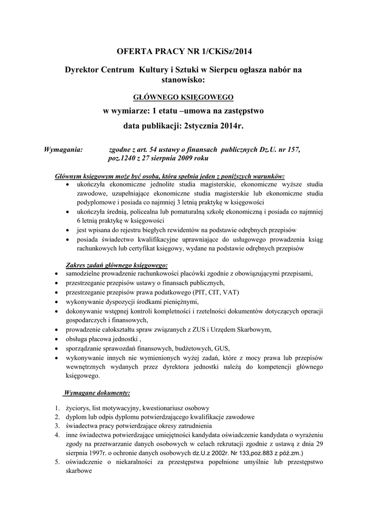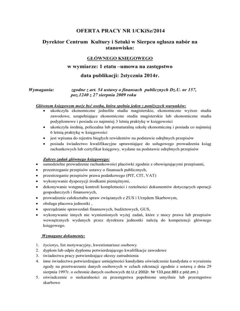 OFERTA PRACY NR 1/CKiSz/2014 Dyrektor Centrum Kultury i Sztuki w Sierpcu ogłasza nabór na stanowisko: GŁÓWNEGO KSIĘGOWEGO w wymiarze: 1 etatu –umowa na zastępstwo data publikacji: 2stycznia 2014r. Wymagania: zgodne z art. 54 ustawy o finansach publicznych Dz.U. nr 157, poz.1240 z 27 sierpnia 2009 roku Głównym księgowym może być osoba, która spełnia jeden z poniższych warunków: ukończyła ekonomiczne jednolite studia magisterskie, ekonomiczne wyższe studia zawodowe, uzupełniające ekonomiczne studia magisterskie lub ekonomiczne studia podyplomowe i posiada co najmniej 3 letnią praktykę w księgowości ukończyła średnią, policealna lub pomaturalną szkołę ekonomiczną i posiada co najmniej 6 letnią praktykę w księgowości jest wpisana do rejestru biegłych rewidentów na podstawie odrębnych przepisów posiada świadectwo kwalifikacyjne uprawniające do usługowego prowadzenia ksiąg rachunkowych lub certyfikat księgowy, wydane na podstawie odrębnych przepisów Zakres zadań głównego księgowego: samodzielne prowadzenie rachunkowości placówki zgodnie z obowiązującymi przepisami, przestrzeganie przepisów ustawy o finansach publicznych, przestrzeganie przepisów prawa podatkowego (PIT, CIT, VAT) wykonywanie dyspozycji środkami pieniężnymi, dokonywanie wstępnej kontroli kompletności i rzetelności dokumentów dotyczących operacji gospodarczych i finansowych, prowadzenie całokształtu spraw związanych z ZUS i Urzędem Skarbowym, obsługa płacowa jednostki , sporządzanie sprawozdań finansowych, budżetowych, GUS, wykonywanie innych nie wymienionych wyżej zadań, które z mocy prawa lub przepisów wewnętrznych wydanych przez dyrektora jednostki należą do kompetencji głównego księgowego. Wymagane dokumenty: życiorys, list motywacyjny, kwestionariusz osobowy dyplom lub odpis dyplomu potwierdzającego kwalifikacje zawodowe świadectwa pracy potwierdzające okresy zatrudnienia inne świadectwa potwierdzające umiejętności kandydata oświadczenie kandydata o wyrażeniu zgody na przetwarzanie danych osobowych w celach rekrutacji zgodnie z ustawą z dnia 29 sierpnia 1997r. o ochronie danych osobowych dz.U.z 2002r. Nr 133,poz.883 z póź.zm.) 5. oświadczenie o niekaralności za przestępstwa popełnione umyślnie lub przestępstwo skarbowe 1. 2. 3. 4. 6. oświadczenie o pełnej zdolności do czynności prawnych i korzystaniu z pełni praw publicznych 7. inne dodatkowe dokumenty poświadczającego inne posiadane kwalifikacje i umiejętności 8. kopia dowodu osobistego 9. adres do korespondencji i numer telefonu kontaktowego Wymagania dodatkowe: 1. bardzo dobra znajomość obsługi komputera 2. bardzo dobra znajomość obsługi programu Płatnik 3. znajomość obsługi bankowości elektronicznej Oferty proszę składać w zamkniętych kopertach z numerem oferty i dopiskiem: „Konkurs na głównego księgowego” w sekretariacie Centrum Kultury i Sztuki w Sierpcu do dnia 17.01.2014 roku do godz. 1500 Osoby spełniające wymogi formalne zostaną poinformowane indywidualnie o terminie rozmowy kwalifikacyjnej.