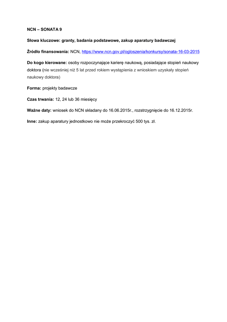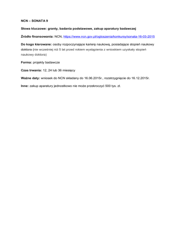 NCN – SONATA 9 Słowa kluczowe: granty, badania podstawowe, zakup aparatury badawczej Źródło finansowania: NCN, https://www.ncn.gov.pl/ogloszenia/konkursy/sonata-16-03-2015 Do kogo kierowane: osoby rozpoczynające karierę naukową, posiadające stopień naukowy doktora (nie wcześniej niż 5 lat przed rokiem wystąpienia z wnioskiem uzyskały stopień naukowy doktora) Forma: projekty badawcze Czas trwania: 12, 24 lub 36 miesięcy Ważne daty: wniosek do NCN składany do 16.06.2015r., rozstrzygnięcie do 16.12.2015r. Inne: zakup aparatury jednostkowo nie może przekroczyć 500 tys. zł.