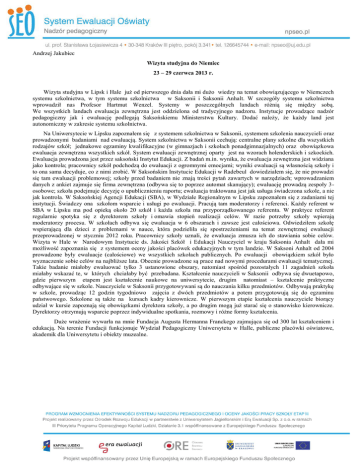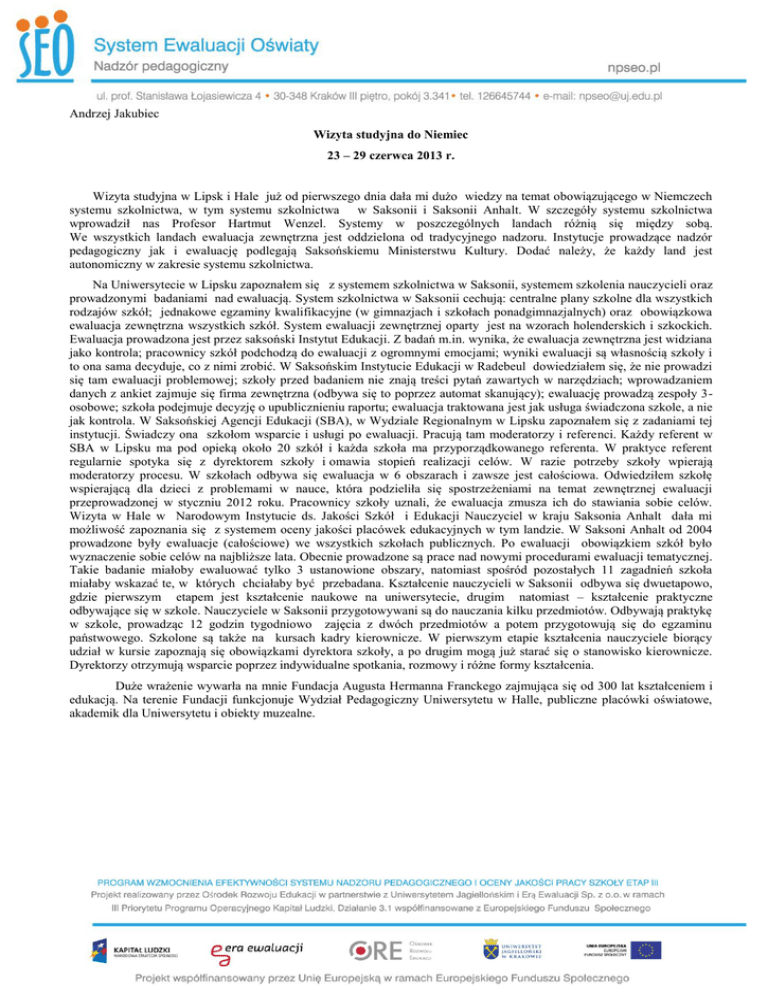 Andrzej Jakubiec Wizyta studyjna do Niemiec 23 – 29 czerwca 2013 r. Wizyta studyjna w Lipsk i Hale już od pierwszego dnia dała mi dużo wiedzy na temat obowiązującego w Niemczech systemu szkolnictwa, w tym systemu szkolnictwa w Saksonii i Saksonii Anhalt. W szczegóły systemu szkolnictwa wprowadził nas Profesor Hartmut Wenzel. Systemy w poszczególnych landach różnią się między sobą. We wszystkich landach ewaluacja zewnętrzna jest oddzielona od tradycyjnego nadzoru. Instytucje prowadzące nadzór pedagogiczny jak i ewaluację podlegają Saksońskiemu Ministerstwu Kultury. Dodać należy, że każdy land jest autonomiczny w zakresie systemu szkolnictwa. Na Uniwersytecie w Lipsku zapoznałem się z systemem szkolnictwa w Saksonii, systemem szkolenia nauczycieli oraz prowadzonymi badaniami nad ewaluacją. System szkolnictwa w Saksonii cechują: centralne plany szkolne dla wszystkich rodzajów szkół; jednakowe egzaminy kwalifikacyjne (w gimnazjach i szkołach ponadgimnazjalnych) oraz obowiązkowa ewaluacja zewnętrzna wszystkich szkół. System ewaluacji zewnętrznej oparty jest na wzorach holenderskich i szkockich. Ewaluacja prowadzona jest przez saksoński Instytut Edukacji. Z badań m.in. wynika, że ewaluacja zewnętrzna jest widziana jako kontrola; pracownicy szkół podchodzą do ewaluacji z ogromnymi emocjami; wyniki ewaluacji są własnością szkoły i to ona sama decyduje, co z nimi zrobić. W Saksońskim Instytucie Edukacji w Radebeul dowiedziałem się, że nie prowadzi się tam ewaluacji problemowej; szkoły przed badaniem nie znają treści pytań zawartych w narzędziach; wprowadzaniem danych z ankiet zajmuje się firma zewnętrzna (odbywa się to poprzez automat skanujący); ewaluację prowadzą zespoły 3osobowe; szkoła podejmuje decyzję o upublicznieniu raportu; ewaluacja traktowana jest jak usługa świadczona szkole, a nie jak kontrola. W Saksońskiej Agencji Edukacji (SBA), w Wydziale Regionalnym w Lipsku zapoznałem się z zadaniami tej instytucji. Świadczy ona szkołom wsparcie i usługi po ewaluacji. Pracują tam moderatorzy i referenci. Każdy referent w SBA w Lipsku ma pod opieką około 20 szkół i każda szkoła ma przyporządkowanego referenta. W praktyce referent regularnie spotyka się z dyrektorem szkoły i omawia stopień realizacji celów. W razie potrzeby szkoły wpierają moderatorzy procesu. W szkołach odbywa się ewaluacja w 6 obszarach i zawsze jest całościowa. Odwiedziłem szkołę wspierającą dla dzieci z problemami w nauce, która podzieliła się spostrzeżeniami na temat zewnętrznej ewaluacji przeprowadzonej w styczniu 2012 roku. Pracownicy szkoły uznali, że ewaluacja zmusza ich do stawiania sobie celów. Wizyta w Hale w Narodowym Instytucie ds. Jakości Szkół i Edukacji Nauczyciel w kraju Saksonia Anhalt dała mi możliwość zapoznania się z systemem oceny jakości placówek edukacyjnych w tym landzie. W Saksoni Anhalt od 2004 prowadzone były ewaluacje (całościowe) we wszystkich szkołach publicznych. Po ewaluacji obowiązkiem szkół było wyznaczenie sobie celów na najbliższe lata. Obecnie prowadzone są prace nad nowymi procedurami ewaluacji tematycznej. Takie badanie miałoby ewaluować tylko 3 ustanowione obszary, natomiast spośród pozostałych 11 zagadnień szkoła miałaby wskazać te, w których chciałaby być przebadana. Kształcenie nauczycieli w Saksonii odbywa się dwuetapowo, gdzie pierwszym etapem jest kształcenie naukowe na uniwersytecie, drugim natomiast – kształcenie praktyczne odbywające się w szkole. Nauczyciele w Saksonii przygotowywani są do nauczania kilku przedmiotów. Odbywają praktykę w szkole, prowadząc 12 godzin tygodniowo zajęcia z dwóch przedmiotów a potem przygotowują się do egzaminu państwowego. Szkolone są także na kursach kadry kierownicze. W pierwszym etapie kształcenia nauczyciele biorący udział w kursie zapoznają się obowiązkami dyrektora szkoły, a po drugim mogą już starać się o stanowisko kierownicze. Dyrektorzy otrzymują wsparcie poprzez indywidualne spotkania, rozmowy i różne formy kształcenia. Duże wrażenie wywarła na mnie Fundacja Augusta Hermanna Franckego zajmująca się od 300 lat kształceniem i edukacją. Na terenie Fundacji funkcjonuje Wydział Pedagogiczny Uniwersytetu w Halle, publiczne placówki oświatowe, akademik dla Uniwersytetu i obiekty muzealne.