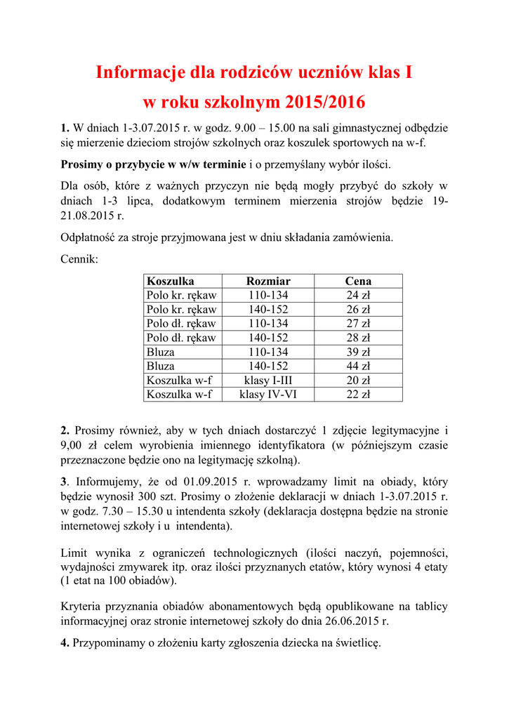 Informacje dla rodziców uczniów klas I w roku szkolnym 2015/2016 1. W dniach 1-3.07.2015 r. w godz. 9.00 – 15.00 na sali gimnastycznej odbędzie się mierzenie dzieciom strojów szkolnych oraz koszulek sportowych na w-f. Prosimy o przybycie w w/w terminie i o przemyślany wybór ilości. Dla osób, które z ważnych przyczyn nie będą mogły przybyć do szkoły w dniach 1-3 lipca, dodatkowym terminem mierzenia strojów będzie 1921.08.2015 r. Odpłatność za stroje przyjmowana jest w dniu składania zamówienia. Cennik: Koszulka Polo kr. rękaw Polo kr. rękaw Polo dł. rękaw Polo dł. rękaw Bluza Bluza Koszulka w-f Koszulka w-f Rozmiar 110-134 140-152 110-134 140-152 110-134 140-152 klasy I-III klasy IV-VI Cena 24 zł 26 zł 27 zł 28 zł 39 zł 44 zł 20 zł 22 zł 2. Prosimy również, aby w tych dniach dostarczyć 1 zdjęcie legitymacyjne i 9,00 zł celem wyrobienia imiennego identyfikatora (w późniejszym czasie przeznaczone będzie ono na legitymację szkolną). 3. Informujemy, że od 01.09.2015 r. wprowadzamy limit na obiady, który będzie wynosił 300 szt. Prosimy o złożenie deklaracji w dniach 1-3.07.2015 r. w godz. 7.30 – 15.30 u intendenta szkoły (deklaracja dostępna będzie na stronie internetowej szkoły i u intendenta). Limit wynika z ograniczeń technologicznych (ilości naczyń, pojemności, wydajności zmywarek itp. oraz ilości przyznanych etatów, który wynosi 4 etaty (1 etat na 100 obiadów). Kryteria przyznania obiadów abonamentowych będą opublikowane na tablicy informacyjnej oraz stronie internetowej szkoły do dnia 26.06.2015 r. 4. Przypominamy o złożeniu karty zgłoszenia dziecka na świetlicę.