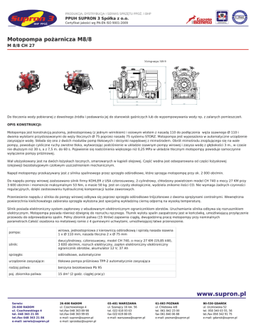 PRODUKCJA, DYSTRYBUCJA I SERWIS SPRZĘTU PPOŻ. I BHP PPUH SUPRON 3 Spółka z o.o. Certyfikat jakości wg PN-EN ISO 9001:2009 Motopompa pożarnicza M8/8 M 8/8 CH 27 Do tłoczenia wody pobieranej z dowolnego źródła i podawania jej do stanowisk gaśniczych lub do wypompowywania wody np. z zalanych pomieszczeń. OPIS KONSTRUKCJI: Motopompa jest konstrukcją poziomą, jednostopniową (z jednym wirnikiem) i osiowym wlotem z nasadą 110 do podłączenia węża ssawnego Ø 110 i dwoma wylotami przystosowanymi do węży tłocznych Ø 75 poprzez nasadę 75 systemu STORZ. Motopompa jest wyposażona w automatyczne urządzenie zasysające wodę. Składa się ono z dwóch modułów pomp tłokowych i skrzynki napędowej z mimośrodem. Obrót mimośrodu znajdującego się na wale pompy, powoduje cykliczne ruchy zwrotne tłoka, wytwarzając podciśnienie w układzie ssawnym pompy wirowej i zasysa wodę z głębokości 3 m., w czasie nie dłuższym niż 30 s, a z 7,5 m. do 60 s. Pojawienie się nadciśnienia większego niż 0,25 MPa w układzie tłocznym motopompy powoduje samoczynne wyłączenie pompy próżniowej. Wał ułożyskowany jest na dwóch łożyskach tocznych, smarowanych w kąpieli olejowej. Część wodna jest odseparowana od części łożyskowej (olejowej) bezobsługowym czołowym uszczelnieniem mechanicznym. Napęd motopompy przekazywany jest z silnika spalinowego przez sprzęgło odśrodkowe, które sprzęga motopompę przy ok. 2 000 obr/min. Do napędu pompy wirowej zastosowano silnik firmy KOHLER z USA czterosuwowy, 2-cylindrowy, chłodzony powietrzem model CH 740 o mocy 27 KM przy 3 600 obr/min i momencie maksymalnym 53 Nm, o masie 50 kg. Jest on czysty ekologicznie, wydziela znikome ilości CO. Nie wymaga żadnych czynności regulacyjnych, dzięki zastosowaniu hydraulicznej kompensacji luzów zaworowych. Przeniesienie napędu z silnika do pompy wirowej odbywa się poprzez sprzęgło odśrodkowe trójczłonowe z dwoma sprężynami centralnymi. Wewnętrzna powierzchnia kielichowatego zabieraka sprzęgła wyłożona jest specjalną wykładziną cierną odporną na wysoką temperaturę. Silnik posiada elektroniczny system zapłonowy z wbudowanym elektronicznym ogranicznikiem obrotów. Uruchamianie silnika odbywa się rozrusznikiem elektrycznym. Motopompa posiada również dźwignię do rozruchu ręcznego. Tłumik wylotu spalin zaopatrzony jest w końcówkę, umożliwiającą przyłączenie przewodu do odprowadzania spalin. Pełny zbiornik paliwa (15 litrów) zapewnia ciągłą, dwugodzinną pracę motopompy przy nominalnych parametrach.Całość osadzona na metalowej ramie z 4 gumowymi uchwytami, umożliwiającej łatwe przenoszenie. pompa: wirowa, jednostopniowa z kierownicą odśrodkową i spiralą nasada ssawna 1 x Ø 110 mm, nasada tłoczna 2 x Ø 75 mm silnik: dwucylindrowy, czterosuwowy, model CH 740, o mocy 27 KM (19,85 kW), 3 600 obr/min, rozruch elektryczny, zapłon elektroniczny elektroniczny ogranicznik obrotów, akumulator 12 V, 37 Ah sprzęgło: odśrodkowe, automatyczne urządzenie zasysające: tłokowa pompa próżniowa TPP-2 automatycznie zasysająca rodzaj paliwa: benzyna bezołowiowa Pb 95 poj. zbiornika paliwa: 15 dm3 (2 godz. ciągłej pracy) www.supron.pl Serwis: 26-600 RADOM ul. Czachowskiego 4 tel. 048 363 21 85 tel./fax 048 363 21 86 e-mail: [email protected] 26-600 RADOM ul. Czachowskiego 4 tel./fax 048 363 89 98 tel./fax 048 363 99 65 e-mail: [email protected] e-mail: [email protected] 03-481 WARSZAWA ul. Szanajcy 16 lok. 56 tel. 022 618 93 63 fax 022 619 80 05 e-mail: [email protected] 61-003 POZNAŃ ul. Chlebowa 4/8 tel. 061 842 23 00 fax 061 840 06 88 e-mail: [email protected] 80-530 GDAŃSK ul. Uczniowska 52 tel. 058 340 03 55, 56 tel./fax 058 342 91 75 e-mail: [email protected] PRODUKCJA, DYSTRYBUCJA I SERWIS SPRZĘTU PPOŻ. I BHP PPUH SUPRON 3 Spółka z o.o. Certyfikat jakości wg PN-EN ISO 9001:2009 rodzaj oleju silnikowego: 10W/30 ilość oleju silnikowego: 1,6 dm3 rodzaj oleju przekładniowego: SGL4 80W90 Hipol ilość oleju przekładniowego: 0,25 dm3 PARAMETRY TECHNICZNE: przy manometrycznej wysokości ssania Hms=1,5 m H2O motopompa osiąga następujące parametry: wydajność: Qn = 800 l/min (48 m3/h) wys. podnoszenia: Hn = 80 m H2O (0,8 MPa) przy manometrycznej wysokości ssania Hms=7,5 m H2O motopompa osiąga następujące parametry: wydajność: Qn = 400 l/min (24 m3/h) wys. podnoszenia: Hn = 100 m H2O (1,0 MPa) www.supron.pl Serwis: 26-600 RADOM ul. Czachowskiego 4 tel. 048 363 21 85 tel./fax 048 363 21 86 e-mail: [email protected] 26-600 RADOM ul. Czachowskiego 4 tel./fax 048 363 89 98 tel./fax 048 363 99 65 e-mail: [email protected] e-mail: [email protected] 03-481 WARSZAWA ul. Szanajcy 16 lok. 56 tel. 022 618 93 63 fax 022 619 80 05 e-mail: [email protected] 61-003 POZNAŃ ul. Chlebowa 4/8 tel. 061 842 23 00 fax 061 840 06 88 e-mail: [email protected] 80-530 GDAŃSK ul. Uczniowska 52 tel. 058 340 03 55, 56 tel./fax 058 342 91 75 e-mail: [email protected]