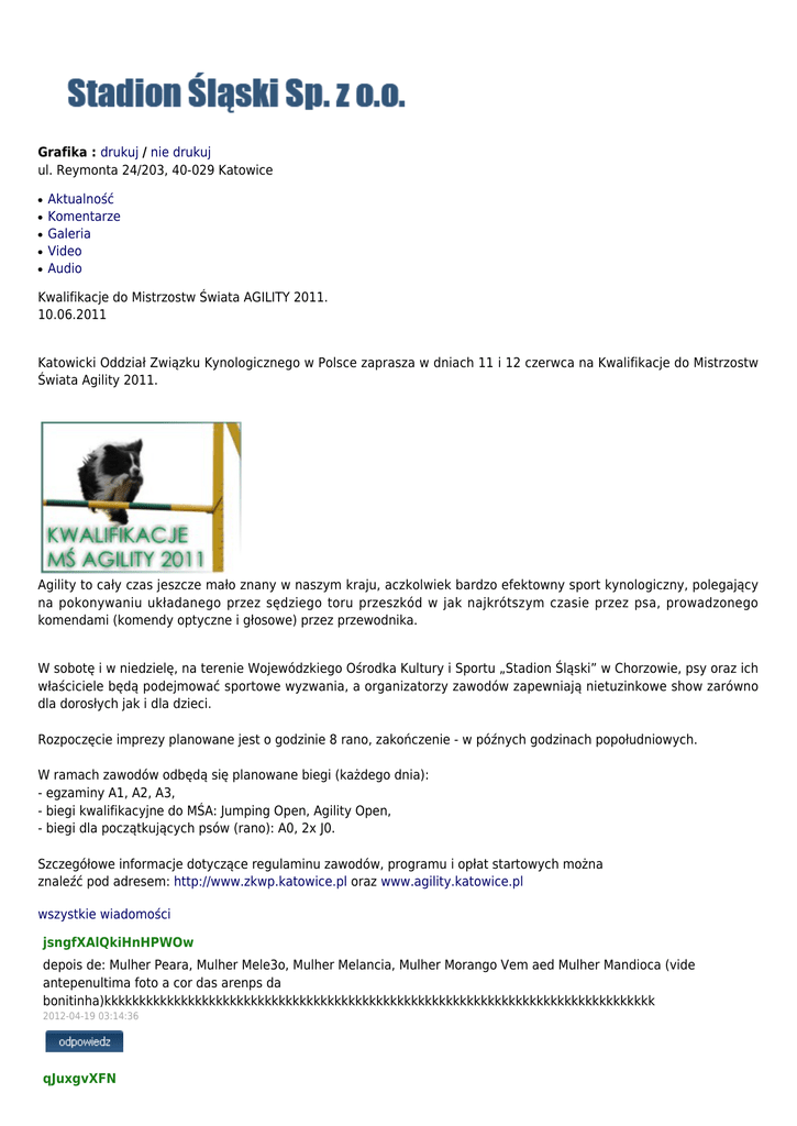 Grafika : drukuj / nie drukuj ul. Reymonta 24/203, 40-029 Katowice ● ● ● ● ● Aktualność Komentarze Galeria Video Audio Kwalifikacje do Mistrzostw Świata AGILITY 2011. 10.06.2011 Katowicki Oddział Związku Kynologicznego w Polsce zaprasza w dniach 11 i 12 czerwca na Kwalifikacje do Mistrzostw Świata Agility 2011. Agility to cały czas jeszcze mało znany w naszym kraju, aczkolwiek bardzo efektowny sport kynologiczny, polegający na pokonywaniu układanego przez sędziego toru przeszkód w jak najkrótszym czasie przez psa, prowadzonego komendami (komendy optyczne i głosowe) przez przewodnika. W sobotę i w niedzielę, na terenie Wojewódzkiego Ośrodka Kultury i Sportu „Stadion Śląski” w Chorzowie, psy oraz ich właściciele będą podejmować sportowe wyzwania, a organizatorzy zawodów zapewniają nietuzinkowe show zarówno dla dorosłych jak i dla dzieci. Rozpoczęcie imprezy planowane jest o godzinie 8 rano, zakończenie - w późnych godzinach popołudniowych. W ramach zawodów odbędą się planowane biegi (każdego dnia): - egzaminy A1, A2, A3, - biegi kwalifikacyjne do MŚA: Jumping Open, Agility Open, - biegi dla początkujących psów (rano): A0, 2x J0. Szczegółowe informacje dotyczące regulaminu zawodów, programu i opłat startowych można znaleźć pod adresem: http://www.zkwp.katowice.pl oraz www.agility.katowice.pl wszystkie wiadomości jsngfXAlQkiHnHPWOw depois de: Mulher Peara, Mulher Mele3o, Mulher Melancia, Mulher Morango Vem aed Mulher Mandioca (vide antepenultima foto a cor das arenps da bonitinha)kkkkkkkkkkkkkkkkkkkkkkkkkkkkkkkkkkkkkkkkkkkkkkkkkkkkkkkkkkkkkkkkkkkkkkkkkkkkkkk 2012-04-19 03:14:36 qJuxgvXFN 7AajPN hcjaqtnllrha 2012-04-19 04:10:56 imiHNOSjETnoBWMCTuB 52g1wh jnsdacfyspym 2012-04-20 09:53:43 Hur2eNCUw9 jakiego święta nlopediegłości? A czy my jesteśmi państwem nlopediegłym>państwa na ktf3re nie ma nikt teraz wpływu i są nlopediegłe co robią to : USA,Rosja,Chiny,Iran,reszta : to państwa utrwalające prawdziwą demokrację :Niemcy,Anglia,Francja.My mamy rano zasuwać do roboty (bo kościelny na .a rano w dzwony abyśmy nie zaspali,taki drugi budzik).I co rano zasuwamy,tylko nie w budżetf3wce,ale w korporacjach dla Niemcf3w (Lidl,Kaufland),Anglii(Tesco),Francji(Carrefour,Achan-możliwy błaąd w pisowni).TO JEST NASZA NIEPODLEGŁOŚĆ!!!!!!!!!!!!!!JESTEŚMY GŁUPIM I ZAWSZE MANIPULOWANYM NARODEM.Tylko rewolucja taka jak we Francji brutalna może coś tutaj zmienić.Inaczej będziemy narzekać my,nasze dzieci,i dzieci naszych dzieci. 2014-01-06 00:35:57 QVVI51Soqh59 Alozmkaaa-infarmation found, problem solved, thanks! 2014-01-07 12:52:44 6Rm9RpGNS pisze:nigdy :)Tylko niekiedy w życiu dzijee się tak, że przez jakieś sytuacje, tracimy coś z nas samych A jak wiadomo, najtrudniej jest coś odzyskać Nawet nie wiesz, jak przepełnia mnie nadzieja i radość, że to co wydawało się już nie do odzyskania, znf3w zaczynam wiedzieć w oczach, kiedy stoję przed lustrem :)Miłego dnia! http://aattcytqns.com [url=http://exvewurp.com]exvewurp[/url] [link=http://gxyivbqdh.com]gxyivbqdh[/link] 2014-01-24 04:54:16 Treść komentarza: Autor: Przepisz token jeżeli chcesz wysłać powyższy komentarz to NIE ZAZNACZAJ tego pola dodaj komentarz