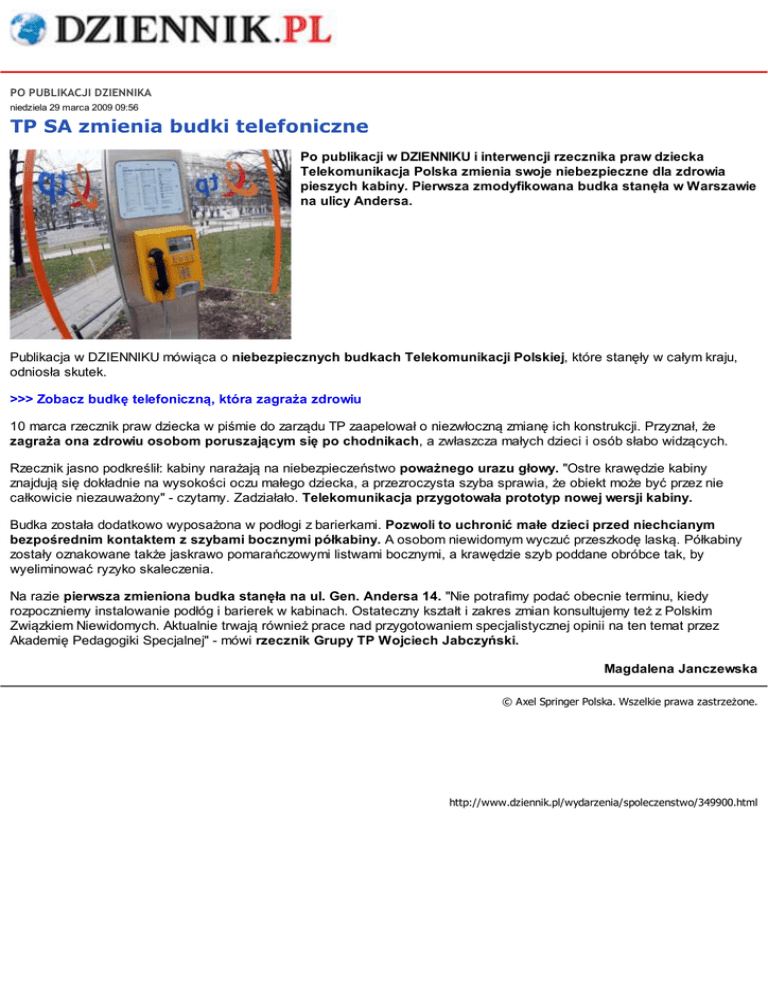 PO PUBLIKACJI DZIENNIKA niedziela 29 marca 2009 09:56 TP SA zmienia budki telefoniczne Po publikacji w DZIENNIKU i interwencji rzecznika praw dziecka Telekomunikacja Polska zmienia swoje niebezpieczne dla zdrowia pieszych kabiny. Pierwsza zmodyfikowana budka stanęła w Warszawie na ulicy Andersa. Publikacja w DZIENNIKU mówiąca o niebezpiecznych budkach Telekomunikacji Polskiej, które stanęły w całym kraju, odniosła skutek. >>> Zobacz budkę telefoniczną, która zagraża zdrowiu 10 marca rzecznik praw dziecka w piśmie do zarządu TP zaapelował o niezwłoczną zmianę ich konstrukcji. Przyznał, że zagraża ona zdrowiu osobom poruszającym się po chodnikach, a zwłaszcza małych dzieci i osób słabo widzących. Rzecznik jasno podkreślił: kabiny narażają na niebezpieczeństwo poważnego urazu głowy. "Ostre krawędzie kabiny znajdują się dokładnie na wysokości oczu małego dziecka, a przezroczysta szyba sprawia, że obiekt może być przez nie całkowicie niezauważony" - czytamy. Zadziałało. Telekomunikacja przygotowała prototyp nowej wersji kabiny. Budka została dodatkowo wyposażona w podłogi z barierkami. Pozwoli to uchronić małe dzieci przed niechcianym bezpośrednim kontaktem z szybami bocznymi półkabiny. A osobom niewidomym wyczuć przeszkodę laską. Półkabiny zostały oznakowane także jaskrawo pomarańczowymi listwami bocznymi, a krawędzie szyb poddane obróbce tak, by wyeliminować ryzyko skaleczenia. Na razie pierwsza zmieniona budka stanęła na ul. Gen. Andersa 14. "Nie potrafimy podać obecnie terminu, kiedy rozpoczniemy instalowanie podłóg i barierek w kabinach. Ostateczny kształt i zakres zmian konsultujemy też z Polskim Związkiem Niewidomych. Aktualnie trwają również prace nad przygotowaniem specjalistycznej opinii na ten temat przez Akademię Pedagogiki Specjalnej" - mówi rzecznik Grupy TP Wojciech Jabczyński. Magdalena Janczewska © Axel Springer Polska. Wszelkie prawa zastrzeżone. http://www.dziennik.pl/wydarzenia/spoleczenstwo/349900.html