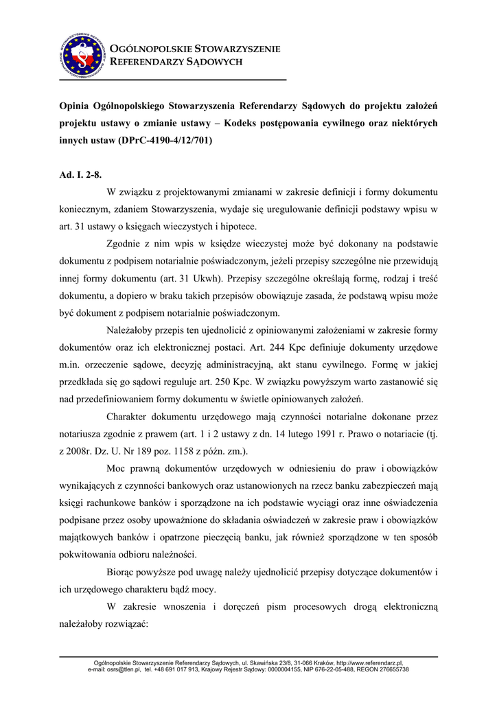 OGÓLNOPOLSKIE STOWARZYSZENIE REFERENDARZY SĄDOWYCH Opinia Ogólnopolskiego Stowarzyszenia Referendarzy Sądowych do projektu załoŜeń projektu ustawy o zmianie ustawy – Kodeks postępowania cywilnego oraz niektórych innych ustaw (DPrC-4190-4/12/701) Ad. I. 2-8. W związku z projektowanymi zmianami w zakresie definicji i formy dokumentu koniecznym, zdaniem Stowarzyszenia, wydaje się uregulowanie definicji podstawy wpisu w art. 31 ustawy o księgach wieczystych i hipotece. Zgodnie z nim wpis w księdze wieczystej moŜe być dokonany na podstawie dokumentu z podpisem notarialnie poświadczonym, jeŜeli przepisy szczególne nie przewidują innej formy dokumentu (art. 31 Ukwh). Przepisy szczególne określają formę, rodzaj i treść dokumentu, a dopiero w braku takich przepisów obowiązuje zasada, Ŝe podstawą wpisu moŜe być dokument z podpisem notarialnie poświadczonym. NaleŜałoby przepis ten ujednolicić z opiniowanymi załoŜeniami w zakresie formy dokumentów oraz ich elektronicznej postaci. Art. 244 Kpc definiuje dokumenty urzędowe m.in. orzeczenie sądowe, decyzję administracyjną, akt stanu cywilnego. Formę w jakiej przedkłada się go sądowi reguluje art. 250 Kpc. W związku powyŜszym warto zastanowić się nad przedefiniowaniem formy dokumentu w świetle opiniowanych załoŜeń. Charakter dokumentu urzędowego mają czynności notarialne dokonane przez notariusza zgodnie z prawem (art. 1 i 2 ustawy z dn. 14 lutego 1991 r. Prawo o notariacie (tj. z 2008r. Dz. U. Nr 189 poz. 1158 z późn. zm.). Moc prawną dokumentów urzędowych w odniesieniu do praw i obowiązków wynikających z czynności bankowych oraz ustanowionych na rzecz banku zabezpieczeń mają księgi rachunkowe banków i sporządzone na ich podstawie wyciągi oraz inne oświadczenia podpisane przez osoby upowaŜnione do składania oświadczeń w zakresie praw i obowiązków majątkowych banków i opatrzone pieczęcią banku, jak równieŜ sporządzone w ten sposób pokwitowania odbioru naleŜności. Biorąc powyŜsze pod uwagę naleŜy ujednolicić przepisy dotyczące dokumentów i ich urzędowego charakteru bądź mocy. W zakresie wnoszenia i doręczeń pism procesowych drogą elektroniczną naleŜałoby rozwiązać: Ogólnopolskie Stowarzyszenie Referendarzy Sądowych, ul. Skawińska 23/8, 31-066 Kraków, http://www.referendarz.pl, e-mail: [email protected], tel. +48 691 017 913, Krajowy Rejestr Sądowy: 0000004155, NIP 676-22-05-488, REGON 276655738 a) kwestię podpisu elektronicznego w pismach wnoszonych przez podmioty w strefie państw Unii Europejskiej i odrębności w przepisach regulujących to zagadnienie oraz b) sposób ich doręczeń. Celowe wydaje się stworzenie bazy danych obejmującej przepisy przynajmniej państw europejskich w zakresie m.in. doręczeń, formy dokumentów, pełnomocnictw, z której mogliby korzystać bezpośrednio orzecznicy bez konieczności zwracania się do Ministra Sprawiedliwości o udostępnienie tekstu prawa obcego, które ma zostać zastosowane przez sąd polski oraz o wyjaśnienie obcej praktyki sądowej. Ad. II. 1. Stowarzyszenie proponuje nie tylko przenieść regulacje o postępowaniach elektronicznych do przepisów ogólnych o procesie, ale takŜe wprowadzić do zwykłego procesu cywilnego te rozwiązania, które sprawdziły się juŜ w postępowaniu elektronicznym, a mogłyby ułatwić pracę sądom i pełnomocnikom. Chodzi tu o zmianę przepisów w duchu postulatów zawartych w opinii PKPP Lewiatan z dnia 6 września 2011 roku (http://pkpplewiatan.pl/opinie/prawo/1/dochodzenie_naleznosci_trwa_zbyt_dlugo). Art. 68 § 1 Kpc nie byłby stosowany nie tylko w przypadku dokonania czynności procesowej w postępowaniu wszczętym drogą elektroniczną, ale i wtedy gdy skład organu osoby prawnej oraz sposób jej reprezentacji są ujawnione w Krajowym Rejestrze Sądowym. Przedstawiciel ustawowy i organy oraz osoby wymienione w art. 67 Kpc miałyby tylko obowiązek wskazać podstawę swojego umocowania. Z kolei pełnomocnik procesowy (art. 89 § 1 Kpc) byłby obowiązany przy pierwszej czynności procesowej powołać się na pełnomocnictwo, wskazując jego datę, zakres, imiona i nazwiska osób, które go udzieliły oraz okoliczności wymienione w art. 87 Kpc. Sąd mógłby w razie wątpliwości zaŜądać oryginału lub urzędowo poświadczonego dokumentu pełnomocnictwa, jak równieŜ dokumentów, z których wynika sposób reprezentacji strony. Przy przekazywaniu sprawy do sądu właściwości ogólnej, sąd ten nie musiałby juŜ w kaŜdym przypadku Ŝądać od powoda wykazania prawidłowego umocowania pełnomocnika, bądź innej osoby składającej pozew w imieniu powoda, ale mógłby Ŝądać odpowiednich dokumentów tylko w razie powzięcia wątpliwości co do prawidłowości umocowania (gdy np. nie wynika ona z akt innych spraw prowadzonych w tym samym sądzie). 2 Ad. II. 4. W pierwszym wraŜeniu propozycja projektu wydaje się być oczywiście słuszna. Nasuwa się jednak pytanie o zapewnienie prawidłowego przebiegu czynności w pomieszczeniach sądu wezwanego, zapobieŜenie ewentualnej ingerencji osób trzecich w przebieg czynności, zachowanie porządku i powagi czynności. Przy aktualnie obowiązujących przepisach PrUSP, obecność referendarza sądowego w siedzibie sądu wezwanego podczas przeprowadzania czynności na odległość jest i tak pozbawiona sensu, gdyŜ referendarz sądowy nie ma uprawnienia do stosowania tzw. policji sesyjnej. Stowarzyszenie proponuje więc ponowną analizę tego punktu projektu, tak aby bądź sąd orzekający bądź sąd wezwany miał realną moŜliwość czuwania nad porządkiem czynności sądowej. Ad. II. 5.a. śądanie umorzenia postępowania na wypadek niepomyślnego przebiegu procesu w toku EPU nie powinno dotyczyć przypadków: a) wniesienia sprzeciwu b) stwierdzenia braku podstaw do rozstrzygnięcia sprawy nakazem. Otworzyłoby to drogę do swoistej zabawy w proces - wielokrotnego ponawiania prób uzyskania p