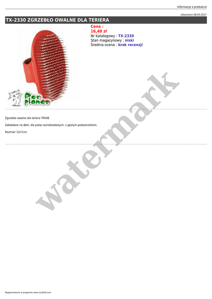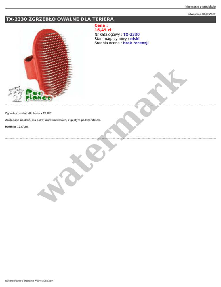 Informacje o produkcie Utworzono 08-03-2017 TX-2330 ZGRZEBŁO OWALNE DLA TERIERA Cena : 16,49 zł Zgrzebło owalne dla teriera TRIXIE er m ar k Nr katalogowy : TX-2330 Stan magazynowy : niski Średnia ocena : brak recenzji Zakładane na dłoń, dla psów szorstkowłosych, z gęstym podszerstkiem. w at Rozmiar 12x7cm. Wygenerowano w programie www.oscGold.com