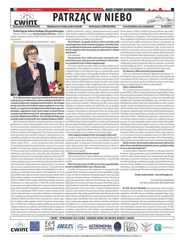 20 01 marca 2016 r. Rozmaitości ASTRONOMICZNE PATRZĄC W NIEBO Wiadomości ze świata nauki i techniki Doniesienia z CERN ESA NASA www.facebook.com/cwintpoland Nr 09/2016 Podróżuję po świecie badając fale grawitacyjne. z układów podwójnych - tak jaj ja - gwiazd neutronowych i czarnych był nie dawno w Polsce i mieliśmy szansę posłuchać jego wykłaWywiad z Panią profesor Dorotą Gondek-Rosińską, członkiem dziur. Wszyscy wspólnie pisaliśmy tę publikację i wspólnie dyskuzespołu naukowców projektu VIRGO-LIGO, który zarejestrował fale towaliśmy co jest istotne, a co nie i jakie mogą być problemy, czy mogła być jakaś np. pomyłka w tym odkryciu. grawitacyjne! Pani Profesor, czy zgodzi się Pani z takim wnioskiem jaki Rozmawia Konrad Stanglewicz, Radio Zachód – część 2. z tego fragmentu naszej rozmowy wyciągam: nie konkurencja, nie rywalizacja ale kooperacja, współpraca jest lepszym sposobem do osiągania celów, do postępu, przyspieszenia w różnych dziedzinach. Jak najbardziej. Przepraszam, ale w takim potocznym rozumieniu właśnie konkurencja, taka sportowa rywalizacja, taka wojskowa rywalizacja to jest właśnie napęd postępu. W naszym wypadku wyraźnie widać, że jednak współpraca jest najważniejsza. Tutaj stykają się naukowcy o różnej mentalności z różnych krajów i to jest duży plus tego, że możemy jakby ugryźć problem z różnej strony. W przypadku detektorów fal grawitacyjnych VIRGO i LIGO od początku było wiadomo, że najpierw amerykańskie dwa detektory LIGO zaczną swoja pracę już w 2015 roku, a detektor VIRGO dołączy się dopiero do nich w tym drugim okresie obserwacyjnym, który nastąpi latem albo na jesieni tego roku. I nie było problemu w decyzjach, że LIGO powinno się wstrzymać, żeby VIRGO do niego dołączył. NIE. My po prostu uważaliśmy, że należy jak najszybciej rozpocząć gdyż celem jest zrozumienie Wszechświata, a nie pokazanie, że to my jesteśmy najlepsi. I to tutaj (K.S.) Rozmawiamy o ogromnej satysfakcji dla ludzi, którzy wyraźnie było to widoczne. Tak więc LIGO rozpoczęło obserwacje. zajmują się przewidywaniem i potem próbują potwierdzić te Udało się złapać sygnał. W krótkim czasie, w ciągu 200 ms widzieswoje przewidywania i znajdują to potwierdzenie. Ale z drugiej liśmy niesamowite zjawisko. Widzieliśmy jak dwie czarne dziury strony może ktoś tak złośliwie zapytać pakujecie w te urzą- okrążają się. Zaobserwowaliśmy 10 cykli kiedy one się okrążyły, dzenia, w te ogromne technologiczne przedsięwzięcia ogromne następnie widzieliśmy sam moment zlewania się czarnych dziur, pieniądze, angażujecie setki, nawet tysiące uczonych którzy a następnie zobaczyliśmy w jaki sposób tworzy się wirująca jedna zajmują się problemami zjawisk zdarzających się w astrono- czarna dziura. Wszyscy jesteśmy tym zafascynowani. I niech Pan micznych odległościach od Ziemi. Czy to kiedyś przełoży się na zauważy, że o tej samej godzinie, tego samego dnia przedstawiciele praktykę taką z korzyścią dla nas, zwykłych zjadaczy chleba? detektorów LIGO w Stanach Zjednoczonych i przedstawicie detek(D.R.) Po pierwsze detektory fal grawitacyjnych nie są drogie w tora VIRGO, który wtedy nie działał i nie działa mieli konferencję porównaniu z innymi eksperymentami, które mamy w tej chwili. prasową i ogłaszali to jako wspólny wynik, bo to był wspólny wynik. To nie jest duży koszt, natomiast korzyści już są w tej chwili. Te I to nie jest istotne, że LIGO to zaobserwowało, istotne jest to, że detektory fal grawitacyjnych to było niesamowite wyzwanie dla przy analizie danych brali udział naukowcy z obydwu grup i to jest różnych rozwiązań technologicznych. Przy budowie tych detek- sukces wszystkich nas i ja uważam, że jest to fascynujące. Jakie mogą być następne kroki, czy następne zdarzenia? torów powstało wiele patentów. Jednym z takich patentów jest Ja sądzę, że kolejnymi zdarzeniami wciąż będą układy podwójwymyślenie metody na to żeby zwierciadła które odbijają wiązkę laserową miały bardzo duży współczynnik odbicia i ten współczynnik ne dwóch czarnych dziur dlatego, że to są najsilniejsze źródła fal odbicie wynosi 99.99…., to jest niesamowicie dobre zwierciadło. grawitacyjnych. Z oszacowań teoretycznych wynika, że raczej te To są największe eksperymenty próżniowe na świecie. To się może czarne dziury powinny być o mniejszych masach niż te które zoprzydać do różnego typu wypraw w kosmos gdzie mamy próżnię. stały zaobserwowane. Mieliśmy wyjątkowe szczęście, że akurat To też są różnego typu materiały które robione są pod kątem tych zdarzył się taki wypadek. Takich mniejszych dziur jest więcej? detektorów, więc tutaj mamy pracę dla wielu inżynierów. Tak naprawdę inżynierowie w naszej grupie badawczej stanowią 70% Takich mniejszych jest więcej, spodziewamy się raczej, że powinzespołu i to jest fantastyczne wyzwanie dla tylu ludzi. Ja myślę, że no być więcej zjawisk zlewania się czarnych dziur o masach rzędu to jest coś praktycznego, że przemysł się rozwija w tym kierunku, że 10 M⊙ Mówi się o tym, że jest to odkrycie na miarę nagrody Nobla, to jest przyszłość. Druga sprawa jest związana z tym, że to nie jest tak, że uczeniu są jakoś przymuszani do pracy. To są ludzie którzy ale jak tu obdzielić Noblem skoro Was jest tylu. Ja myślę, że tutaj nie ma nikt wątpliwości, że tą nagrodę Nobla z wielkim entuzjazmem biorą udział w tych badaniach i to tak naprawdę jest zaszczytem branie udział w tych badaniach. To że my powinni dostać inicjatorzy, wizjonerzy, którzy pokładali nadzieję dokonaliśmy tego odkrycia to jest wieloletnia praca bardzo dużej w tym, że budowa detektorów fal grawitacyjnych tego typu jakie liczby osób ale w jedności, nie w konkurencji. Przykładem jest to, że mamy, ma szansę powodzenia, że b