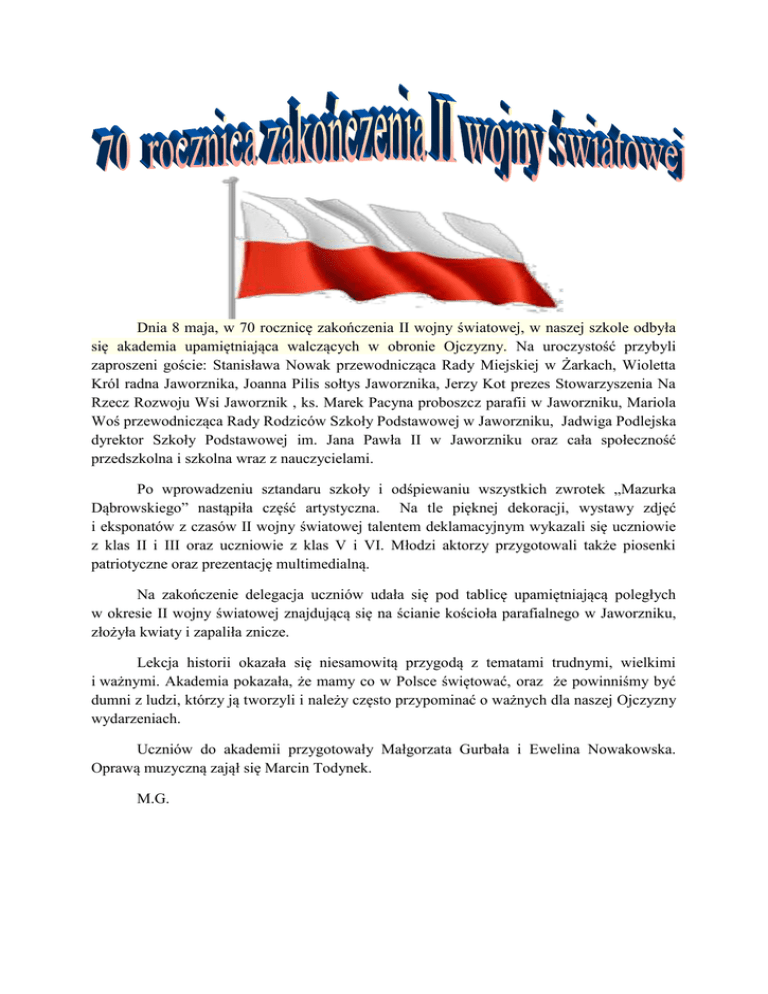Dnia 8 maja, w 70 rocznicę zakończenia II wojny światowej, w naszej szkole odbyła się akademia upamiętniająca walczących w obronie Ojczyzny. Na uroczystość przybyli zaproszeni goście: Stanisława Nowak przewodnicząca Rady Miejskiej w Żarkach, Wioletta Król radna Jaworznika, Joanna Pilis sołtys Jaworznika, Jerzy Kot prezes Stowarzyszenia Na Rzecz Rozwoju Wsi Jaworznik , ks. Marek Pacyna proboszcz parafii w Jaworzniku, Mariola Woś przewodnicząca Rady Rodziców Szkoły Podstawowej w Jaworzniku, Jadwiga Podlejska dyrektor Szkoły Podstawowej im. Jana Pawła II w Jaworzniku oraz cała społeczność przedszkolna i szkolna wraz z nauczycielami. Po wprowadzeniu sztandaru szkoły i odśpiewaniu wszystkich zwrotek „Mazurka Dąbrowskiego” nastąpiła część artystyczna. Na tle pięknej dekoracji, wystawy zdjęć i eksponatów z czasów II wojny światowej talentem deklamacyjnym wykazali się uczniowie z klas II i III oraz uczniowie z klas V i VI. Młodzi aktorzy przygotowali także piosenki patriotyczne oraz prezentację multimedialną. Na zakończenie delegacja uczniów udała się pod tablicę upamiętniającą poległych w okresie II wojny światowej znajdującą się na ścianie kościoła parafialnego w Jaworzniku, złożyła kwiaty i zapaliła znicze. Lekcja historii okazała się niesamowitą przygodą z tematami trudnymi, wielkimi i ważnymi. Akademia pokazała, że mamy co w Polsce świętować, oraz że powinniśmy być dumni z ludzi, którzy ją tworzyli i należy często przypominać o ważnych dla naszej Ojczyzny wydarzeniach. Uczniów do akademii przygotowały Małgorzata Gurbała i Ewelina Nowakowska. Oprawą muzyczną zajął się Marcin Todynek. M.G.