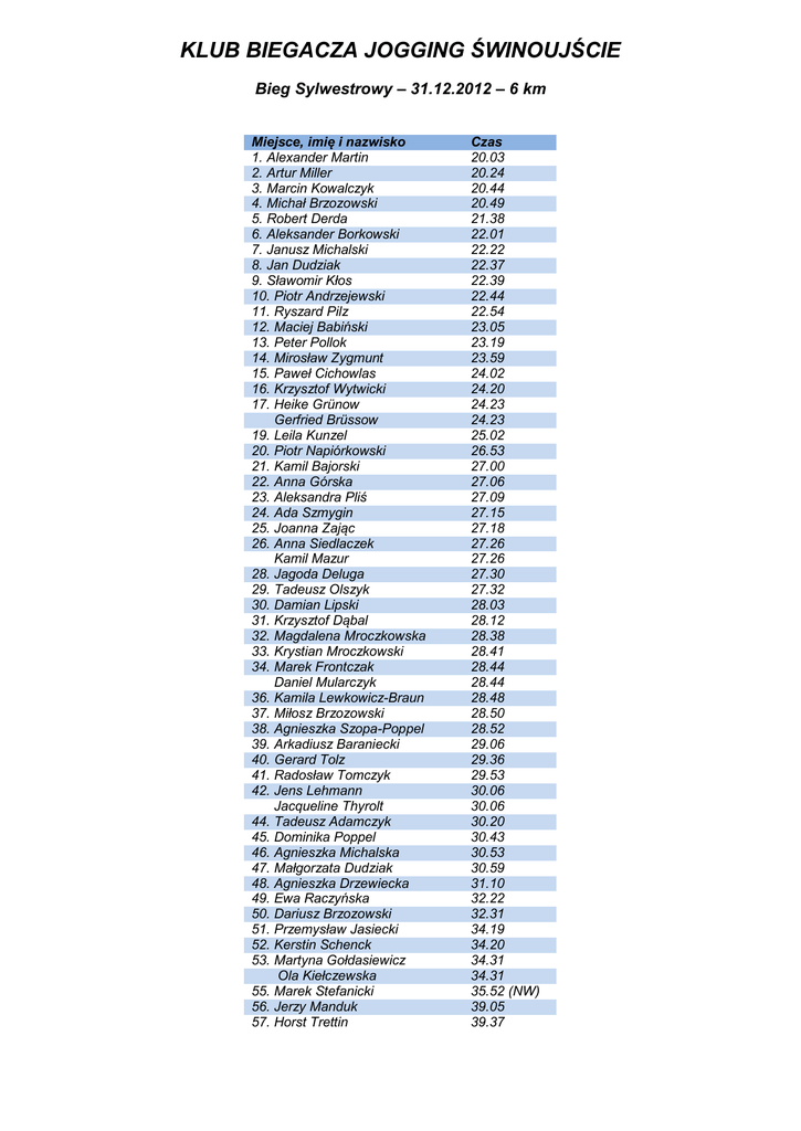 KLUB BIEGACZA JOGGING ŚWINOUJŚCIE Bieg Sylwestrowy – 31.12.2012 – 6 km Miejsce, imię i nazwisko 1. Alexander Martin 2. Artur Miller 3. Marcin Kowalczyk 4. Michał Brzozowski 5. Robert Derda 6. Aleksander Borkowski 7. Janusz Michalski 8. Jan Dudziak 9. Sławomir Kłos 10. Piotr Andrzejewski 11. Ryszard Pilz 12. Maciej Babiński 13. Peter Pollok 14. Mirosław Zygmunt 15. Paweł Cichowlas 16. Krzysztof Wytwicki 17. Heike Grünow Gerfried Brüssow 19. Leila Kunzel 20. Piotr Napiórkowski 21. Kamil Bajorski 22. Anna Górska 23. Aleksandra Pliś 24. Ada Szmygin 25. Joanna Zając 26. Anna Siedlaczek Kamil Mazur 28. Jagoda Deluga 29. Tadeusz Olszyk 30. Damian Lipski 31. Krzysztof Dąbal 32. Magdalena Mroczkowska 33. Krystian Mroczkowski 34. Marek Frontczak Daniel Mularczyk 36. Kamila Lewkowicz-Braun 37. Miłosz Brzozowski 38. Agnieszka Szopa-Poppel 39. Arkadiusz Baraniecki 40. Gerard Tolz 41. Radosław Tomczyk 42. Jens Lehmann Jacqueline Thyrolt 44. Tadeusz Adamczyk 45. Dominika Poppel 46. Agnieszka Michalska 47. Małgorzata Dudziak 48. Agnieszka Drzewiecka 49. Ewa Raczyńska 50. Dariusz Brzozowski 51. Przemysław Jasiecki 52. Kerstin Schenck 53. Martyna Gołdasiewicz Ola Kiełczewska 55. Marek Stefanicki 56. Jerzy Manduk 57. Horst Trettin Czas 20.03 20.24 20.44 20.49 21.38 22.01 22.22 22.37 22.39 22.44 22.54 23.05 23.19 23.59 24.02 24.20 24.23 24.23 25.02 26.53 27.00 27.06 27.09 27.15 27.18 27.26 27.26 27.30 27.32 28.03 28.12 28.38 28.41 28.44 28.44 28.48 28.50 28.52 29.06 29.36 29.53 30.06 30.06 30.20 30.43 30.53 30.59 31.10 32.22 32.31 34.19 34.20 34.31 34.31 35.52 (NW) 39.05 39.37