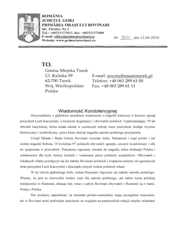 ROMANIA JUDETUL GORJ PRIMARIA ORASULUI ROVINARI Str. Flori/or, Nr.2 Tel.: +402531371011, fax: +402531371004 E-mail: [email protected] Website: www.primariarovinari.ro Nr. 9{~o din 12.04.2010 TO, Gmina Miejska Turek VI. Kaliska 59 E-mail: [email protected] 62-700 Turek Telefon: +48 063 289 61 00 Woj. Wielkopolskie Fax: +48 063 289 61 11 Polska Wiadomosc Kondolencyjnej Otrzyrnalismy z glebokim smutkiem wiadomosc 0 tragedii lotniczej w kt6rym zginal prezydent Lech Kaczynski , z licznymi dygnitarzy i obywateli polskich. Upamietniajacy 70 lat zbrodni katynskiej, kt6ra miala udzial w ceremonii sobote wasz prezydent, dodaje wymiar historyczny i symboliczny, przez kt6re dzisiaj tragedia narodu polskiego przyjaciela. Urzad Miasta i Rada Gminy Rovinari wysylac ludzi , Parlament i rzad polski i zal rodzin tragedii Sobota, 10 kwietnia 97 polskich obywateli zginelo, szczere kondolencje i sile do spojrzenia w przyszlosc. Pokazemy ogromny smutek do tragedii , kt6re dotknely Polska i solidarnosci dla tych, kt6rzy kochali i wspierane przez polskich urzednikow. Obywateli i lokalnych wladz przylaczyl sie do zaloby Rovinari polskich i wsparcia rodziny od ogromnych strat prezydent Lech Kaczynski i dziesiatki innych rodzin polskich wladz W tej chwili glebokiego b6lu , ludzie Rumunii i laczymy sie zaloby narodu polskiego. Wiemy, ze jest to niezwykle trudny czas dla narodu polskiego, ale takze zycia polskiej mniejszosci w Rumunii, dlatego tez, wraz z calym Rovinari obywateli i Rumunii sa z wami , Polacy, Polska. Nie rnozemy zapominac, ze stosunki polsko-rumunskie maja szczeg6lne znaczenie, ale w Rovinari miec podw6jne znaczenie ze wzgledu na partnerskich relacji miedzy miastami i Rovinari Turek. Nasza jest gestem solidarnosci, wsp6lczucia i przyjazni, bo tak Set prawdziwe braci w tak trudnych czasach - Set obok siebie, aby zachecic podtrzyrnujace. Polska plakac z imprezy pod Smolenskiem, ale potepiamy srnierci Lecha Kaczynskiego, jego zona i polskich elit, kt6rzy zgineli w tej plaszczyznie. Szkoda, ze zbrodni katynskiej uczczono smierc prawdopodobnie najbardziej reprezentatywne i urzednikow elity intelektualnej jest Polska. Jest to rana, kt6ra leczy sie trudno, poniewaz Polska bedzie upamietnienia tym samym czasie i tym samym miejscu 0 zniknieciu elity wysokich wyjatkiem polonoze. Na koncu tej wiadomosci ponownie wyrazic nasze uczucie zalu i wsp6lczucia na utrate polskiej delegacji i zapewnic wsparcie potrzebne nam przezwyciezyc te trudne chwile. Nasze szczere kondolencje! Kaczynski Polska kondolencje kondolencje dla rodziny! The Mayor of Rovinari.C Jr. FiliVIhk.inv Q:
