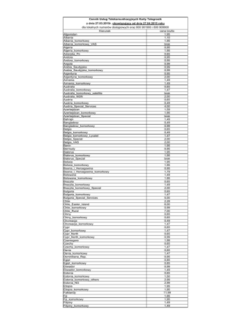 Cennik Usług Telekomunikacyjnych Karty Telegrosik z dnia 27.03.2015r. obowiązujący od dnia 27.04.2015 roku dla lokalnych numerów dostępowych oraz 800 901900 i 800 909900 Kierunek cena brutto Afganistan 1,95 Albania 1,10 Albania_komorkowy 1,95 Albania_komorkowy_VAS brak Algeria 0,95 Algeria_komorkowy 1,95 Ameryka_Pn 0,65 Andora 0,95 Andora_komorkowy 0,95 Angola 0,99 Arabia_Saudyjska 0,99 Arabia_Saudyjska_komorkowy 0,99 Argentyna 0,95 Argentyna_komorkowy 2,00 Armenia 1,49 Armenia_komorkowy 1,49 Australia 0,65 Australia_komorkowy 1,47 Australia_komorkowy_satellite brak Australia_NGN 2,00 Austria 0,65 Austria_komorkowy 0,49 Austria_Special_Services 4,00 Azerbejdzan 1,59 Azerbejdzan_komorkowy 1,95 Azerbejdzan_Special brak Bahrajn 1,49 Bangladesz 0,49 Bangladesz_komorkowy 0,99 Belgia 0,65 Belgia_komorkowy 0,49 Belgia_komorkowy_Lycatel 1,47 Belgia_Special 2,00 Belgia_VAS 2,00 Benin 1,95 Bermudy 0,95 Bialorus 1,95 Bialorus_komorkowy 1,95 Bialorus_Special brak Boliwia 1,95 Boliwia_komorkowy 1,95 Bosnia_i_Hercegowina 0,95 Bosnia_i_Hercegowina_komorkowy 1,79 Botswana 1,49 Botswana_komorkowy 1,95 Brazylia 0,65 Brazylia_komorkowy 1,49 Brazylia_komorkowy_Special 2,00 Bulgaria 0,65 Bulgaria_komorkowy 1,47 Bulgaria_Special_Services 5,00 Chile 2,28 Chile_Easter_Island 6,00 Chile_komorkowy 0,99 Chile_Rural 7,00 Chiny 0,65 Chiny_komorkowy 0,65 Chorwacja 0,49 Chorwacja_komorkowy 1,47 Cypr 0,65 Cypr_komorkowy 1,47 Cypr_North 0,65 Cypr_North_komorkowy 0,99 Czarnogora 1,99 Czechy 0,65 Czechy_komorkowy 1,47 Dania 0,65 Dania_komorkowy 1,47 Dominikana_Rep. 0,95 Egipt 0,85 Egipt_komorkowy 0,85 Ekwador 0,99 Ekwador_komorkowy 1,49 Estonia 0,65 Estonia_komorkowy 1,50 Estonia_komorkowy_others 2,99 Estonia_NG 2,99 Etiopia 1,95 Etiopia_komorkowy 1,95 Falklandy 11,99 Fiji 1,95 Fiji_komorkowy 1,95 Filipiny 1,49 Filipiny_komorkowy 1,49 Finlandia Finlandia_komorkowy Francja Francja_komorkowy Francja_komorkowy_Globalstar Francja_special Ghana Ghana_komorkowy Gibraltar Gibraltar_komorkowy Grecja Grecja_komorkowy Grecja_special Gruzja Gruzja_komorkowy Gruzja_Special Gwadelupa Gwatemala Haiti Hiszpania Hiszpania_komorkowy Hiszpania_special Holandia Holandia_komorkowy Holandia_komorkowy_Lycatel Honduras Hong_Kong Hong_Kong_komorkowy Indie Indie_komorkowy Indonezja Indonezja_komorkowy Indonezja_komorkowy_Satellite Irak Iran Iran_komorkowy Irlandia Irlandia_komorkowy Irlandia_komorkowy_Lycatel Irlandia_special Islandia Islandia_komorkowy Izrael Izrael_komorkowy Izrael_Palestyna Jamajka Japonia Japonia_komorkowy Jemen Jemen_komorkowy Jordania Jordania_komorkowy Kamerun Kamerun_komorkowy Kamerun_Special Kanada Kanada_North_West_Territory Katar Kazachstan Kazachstan_komorkowy Kazachstan_Special Kenia Kenia_komorkowy Kolumbia Kolumbia_komorkowy Komory Kongo Kongo_komorkowy Kongo_Rep_Dem_d.Zair Kongo_Rep_Dem_d.Zair_Special Korea_Poludniowa Korea_Poludniowa_komorkowy Kosowo_komorkowy Kostaryka Kostaryka_komorkowy Kuba Kuwejt Kuwejt_komorkowy Liban Liban_komorkowy Libia Lichtenstein Lichtenstein_komorkowy Lichtenstein_Special Litwa Litwa_komorkowy Litwa_komorkowy_others Litwa_Special Lotwa 0,65 1,47 0,65 0,49 4,00 4,00 1,49 1,49 0,80 1,20 0,65 1,47 3,00 1,09 1,79 6,00 0,95 1,49 1,95 0,65 0,49 4,00 0,65 0,49 1,47 1,95 0,65 0,65 0,65 1,47 0,95 0,95 8,00 1,39 0,95 0,95 0,65 1,47 1,47 2,00 0,65 1,47 0,65 1,47 1,25 1,95 0,65 1,50 0,99 0,99 0,99 0,99 1,95 1,95 8,00 0,65 1,50 1,95 0,95 0,95 6,00 0,99 0,99 0,99 0,99 9,49 2,65 2,65 2,95 10,00 0,65 1,47 2,39 0,95 0,95 4,99 0,95 0,95 1,49 1,49 1,93 0,65 1,50 8,00 0,65 1,47 3,49 3,49 0,65 Lotwa_komorkowy Lotwa_komorkowy_others Lotwa_komorkowy_Telek_Baltija Lotwa_others Lotwa_Special Luksemburg Luksemburg_komorkowy Luksemburg_NAT_access_VOIP Luksemburg_Special Macedonia Macedonia_komorkowy Madagaskar Madagaskar_VAS Malediwy Malezja Malezja_komorkowy Malta Malta_komorkowy Maroko Maroko_komorkowy_GNA Martynika Martynika_komorkowy Mauritius Meksyk Moldawia Moldawia_komorkowy Moldawia_Special Monako Monako_komorkowy Mongolia Namibia Namibia_komorkowy Nepal Nepal_komorkowy Niemcy Niemcy_komorkowy Niemcy_mobile_paging_services Niemcy_special Nigeria Nigeria_komorkowy Norwegia Norwegia_komorkowy Norwegia_special Nowa_Zelandia Nowa_Zelandia_komorkowy Nowa_Zelandia_komorkowy_Scott_Base Oman Pakistan Pakistan_komorkowy Panama Panama_komorkowy Papua_Nowa_Gwinea Papua_Nowa_Gwinea_komorkowy Paragwaj Paragwaj_komorkowy Peru Peru_komorkowy Peru_Rural Polska Polska_komorkowy Polska_P4 Polska_Polkomtel Polska_PTC Polska_PTK_Centertel Portugalia Portugalia_komorkowy Puerto_Rico Rep.Srod.Afrykanska Rep.Srod.Afrykanska_Special Reunion Reunion_komorkowy Rosja Rosja_komorkowy Rosja_komorkowy_Globaltel Rosja_Moskwa Rosja_Petersburg RPA RPA_komorkowy Rumunia Rumunia_komorkowy Rwanda San_Marino San_Marino_Special Senegal Senegal_komorkowy Senegal_Special Serbia Serbia_komorkowy Serbia_Orion 1,47 3,99 3,99 0,65 3,99 0,65 0,49 0,65 4,99 1,19 2,59 4,49 7,00 5,99 0,65 0,99 0,99 1,49 1,95 6,00 0,95 0,95 1,95 0,65 2,19 2,19 5,00 0,65 2,49 0,65 0,95 0,95 0,95 0,95 0,65 0,49 8,00 3,00 1,95 1,95 0,65 1,47 2,00 0,65 1,47 brak 1,95 0,95 0,95 0,99 0,99 3,99 3,99 0,99 0,99 0,99 0,99 3,00 0,19 0,79 0,79 0,79 0,79 0,79 0,65 1,47 0,95 2,90 7,00 0,99 0,99 0,90 0,90 brak 0,65 0,65 0,99 0,99 0,65 1,47 1,95 1,69 8,00 1,95 1,95 brak 0,95 1,99 6,00 Seszele Seszele_komorkowy Seszele_Special Singapur Singapur_komorkowy Slowacja Slowacja_komorkowy Slowenia Slowenia_komorkowy Slowenia_komorkowy_IPKO Sri_Lanka Sri_Lanka_komorkowy Sudan Syria Syria_komorkowy Szwajcaria Szwajcaria_komorkowy Szwajcaria_komorkowy_others Szwajcaria_special Szwecja Szwecja_komorkowy Szwecja_Pager Szwecja_special Tadzykistan Tadzykistan_komorkowy Tadzykistan_PRS Tajlandia Tajlandia_komorkowy Tajlandia_komorkowy_Satellite Tajwan Tajwan_komorkowy Tanzania Togo Togo_interactive_TV Tunezja Tunezja_komorkowy Tunezja_VAS Turcja Turcja_directory_assistance Turcja_komorkowy Turcja_komorkowy_others Turkmenistan Uganda Ukraina Ukraina_komorkowy Urugwaj Urugwaj_komorkowy USA (Stan