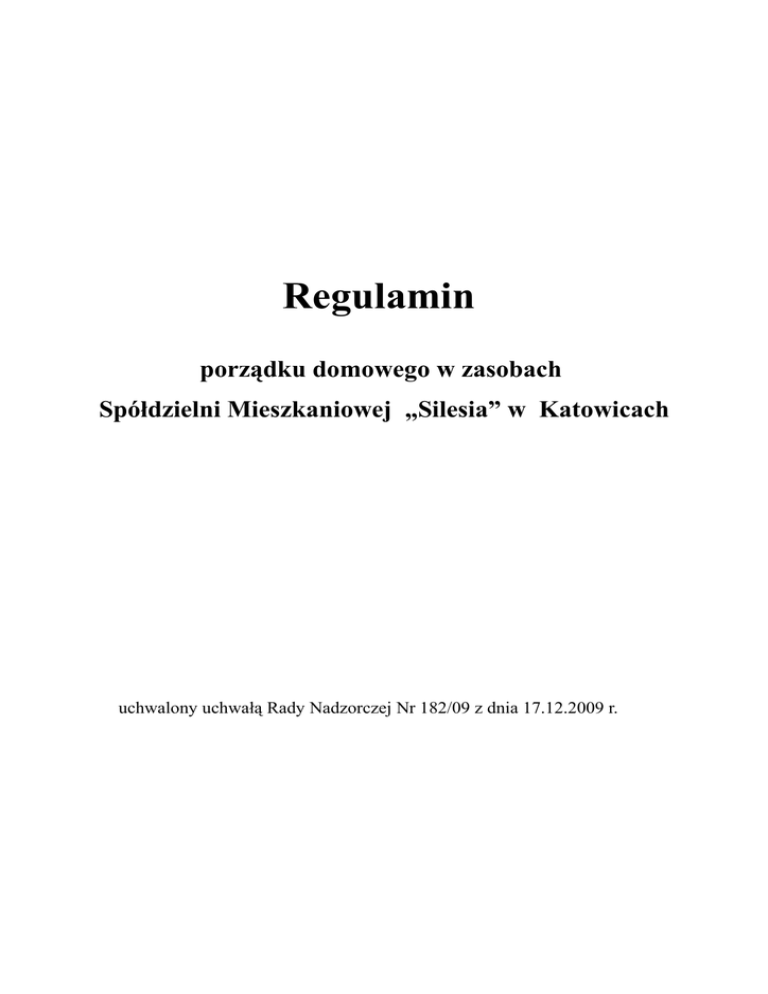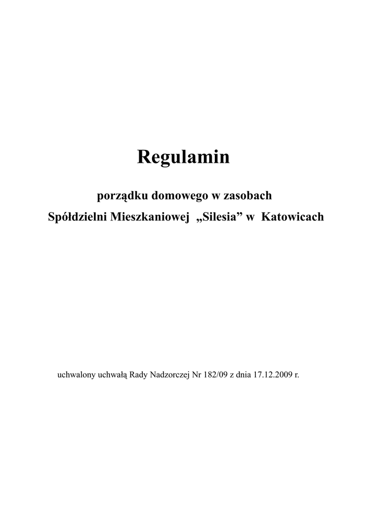Regulamin porządku domowego w zasobach Spółdzielni Mieszkaniowej „Silesia” w Katowicach uchwalony uchwałą Rady Nadzorczej Nr 182/09 z dnia 17.12.2009 r. Postanowienia ogólne. Postanowienia regulaminu obowiązują wszystkie osoby, zwane dalej użytkownikami, przebywające w należących do Spółdzielni budynkach, mieszkaniach i innych lokalach lub ich otoczeniu. §1 1. Do obowiązków Spółdzielni należy wykonywanie prac porządkowo-czystościowych w pomieszczeniach ogólnego użytku, w częściach wspólnych budynków oraz w ich otoczeniu. 2. Spółdzielnia zamieszcza w miejscach widocznych instrukcje przeciwpożarowe, informacje o telefonach alarmowych i inne zapewniające właściwe wykonywanie obowiązków wynikających z niniejszego regulaminu. §2 Użytkownik jest obowiązany do korzystania z lokalu lub nieruchomości zgodnie z ich przeznaczeniem, w zgodzie z dobrymi obyczajami i w sposób nie utrudniający korzystania przez inne osoby. §3 1. Do obowiązku użytkownika należy utrzymanie zajmowanego lokalu w należytym stanie czystości i higieny. 2. Użytkownik wspólne jest obowiązany chronić przed uszkodzeniem lub dewastacją części budynku, jego otoczenie, powierzchnie przeznaczone do wspólnego korzystania oraz dbać o utrzymanie ich w czystości i porządku. 3. Obowiązkiem użytkownika jest zgłoszenie służbom Spółdzielni zauważonych w budynku lub jego otoczeniu awarii, uszkodzeń instalacji i urządzeń lub innych zagrożeń. §4 1. Zabrania się palenia tytoniu na korytarzach budynków, w piwnicach, w pralniach, suszarniach, klatkach schodowych, w kabinach dźwigów oraz na placach zabaw dla dzieci. 2. Bez zgody Spółdzielni zabrania się: a) wchodzenia na dachy budynków -1- b) instalowania jakichkolwiek urządzeń zasilanych w energię elektryczną w piwnicach i pomieszczeniach wspólnego użytku c) zajmowania dla własnych potrzeb pomieszczeń wspólnego użytku d) montowania anten oraz innych urządzeń na balkonach, ścianach i dachach budynków. §5 1. Użytkownik obowiązany jest wywieźć gruz i inne pozostałości po robotach remontowych i modernizacyjnych własnym staraniem i na własny koszt, w sposób uzgodniony z administracją Spółdzielni. 2. Odpady wielkogabarytowe należy wystawiać w terminach i miejscach wskazanych przez administrację Spółdzielni. 3. Do zsypów nie wolno wrzucać przedmiotów, które mogą je uszkodzić lub zapchać. §6 1. Zabrania się przechowywania w piwnicach i innych pomieszczeniach substancji i materiałów niebezpiecznych, łatwopalnych itp. 2. Zabrania się zastawiania przedmiotami, które korytarzy, klatek mogłyby utrudniać schodowych i przejść swobodne poruszanie piwnicznych się drogami ewakuacyjnymi lub pożarowymi oraz sprawne przeprowadzanie akcji służb ratowniczych. 3. Użytkownik obowiązany jest zaznajomić się z instrukcją postępowania na wypadek pożaru i w razie konieczności postępować zgodnie z instrukcją znajdującą się na klatce schodowej. §7 Skrzynki i doniczki na kwiaty należy montować w sposób bezpieczny, uniemożliwiający ich wypadnięcie. §8 1. Cisza nocna obowiązuje między godziną 22.00 a 6.00. 2. Wykonywanie głośnych prac w budynku dopuszczalne jest w godzinach od 8.00 do 19.00 codziennie, z wyłączeniem niedziel i świąt uznanych ustawą za dni wolne od pracy. 3. Trzepanie dywanów, pościeli itp. może odbywać się wyłącznie na trzepakach, -2- w godzinach od 8.00 do 19.00 codziennie, z wyłączeniem niedziel i świąt ustawowo uznanych za dni wolne od pracy. 4. Zabrania się mycia pojazdów mechanicznych na placach lub miejscach postojowych przy budynkach. 5. Parkowanie pojazdów dopuszczalne jest wyłącznie w miejscach do tego przeznaczonych. §9 1. Dopuszcza się trzymanie zwierząt domowych w mieszkaniach pod warunkiem, że nie jest to niebezpieczne i uciążliwe dla mieszkańców. 2. Właściciele zwierząt domowych zobowiązani są do: a) niezwłocznego usuwania zanieczyszczeń i odchodów zwierząt z klatek schodowych, wind i innych pomieszczeń budynków oraz miejsc publicznych b) wyprowadzania psów na smyczach i w kagańcach. 3. Zabrania się wprowadzania psów i innych zwierząt do piaskownic, na wydzielone place zabaw dla dzieci, boiska, kwietniki itp. § 10 1. Zabrania się umieszczania ogłoszeń i informacji poza miejscami do tego celu wyznaczonymi. 2. Wszelkie reklamy i szyldy mogą być instalowane po uprzednim uzyskaniu zgody Spółdzielni. § 11 1. Użytkownik ponosi pełną odpowiedzialność za szkody wynikłe z nieprzestrzegania przez niego niniejszego regulaminu, w tym także za szkody wyrządzone przez jego dzieci i osoby pozostające pod jego opieką oraz zwierzęta. 2. Przypadki nieprzestrzegania regulaminu mogą być podstawą wszczęcia postępowania wewnątrzspółdzielczego o pozbawienie członkostwa lub też kierowane do organów właściwych w sprawach wykroczeń. Regulamin wchodzi w życie z dniem 17.12.2009r. na podstawie uchwały Rady Nadzorczej nr 182/09. -3-