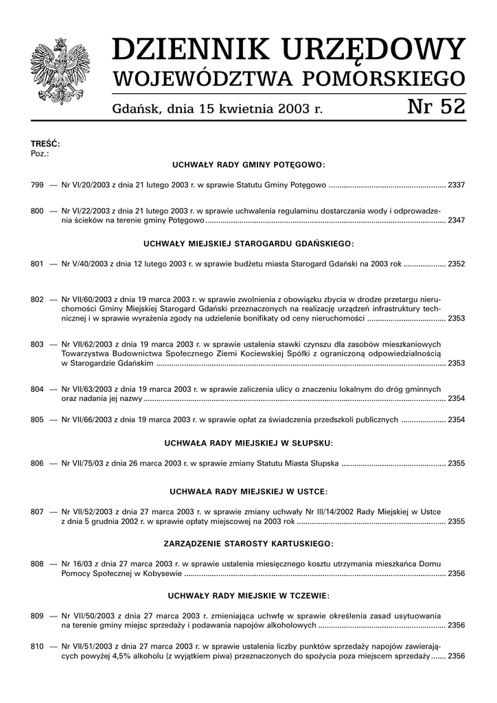 DZIENNIK URZÊDOWY WOJEWÓDZTWA POMORSKIEGO Gdañsk, dnia 15 kwietnia 2003 r. Nr 52 TREÆ: Poz.: UCHWA£Y RADY GMINY POTÊGOWO: 799 Nr VI/20/2003 z dnia 21 lutego 2003 r. w sprawie Statutu Gminy Potêgowo ....................................................... 2337 800 Nr VI/22/2003 z dnia 21 lutego 2003 r. w sprawie uchwalenia regulaminu dostarczania wody i odprowadzenia cieków na terenie gminy Potêgowo ................................................................................................................. 2347 UCHWA£Y MIEJSKIEJ STAROGARDU GDAÑSKIEGO: 801 Nr V/40/2003 z dnia 12 lutego 2003 r. w sprawie bud¿etu miasta Starogard Gdañski na 2003 rok .................... 2352 802 Nr VII/60/2003 z dnia 19 marca 2003 r. w sprawie zwolnienia z obowi¹zku zbycia w drodze przetargu nieruchomoci Gminy Miejskiej Starogard Gdañski przeznaczonych na realizacjê urz¹dzeñ infrastruktury technicznej i w sprawie wyra¿enia zgody na udzielenie bonifikaty od ceny nieruchomoci ..................................... 2353 803 Nr VII/62/2003 z dnia 19 marca 2003 r. w sprawie ustalenia stawki czynszu dla zasobów mieszkaniowych Towarzystwa Budownictwa Spo³ecznego Ziemi Kociewskiej Spó³ki z ograniczon¹ odpowiedzialnoci¹ w Starogardzie Gdañskim ........................................................................................................................................ 2353 804 Nr VII/63/2003 z dnia 19 marca 2003 r. w sprawie zaliczenia ulicy o znaczeniu lokalnym do dróg gminnych oraz nadania jej nazwy .............................................................................................................................................. 2354 805 Nr VII/66/2003 z dnia 19 marca 2003 r. w sprawie op³at za wiadczenia przedszkoli publicznych ..................... 2354 UCHWA£A RADY MIEJSKIEJ W S£UPSKU: 806 Nr VII/75/03 z dnia 26 marca 2003 r. w sprawie zmiany Statutu Miasta S³upska ................................................. 2355 UCHWA£A RADY MIEJSKIEJ W USTCE: 807 Nr VII/52/2003 z dnia 27 marca 2003 r. w sprawie zmiany uchwa³y Nr III/14/2002 Rady Miejskiej w Ustce z dnia 5 grudnia 2002 r. w sprawie op³aty miejscowej na 2003 rok ...................................................................... 2355 ZARZ¥DZENIE STAROSTY KARTUSKIEGO: 808 Nr 16/03 z dnia 27 marca 2003 r. w sprawie ustalenia miesiêcznego kosztu utrzymania mieszkañca Domu Pomocy Spo³ecznej w Kobysewie ........................................................................................................................... 2356 UCHWA£Y RADY MIEJSKIE W TCZEWIE: 809 Nr VII/50/2003 z dnia 27 marca 2003 r. zmieniaj¹ca uchw³ê w sprawie okrelenia zasad usytuowania na terenie gminy miejsc sprzeda¿y i podawania napojów alkoholowych ............................................................ 2356 810 Nr VII/51/2003 z dnia 27 marca 2003 r. w sprawie ustalenia liczby punktów sprzeda¿y napojów zawieraj¹cych powy¿ej 4,5% alkoholu (z wyj¹tkiem piwa) przeznaczonych do spo¿ycia poza miejscem sprzeda¿y ....... 2356 Dziennik Urzêdowy Województwa Pomorskiego 2336 811 Nr VII/47/2003 z dnia 27 marca 2003 r. w sprawie regulaminu targowisk w miecie Tczewie ............................ 2357 812 Nr VII/49/2003 z dnia 27 marca 2003 r. w sprawie ustalenia inkasenta do poboru op³at targowych w miecie Tczewie oraz zasad i terminów ich rozliczania ........................................................................................................ 2358 OBWIESZCZENIE KOMISARZA WYBORCZEGO W S£UPSKU: 813 z dnia 4 kwietnia 2003 r. w sprawie zmian w sk³adzie Rady Powiatu Lêborskiego .............................................. 2359 UCHWA£Y RADY GMINY STʯYCA: 814 Nr II/17/2002 z dnia 13 grudnia 2002 r. w sprawie Wieloletniego Programu Gospodarownia Mieszkaniowym Zasobem Gminy Stê¿yca na lata 2003-2007 ........................................................................................................... 2359 815 Nr II/18/2002 z dni 13 grudnia 2002 r. w sprawie zasad wynajmowania lokli wchodz¹cych w sk³ad mieszkaniowego zsobu gminy .............................................................................................................................................. 2361 UCHWA£Y RADY GMINY SULÊCZYNO: 816 Nr III/30/2002 z dnia 23 grudnia 2002 r. w sprawie Wieloletniego Programu Gospodarownia Mieszkaniowym Zasobem Gminy Sulêczyno na lata 2003 -2007 ...................................................................................................... 2363 817 Nr III/31/2002 z dnia 23 grudnia 2002 r. w sprawie zasad wynajmowania lokali wchodz¹cych w sk³ad mieszkaniowego zasobu gminy ......................................................................................................................................... 2365 818 Nr III/38/2002 z dnia 23 grudnia 2002 r. w sprawie bud¿etu Gminy Sulêczyno na rok 2003 ............................... 2366 UCHWA£Y RADY MIEJSKIEJ W PRABUTACH: 819 Nr IV/19/2002 z dnia 30 grudnia 2002 r. w sprawie miejscowego planu zagospodarowania przestrzennego Rynek-Kociuszki w Prabutach .............................................................................................................................. 2367 820 Nr IV/24/2002 z dnia 30 grudnia 2002 r. w sprawie uchwalenia Statutu Miasta i Gminy Prabuty ....................... 2371 UCHWA£Y RADY GMINY W CHMIELNIE: 821 Nr III/24/2002 z dnia 30 grudnia 2002 r. w sprawie uchwalenia miejscowego planu zagospodarowania przestrzennego dla dzia³ki Nr 144/9, Borzestowo, gmina Chmielno ............................................................................ 2381 822 Nr III/25/2002 z dnia 30 grudnia 2002 r. w sprawie uchwalenia miejscowego planu zagospodarowania przestrzennego dla czêci dzia³ki Nr 218/8,obrêb Zawory, gmina Chmielno ............................................................... 2383 UCHWA£A RADY MIASTA JASTARNIA: 823 Nr XXXIII/335/2001 z dnia 25 wrzenia 2001 r. w sprawie zmiany fragmentu