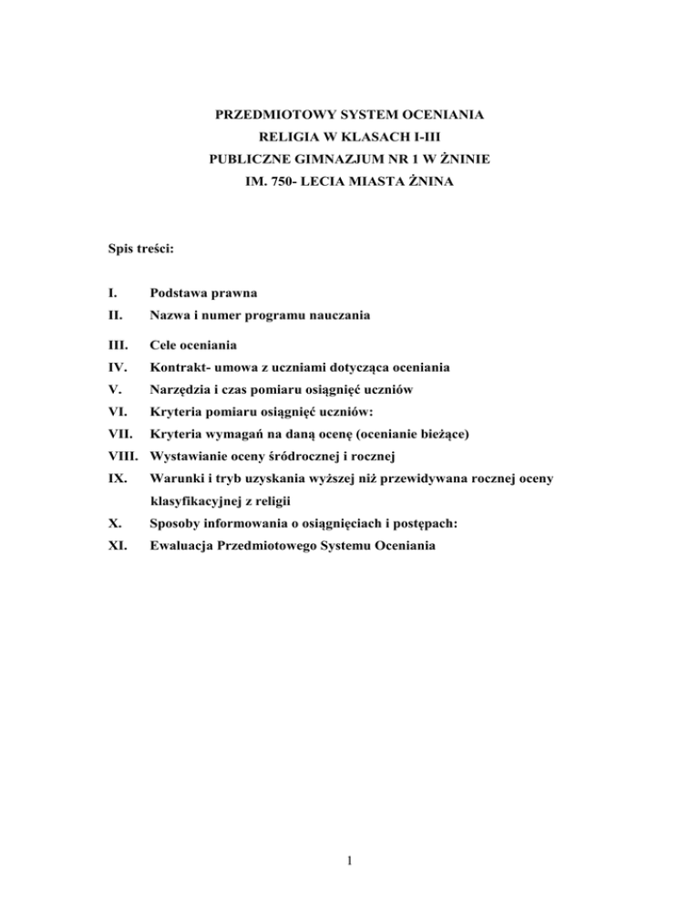 PRZEDMIOTOWY SYSTEM OCENIANIA RELIGIA W KLASACH I-III PUBLICZNE GIMNAZJUM NR 1 W ŻNINIE IM. 750- LECIA MIASTA ŻNINA Spis treści: I. Podstawa prawna II. Nazwa i numer programu nauczania III. Cele oceniania IV. Kontrakt- umowa z uczniami dotycząca oceniania V. Narzędzia i czas pomiaru osiągnięć uczniów VI. Kryteria pomiaru osiągnięć uczniów: VII. Kryteria wymagań na daną ocenę (ocenianie bieżące) VIII. Wystawianie oceny śródrocznej i rocznej IX. Warunki i tryb uzyskania wyższej niż przewidywana rocznej oceny klasyfikacyjnej z religii X. Sposoby informowania o osiągnięciach i postępach: XI. Ewaluacja Przedmiotowego Systemu Oceniania 1 I. Podstawa prawna: Rozporządzenie Ministra Edukacji Narodowej z 30 maja 2014 r. w sprawie podstawy programowej wychowania przedszkolnego oraz kształcenia ogólnego w poszczególnych typach szkół (Dz. U. poz. 803), Dz.U. 2015 poz. 843. Rozporządzenie Ministra Edukacji Narodowej z dnia 10 czerwca 2015 r. w sprawie szczegółowych warunków i sposobu oceniania, klasyfikowania i promowania uczniów i słuchaczy w szkołach publicznych (Dz.U. 2015 poz. 843 ). Dyrektorium Kościoła katolickiego w Polsce z 20. 06. 2001r. II. Nazwa i numer programu nauczania 1. Ocenianie osiągnięć edukacyjnych ucznia z religii polega na rozpoznawaniu przez nauczyciela poziomu i postępów w opanowaniu przez ucznia wiadomości i umiejętności w stosunku do wymagań edukacyjnych wynikających z „Podstawy programowej katechezy Kościoła katolickiego w Polsce” oraz realizowanego przez nauczyciela programu nauczania „Pójść za Jezusem Chrystusem” AZ-3-01/10, uwzględniającego tę Podstawę. 2. Obowiązujące podręczniki: Klasa I – Spotkanie ze Słowem – Podręcznik do nauki religii dla I klasy gimnazjum, pod red. Ks. Jana Szpeta i Danuty Jackowiak, wyd. Święty Wojciech Klasa II – Aby nie ustać w drodze – Podręcznik do nauki religii dla II klasy gimnazjum, pod red. Ks. Jana Szpeta i Danuty Jackowiak, wyd. Święty Wojciech Klasa III – Żyć w miłości Boga – Podręcznik do nauki religii dla III klasy gimnazjum, pod red. Ks. Jana Szpeta i Danuty Jackowiak, wyd. Św. Wojciech, III.Cele oceniania: Informowanie ucznia o poziomie jego osiągnięć edukacyjnych oraz o jego postępach w tym zakresie; Motywowanie ucznia do czynienia postępów; Dostarczanie rodzicom (prawnym opiekunom) ucznia, nauczycielom i wychowawcy informacji o postępach, trudnościach w nauce oraz specjalnych uzdolnieniach ucznia; Udzielanie uczniowi pomocy w samodzielnym planowaniu własnego rozwoju; Umożliwienie nauczycielowi doskonalenia organizacji i metod pracy dydaktycznej. Kontrola i ocena z religii nie dotyczy wyłącznie sprawdzenia wiadomości lecz także wartościowania umiejętności, postawy, zdolności twórczych, rozwoju zainteresowań, motywacji uczenia się, a głównie kształtowania cech charakteru, woli, odpowiedzialności za swoje czyny, dokładności, wytrwałości, pracowitości, kultury osobistej, zgodności postępowania z przyjętą wiarą. IV. Umowa- kontrakt z uczniami dotyczący oceniania: 1. Sposoby informowania uczniów o wymaganiach: ustnie – cały PSO – na pierwszej lekcji w każdej klasie, w danym roku szkolnym ustnie – na poszczególne stopnie szkolne z danego działu programowego przed rozpoczęciem jego realizacji wymagania zawierają również przykłady pytań, zadań i problemów z poszczególnych poziomów. ocenianiu nie podlegają praktyki religijne. 2. Sposoby poprawiania ocen: 2 Uczeń może poprawić ocenę niekorzystną uzyskaną ze sprawdzianu lub testu w ciągu dwóch tygodni od rozdania prac, a ocena z poprawy jest oceną ostateczną wpisaną obok oceny pierwotnej Poprawa pracy pisemnej jest tak samo punktowana jak pierwotna W przypadku uzyskania niższej oceny pozostaje ocena ze sprawdzianu pierwotnego Niestawienie się ucznia na poprawę w uzgodnionym terminie jest równoznaczne z otrzymaniem oceny niedostatecznej 1. Nie można prac pisemnych poprawiać ustnie 6. Jeżeli z przyczyn losowych uczeń nie może napisać sprawdzianu lub testu w określonym terminie wówczas ma obowiązek uczynić to na najbliższej lekcji lub terminie ustalonym z nauczycielem 7. Na koniec semestru nie przewiduje się końcowego sprawdzianu lub testu zaliczeniowego 8. Oceny śródroczne i roczne wystawia się na siedem dni przed planowanym posiedzeniem rady pedagogicznej 9. Na miesiąc przed rocznym klasyfikacyjnym posiedzeniem Rady Pedagogicznej katecheta zobowiązany jest wpisać do dziennika i poinformować ucznia i jego rodziców, opiekunów prawnych o przewidywanej dla niego ocenie klasyfikacyjnej z religii i możliwości poprawienia oceny w terminie wyznaczonym przez nauczyciela 10. Na prośbę ucznia lub jego rodziców (prawnych opiekunów) katecheta ustalający ocenę uzasadnia ją uwzględniając wymagania zawarte w przedmiotowym systemie oceniania z religii. 11. Uczeń może jeden raz w semestrze zgłosić nieprzygotowanie do lekcji bez podania przyczyny ( nie dotyczy zapowiedzianych sprawdzianów) 12. Prowadzenie zeszytu przedmiotowego jest obowiązkowe. W przypadku nieobecności na lekcji, uczeń ma obowiązek uzupełnić notatki w zeszycie i wykonać pracę domową 13. Uczeń może jeden raz w semestrze zgłosić nieodrobienie pracy domowej, bez podania przyczyny 14. Uczeń nie ponosi żadnych konsekwencji w przypadku wystąpienia poważnych przyczyn losowych, które przeszkodziły w przygotowaniu się ucznia do lekcji, jeżeli są one potwierdzone pisemnie lub ustnie przez rodzica (prawnego opiekuna) przed lekcją. 15. w ciągu jednego semestru wystawia się każdemu uczniowi co najmniej trzy oceny cząstkowe; 16. Kryteria odpowiadające poszczególnym śródrocznym i rocznym stopniom szkolnym zgodne są z Wewnątrzszkolnym Systemem Oceniania. 17. Uczeń może być nieklasyfikowany z religii jeżeli brak jest podstaw do ustalenia oceny klasyfikacyjnej z powodu jego nieobecności na zajęciach edukacyjnych przekra