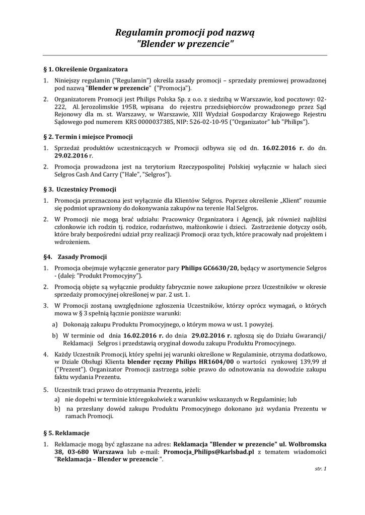 1. Reklamacje mogą być zgłaszane na adres: Reklamacja "Blender w prezencie" ul. Wolbromska