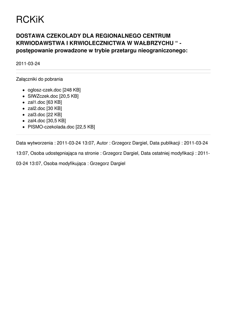RCKiK DOSTAWA CZEKOLADY DLA REGIONALNEGO CENTRUM KRWIODAWSTWA I KRWIOLECZNICTWA W WAŁBRZYCHU “ postępowanie prowadzone w trybie przetargu nieograniczonego: 2011-03-24 Załączniki do pobrania oglosz-czek.doc [248 KB] SIWZczek.doc [20,5 KB] zal1.doc [63 KB] zal2.doc [30 KB] zal3.doc [22 KB] zal4.doc [30,5 KB] PISMO-czekolada.doc [22,5 KB] Data wytworzenia : 2011-03-24 13:07, Autor : Grzegorz Dargiel, Data publikacji : 2011-03-24 13:07, Osoba udostępniająca na stronie : Grzegorz Dargiel, Data ostatniej modyfikacji : 201103-24 13:07, Osoba modyfikująca : Grzegorz Dargiel