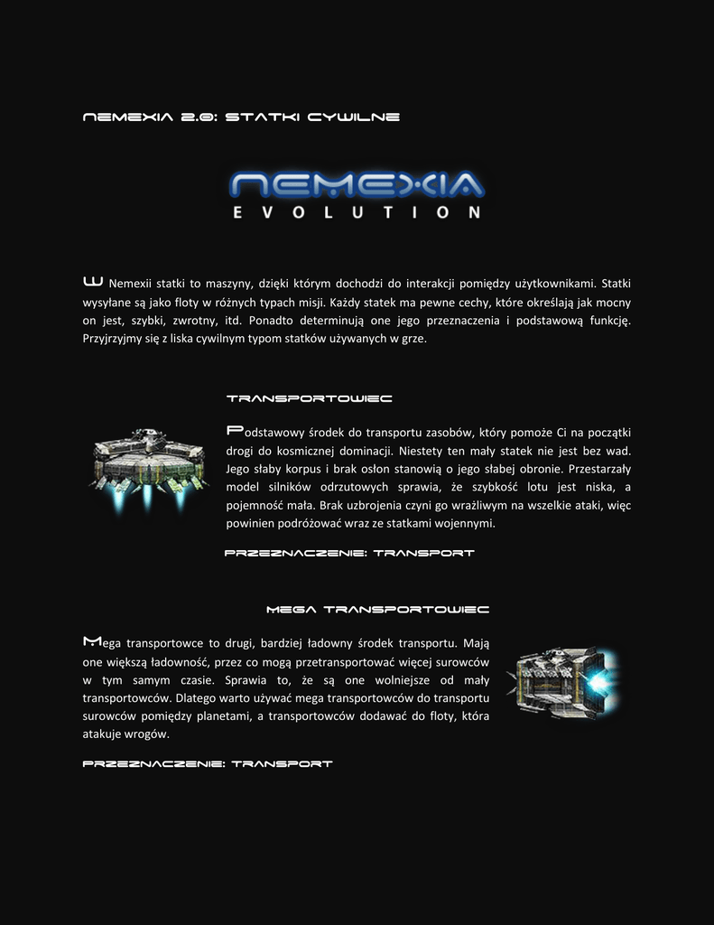 Nemexia 2.0: Statki cywilne W Nemexii statki to maszyny, dzięki którym dochodzi do interakcji pomiędzy użytkownikami. Statki wysyłane są jako floty w różnych typach misji. Każdy statek ma pewne cechy, które określają jak mocny on jest, szybki, zwrotny, itd. Ponadto determinują one jego przeznaczenia i podstawową funkcję. Przyjrzyjmy się z liska cywilnym typom statków używanych w grze. Transportowiec Podstawowy środek do transportu zasobów, który pomoże Ci na początki drogi do kosmicznej dominacji. Niestety ten mały statek nie jest bez wad. Jego słaby korpus i brak osłon stanowią o jego słabej obronie. Przestarzały model silników odrzutowych sprawia, że szybkość lotu jest niska, a pojemność mała. Brak uzbrojenia czyni go wrażliwym na wszelkie ataki, więc powinien podróżować wraz ze statkami wojennymi. Przeznaczenie: Transport Mega transportowiec Mega transportowce to drugi, bardziej ładowny środek transportu. Mają one większą ładowność, przez co mogą przetransportować więcej surowców w tym samym czasie. Sprawia to, że są one wolniejsze od mały transportowców. Dlatego warto używać mega transportowców do transportu surowców pomiędzy planetami, a transportowców dodawać do floty, która atakuje wrogów. Przeznaczenie: Transport Recycler Praktycznie rzecz biorąc ten statek składa się z ogromnego systemu recyklingu i wielkiej ładowni. Po bitwie ze statków zostaje dużo zniszczonych szczątek, które recykler gromadzi. Niestety ten statek nie jest w stanie rozwinąć dużej prędkości, gdyż nie ma silników dużej mocy, bo miejsce na nie zajmuje system odzyskiwania szczątek i magazyn. Wszystkie statki mogą otrzymać premię z badań na prędkością, siłą oraz obroną. Przeznaczenia: Asteroeksploracja Odzysk, Kolonizator To ogromny statek kolonizacyjny, który przewozi niezbędny sprzęt i personel potrzebny do budowy nowej kolonii. Może on transportować małe ilości surowców. Po wylądowaniu na wybranej planecie, wielki kadłub statku zostaje przebudowany w centrum dowodzenia nową kolonią. Ze względu na olbrzymie rozmiary, statek ten jest bardzo wolny. Ponadto jest słabo uzbrojony. Przeznaczenie: Kolonizacja Sonda szpiegowska Mały bezzałogowy statek zbudowany do rozpoznania planet wroga. Budowa statki jest bardzo prosta, a miejsca w nim starcza tylko na sprzęt szpiegowski i silniki jonowe wysokiej mocy. Dzięki temu statek jest zdolny do małych skoków w hiperprzestrzeń i osiągania niewiarygodnych prędkości. Jednostka zbudowana jest ze specjalnego stopu kryształu. Przeznaczenie: Szpiegowanie