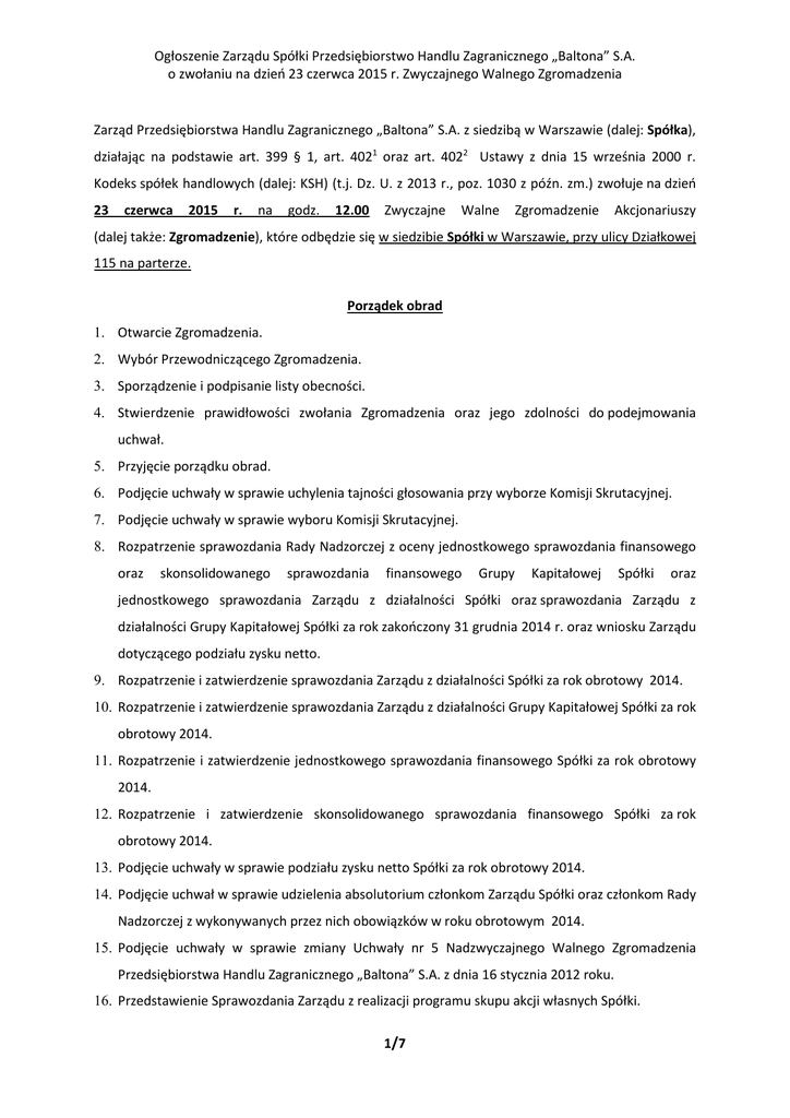 Ogłoszenie Zarządu Spółki Przedsiębiorstwo Handlu Zagranicznego „Baltona” S.A. o zwołaniu na dzień 23 czerwca 2015 r. Zwyczajnego Walnego Zgromadzenia Zarząd Przedsiębiorstwa Handlu Zagranicznego „Baltona” S.A. z siedzibą w Warszawie (dalej: Spółka), działając na podstawie art. 399 § 1, art. 4021 oraz art. 4022 Ustawy z dnia 15 września 2000 r. Kodeks spółek handlowych (dalej: KSH) (t.j. Dz. U. z 2013 r., poz. 1030 z późn. zm.) zwołuje na dzień 23 czerwca 2015 r. na godz. 12.00 Zwyczajne Walne Zgromadzenie Akcjonariuszy (dalej także: Zgromadzenie), które odbędzie się w siedzibie Spółki w Warszawie, przy ulicy Działkowej 115 na parterze. Porządek obrad 1. Otwarcie Zgromadzenia. 2. Wybór Przewodniczącego Zgromadzenia. 3. Sporządzenie i podpisanie listy obecności. 4. Stwierdzenie prawidłowości zwołania Zgromadzenia oraz jego zdolności do podejmowania uchwał. 5. Przyjęcie porządku obrad. 6. Podjęcie uchwały w sprawie uchylenia tajności głosowania przy wyborze Komisji Skrutacyjnej. 7. Podjęcie uchwały w sprawie wyboru Komisji Skrutacyjnej. 8. Rozpatrzenie sprawozdania Rady Nadzorczej z oceny jednostkowego sprawozdania finansowego oraz skonsolidowanego sprawozdania finansowego Grupy Kapitałowej Spółki oraz jednostkowego sprawozdania Zarządu z działalności Spółki oraz sprawozdania Zarządu z działalności Grupy Kapitałowej Spółki za rok zakończony 31 grudnia 2014 r. oraz wniosku Zarządu dotyczącego podziału zysku netto. 9. Rozpatrzenie i zatwierdzenie sprawozdania Zarządu z działalności Spółki za rok obrotowy 2014. 10. Rozpatrzenie i zatwierdzenie sprawozdania Zarządu z działalności Grupy Kapitałowej Spółki za rok obrotowy 2014. 11. Rozpatrzenie i zatwierdzenie jednostkowego sprawozdania finansowego Spółki za rok obrotowy 2014. 12. Rozpatrzenie i zatwierdzenie skonsolidowanego sprawozdania finansowego Spółki za rok obrotowy 2014. 13. Podjęcie uchwały w sprawie podziału zysku netto Spółki za rok obrotowy 2014. 14. Podjęcie uchwał w sprawie udzielenia absolutorium członkom Zarządu Spółki oraz członkom Rady Nadzorczej z wykonywanych przez nich obowiązków w roku obrotowym 2014. 15. Podjęcie uchwały w sprawie zmiany Uchwały nr 5 Nadzwyczajnego Walnego Zgromadzenia Przedsiębiorstwa Handlu Zagranicznego „Baltona” S.A. z dnia 16 stycznia 2012 roku. 16. Przedstawienie Sprawozdania Zarządu z realizacji programu skupu akcji własnych Spółki. 1 /7 Ogłoszenie Zarządu Spółki Przedsiębiorstwo Handlu Zagranicznego „Baltona” S.A. o zwołaniu na dzień 23 czerwca 2015 r. Zwyczajnego Walnego Zgromadzenia 17. Zamknięcie obrad Zgromadzenia. Informacje dla Akcjonariuszy Prawo Akcjonariusza do żądania umieszczenia określonych spraw w porządku obrad Zgromadzenia Akcjonariusz lub Akcjonariusze, reprezentujący co najmniej jedną dwudziestą kapitału zakładowego, mogą żądać umieszczenia określonych spraw w porządku obrad Zgromadzenia. Żądanie powinno zostać zgłoszone Zarządowi nie później niż na 21 dni przed wyznaczonym terminem Zgromadzenia, czyli do dnia 2 czerwca 2015 r. Żądanie powinno zawierać uzasadnienie lub projekt uchwały dotyczącej proponowanego punktu porządku obrad. Żądanie może zostać złożone na piśmie lub w postaci elektronicznej. Zgłaszający żądanie powinni wykazać posiadanie odpowiedniej liczby akcji na dzień jego złożenia, załączając świadectwo depozytowe lub zaświadczenie o prawie uczestnictwa w Zgromadzeniu, a w przypadku zgłaszających żądanie, niebędących osobami fizycznymi także potwierdzić uprawnienie do reprezentowania tego podmiotu, załączając aktualny odpis z właściwego rejestru. Obowiązek dołączenia świadectwa depozytowego lub zaświadczenia o prawie uczestnictwa w Zgromadzeniu nie dotyczy uprawnionych z akcji imiennych. Prawo Akcjonariuszy do zgłaszania projektów uchwał dotyczących spraw wprowadzonych do porządku obrad Zgromadzenia lub spraw, które moją zostać wprowadzone do porządku obrad przed terminem Zgromadzenia Akcjonariusz lub Akcjonariusze reprezentujący co najmniej jedną dwudziestą kapitału zakładowego mogą przed terminem Zgromadzenia zgłaszać Spółce na piśmie, lub z wykorzystaniem środków komunikacji elektronicznej, projekty uchwał dotyczące spraw wprowadzonych do porządku obrad Zgromadzenia lub spraw, które mają zostać wprowadzone do porządku obrad. Zgłaszający żądanie powinni wykazać posiadanie odpowiedniej liczby akcji na dzień zgłoszenia projektów uchwał, załączając do żądania świadectwo depozytowe lub zaświadczenie o prawie uczestnictwa w Zgromadzeniu, a w przypadku zgłaszających żądanie, niebędących osobami fizycznymi, potwierdzić również uprawnienie do reprezentowania tego podmiotu, załączając aktualny odpis z właściwego rejestru. Obowiązek dołączenia świadectwa depozytowego lub zaświadczenia o prawie uczestnictwa w Zgromadzeniu nie dotyczy uprawnionych z akcji imiennych. 2 /7 Ogłoszenie Zarządu Spółki Przedsiębiorstwo Handlu Zagranicznego „Baltona” S.A. o zwołaniu na dzień 23 czerwca 2015 r. Zwyczajnego Walnego Zgromadzenia Prawo Akcjonariuszy do zgłaszania projektów uchwał dotyczących spraw wprowadzonych do porządku obrad podczas Zgromadzenia Każdy Akcjonariusz może podczas Zgromadzenia zgłaszać projekty uchwał dotyczące spraw wprowadzonych do porządku obrad. Sposób wykonywania prawa głosu przez pełnomocnika, formularze stosowane podczas głosowania przez pełnomocnika, sposób zawiadamiania Spółki przy wykorzystaniu środków komunikacji elektronicznej o ustanowieniu Pełnomocnika Akcjonariusz będący osobą fizyczną może uczestniczyć w Zgromadzeniu i wykonywać prawo głosu osobiście lub przez Pełnomocnika. Akcjonariusz niebędący osobą fizyczną może uczestniczyć w Zgromadzeniu oraz wykonywać prawo głosu przez osobę/osoby uprawnione do składania oświadczeń woli w jego imieniu lub przez