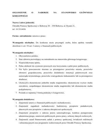 OGŁOSZENIE O NABORZE NA STANOWISKO GŁÓWNEGO KSIĘGOWEGO Nazwa i adres jednostki. Ośrodek Pomocy Społecznej w Bobowej 38 – 350 Bobowa, ul. Rynek 21, tel. 18 3514456 Forma zatrudnienia: umowa o prace. Wymagania niezbędne. Do konkursu może przystąpić osoba, która spełnia warunki określone w art. 54 ust. 2 ustawy o finansach publicznych. Wymagania niezbędne: 1. Obywatelstwo polskie, 2. Stan zdrowia pozwalający na zatrudnienie na stanowisku głównego księgowego, 3. Nieposzlakowana opinia, 4. Pełna zdolność do czynności prawnych oraz korzystania z pełni praw publicznych, 5. Nie był/a prawomocnie skazana za przestępstwo przeciwko mieniu, przeciwko obrotowi gospodarczemu, przeciwko działalności instytucji państwowych oraz samorządu terytorialnego, przeciwko wiarygodności dokumentów lub za przestępstwo skarbowe. 6. Ukończył/a ekonomiczne jednolite studia magisterskie, ekonomiczne wyższe studia zawodowe, uzupełniające ekonomiczne studia magisterskie lub ekonomiczne studia podyplomowe, 7. Posiada co najmniej 3-letnią praktykę w księgowości, Wymagania dodatkowe: 1. Znajomość ustawy o finansach publicznych i rachunkowości, 2. Znajomość zagadnień rachunkowości budżetowej, przepisów podatkowych, płacowych oraz przepisów z zakresu ubezpieczeń społecznych, 3. Znajomość przepisów z zakresu prawa samorządowego, kodeksu postępowania administracyjnego, zamówień publicznych, prawa pracy, ochrony danych osobowych, 4. Znajomość zasad finansowania zadań z pomocy społecznej, świadczeń rodzinnych i alimentacyjnych oraz programów realizowanych przez Ośrodki Pomocy Społecznej, 5. Posiadanie umiejętności sporządzania danych statystycznych, tworzenia prognoz, zestawień, planów w oparciu o materiały źródłowe i przewidywane założenia, 6. Biegła obsługa komputera ( pakiet Office) biegła obsługa programu FK, „Płatnik” oraz Programów do obsługi „Świadczenia Rodzinne „ i „Fundusz Alimentacyjny”, 7. Znajomość zasad księgowości budżetowej, planu kont i klasyfikacji budżetowej oraz zasad gospodarki finansowej jednostek budżetowych i dyscypliny finansów publicznych, 8. Znajomość przepisów dotyczących zasad wykorzystywania środków unijnych, 9. Komunikatywność, sumienność, umiejętność pracy na samodzielnym stanowisku, a także w zespole, odpowiedzialność, terminowość i dokładność w realizacji powierzonych zadań, dyspozycyjność, 10. Nieposzlakowana opinia, wysoka kultura osobista, 11. Predyspozycje do pracy na stanowisku głównego księgowego oraz do pracy w zespole, umiejętność organizacji i zarządzania zasobami ludzkimi. Zakres wykonywania zadań na stanowisku. 1. Prowadzenie rachunkowości jednostki zgodnie z obowiązującymi przepisami, 2. Sporządzanie sprawozdań finansowych i statystycznych, 3. Prowadzenia rozliczeń z ZUS i US, 4. Przygotowanie i składanie deklaracji, zgłoszeń zgodnie z obowiązującymi przepisami, 5. Wykonywanie dyspozycji środkami pieniężnymi, 6. Opracowanie projektów przepisów wewnętrznych wydawanych przez Kierownika jednostki, 7. Opracowanie planów finansowych oraz bieżąca kontrola ich wykonania, wykonywanie dyspozycji środkami pieniężnymi z rachunku bankowego, 8. Dokonywanie wstępnej kontroli zgodności operacji gospodarczych i finansowych z planem finansowym oraz kompletności i rzetelności dokumentów dotyczących operacji gospodarczych i finansowych, 9. Prowadzenie ewidencji syntetycznej i analitycznej dochodów i wydatków, 10. Przestrzeganie dyscypliny finansów publicznych oraz tajemnicy służbowej, 11. Nadzorowanie prawidłowego stosowania ustawy o zamówieniach publicznych, 12. Sporządzanie naliczeń odpisów na zakładowy fundusz świadczeń socjalnych, planu i sprawozdawczości funduszu, przekazywanie naliczonych odpisów oraz nadzorowanie prawidłowości potrąceń i kontrolowanie zgodności wydatków z regulaminem i przepisami prawa, 13. Rozliczanie środków finansowych pozyskanych z dotacji lub konkursów, 14. Rozliczanie zadłużenia dłużników alimentacyjnych zgodnie z ustawą o pomocy osobom uprawnionym do alimentów, 15. Kontrola prawidłowości inwentaryzacji przeprowadzonej w Ośrodku (rozliczenie inwentaryzacji rocznej), 16. Zapewnienie terminowego ściągania należności, 17. Gromadzenie i przechowywanie dowodów księgowych oraz pozostałej dokumentacji przewidzianej ustawą, 18. Odpowiedzialność za całokształt prac związanych z działalnością finansowoksięgową jednostki, 19. Współpraca ze Skarbnikiem Gminy, 20. Prowadzenie rejestru dokumentów w obrębie prowadzonych spraw, 21. Wykonywanie innych nie wymienionych wyżej zadań, które na mocy prawa lub przepisów wewnętrznych wydanych przez Kierownika OPS należą do kompetencji Głównego księgowego. Wymagane dokumenty 1. list motywacyjny, 2. Życiorys - CV, uwzględniający dokładny przebieg kariery zawodowej, 3. Kserokopie świadectw pracy, kserokopie dokumentów potwierdzających posiadane wykształcenie i kwalifikacje zawodowe, 4. Opinie, referencje (jeśli kandydat takie posiada), 5. Własnoręcznie podpisane oświadczenie o: a) oświadczenie o posiadaniu obywatelstwa polskiego, b) oświadczenie o niekaralności za umyślne przestępstwo ścigane z oskarżenia publicznego lub umyślne przestępstwo skarbowe, c) oświadczenie o posiadaniu zdolności do czynności prawnych i korzystania z pełni praw publicznych, d) oświadczenie kandydata o treści „ wyrażam zgodę na przetwarzanie danych osobowych dla potrzeb procesu rekrutacji zgodnie z ustawa z dnia 29 sierpnia 1997 r. o ochronie danych osobowych (Dz. U. z 2016r. poz. 922) oraz ustawą z dnia 21 listopada 2008 r. o pracownikach samorządowych (Dz. U. z 2016 r. poz. 902 ze zm.).’’ Warunki pracy na stanowisku: 1. Praca w pełnym wymiarze czasu pracy – 1 etat, 2. Praca w godzinach od 7.30 do 15.30 od poniedziałku do piątku , 3. Wynagrodzenie ustalone zgodnie z rozporządzeniem rady Ministrów