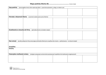 Mapa podróży klienta dla ……………………………………….. (nazwa usługi) Etap podróży (poszczególne kroki, które wykonuje klient – przed skorzystaniem z usługi, w trakcie i po) Potrzeby i aktywność klienta (czynności wykonywane przez klienta) Oczekiwania w stosunku do firmy Stan emocji (potrzeby klienta na każdym etapie) (punkty połączone linią oznaczające jak bardzo klient jest szczęśliwy lub smutny – podirytowany – na danym etapie) Szczęśliwy Smutny Potencjalne możliwości zmiany (wstępne propozycje wzmacniania pozytywnych aspektów lub niwelowania negatywnych)