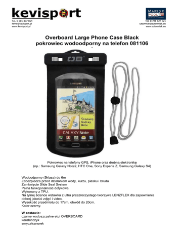 Tel. 0 601 377 054 [email protected] www.kevisport.pl Tel. 0 721 127 721 [email protected] www.sztormiak.eu Overboard Large Phone Case Black pokrowiec wodoodporny na telefon 081106 + Pokrowiec na telefony GPS, iPhone oraz drobną elektronikę (np.: Samsung Galaxy Note2, HTC One, Sony Experia Z, Samsung Galaxy S4) Wodoodporny (5klasa) do 6m Zabezpiecza przed działaniem wody, kurzu, piasku i brudu Zamknięcie Slide Seal System Pełna funkcjonalność dotykowa. Wykonany z TPU. Na tylnej ściance wstawka z ultra przezroczystego tworzywa LENZFLEX dla zapewnienia dobrej jakości zdjęć i video. Wysokość przedmiotu do 17cm, obwód do 20cm. Kolor czarny. W zestawie: czarne wodoszczelne etui OVERBOARD karabińczyk smycz/sznurek