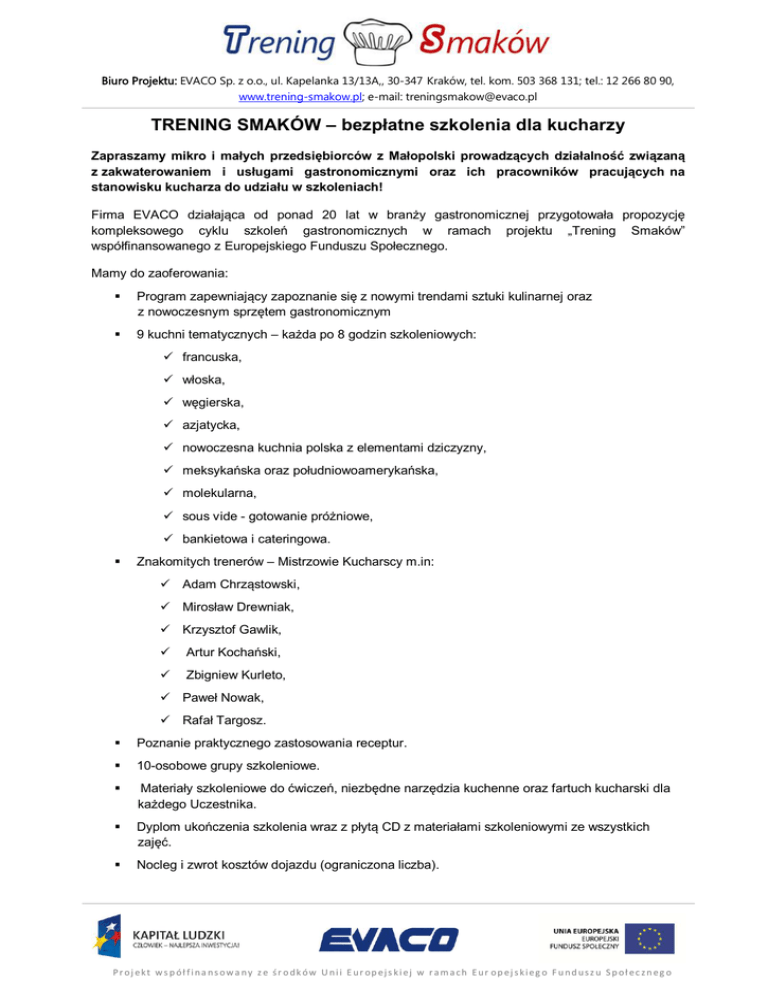 Biuro Projektu: EVACO Sp. z o.o., ul. Kapelanka 13/13A,, 30-347 Kraków, tel. kom. 503 368 131; tel.: 12 266 80 90, www.trening-smakow.pl; e-mail: [email protected] TRENING SMAKÓW – bezpłatne szkolenia dla kucharzy Zapraszamy mikro i małych przedsiębiorców z Małopolski prowadzących działalność związaną z zakwaterowaniem i usługami gastronomicznymi oraz ich pracowników pracujących na stanowisku kucharza do udziału w szkoleniach! Firma EVACO działająca od ponad 20 lat w branży gastronomicznej przygotowała propozycję kompleksowego cyklu szkoleń gastronomicznych w ramach projektu „Trening Smaków” współfinansowanego z Europejskiego Funduszu Społecznego. Mamy do zaoferowania: Program zapewniający zapoznanie się z nowymi trendami sztuki kulinarnej oraz z nowoczesnym sprzętem gastronomicznym 9 kuchni tematycznych – każda po 8 godzin szkoleniowych: francuska, włoska, węgierska, azjatycka, nowoczesna kuchnia polska z elementami dziczyzny, meksykańska oraz południowoamerykańska, molekularna, sous vide - gotowanie próżniowe, bankietowa i cateringowa. Znakomitych trenerów – Mistrzowie Kucharscy m.in: Adam Chrząstowski, Mirosław Drewniak, Krzysztof Gawlik, Artur Kochański, Zbigniew Kurleto, Paweł Nowak, Rafał Targosz. Poznanie praktycznego zastosowania receptur. 10-osobowe grupy szkoleniowe. Materiały szkoleniowe do ćwiczeń, niezbędne narzędzia kuchenne oraz fartuch kucharski dla każdego Uczestnika. Dyplom ukończenia szkolenia wraz z płytą CD z materiałami szkoleniowymi ze wszystkich zajęć. Nocleg i zwrot kosztów dojazdu (ograniczona liczba). Proj ekt ws p ół fina ns owa ny z e śr odk ów U nii E ur op ejs kiej w ramach Eur op ej skieg o F u nd usz u S p oł ec zn eg o Biuro Projektu: EVACO Sp. z o.o., ul. Kapelanka 13/13A,, 30-347 Kraków, tel. kom. 503 368 131; tel.: 12 266 80 90, www.trening-smakow.pl; e-mail: [email protected] Projekt skierowany jest do kucharzy oddelegowanych na szkolenia przez pracodawcę z mikro i małych przedsiębiorstw z województwa małopolskiego, prowadzących działalność gospodarczą związaną z zakwaterowaniem i usługami gastronomicznymi. Trwa rekrutacja do drugiej edycji szkoleń (wrzesień 2012 – styczeń 2013), która rozpoczęła się 1 czerwca i potrwa do 31 sierpnia. Zachęcamy do zgłaszania pracowników zatrudnionych w charakterze szefów kuchni / kucharzy. Kontakt: Paulina Jarynowska Specjalistka ds. rekrutacji tel.kom.: 503 368 131 e-mail: [email protected] strona internetowa: www.trening-smakow.pl Proj ekt ws p ół fina ns owa ny z e śr odk ów U nii E ur op ejs kiej w ramach Eur op ej skieg o F u nd usz u S p oł ec zn eg o
