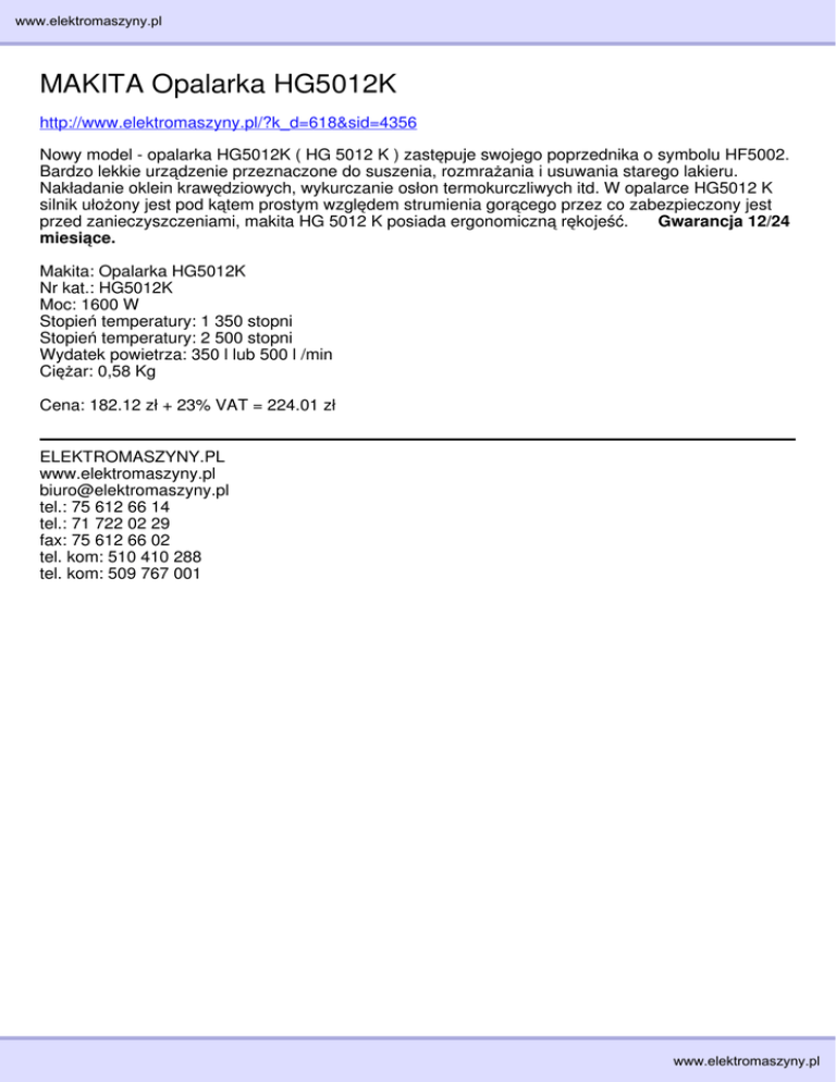 www.elektromaszyny.pl MAKITA Opalarka HG5012K http://www.elektromaszyny.pl/?k_d=618&sid=4356 Nowy model - opalarka HG5012K ( HG 5012 K ) zastępuje swojego poprzednika o symbolu HF5002. Bardzo lekkie urządzenie przeznaczone do suszenia, rozmrażania i usuwania starego lakieru. Nakładanie oklein krawędziowych, wykurczanie osłon termokurczliwych itd. W opalarce HG5012 K silnik ułożony jest pod kątem prostym względem strumienia gorącego przez co zabezpieczony jest przed zanieczyszczeniami, makita HG 5012 K posiada ergonomiczną rękojeść. Gwarancja 12/24 miesiące. Makita: Opalarka HG5012K Nr kat.: HG5012K Moc: 1600 W Stopień temperatury: 1 350 stopni Stopień temperatury: 2 500 stopni Wydatek powietrza: 350 l lub 500 l /min Ciężar: 0,58 Kg Cena: 182.12 zł + 23% VAT = 224.01 zł ELEKTROMASZYNY.PL www.elektromaszyny.pl [email protected] tel.: 75 612 66 14 tel.: 71 722 02 29 fax: 75 612 66 02 tel. kom: 510 410 288 tel. kom: 509 767 001 www.elektromaszyny.pl