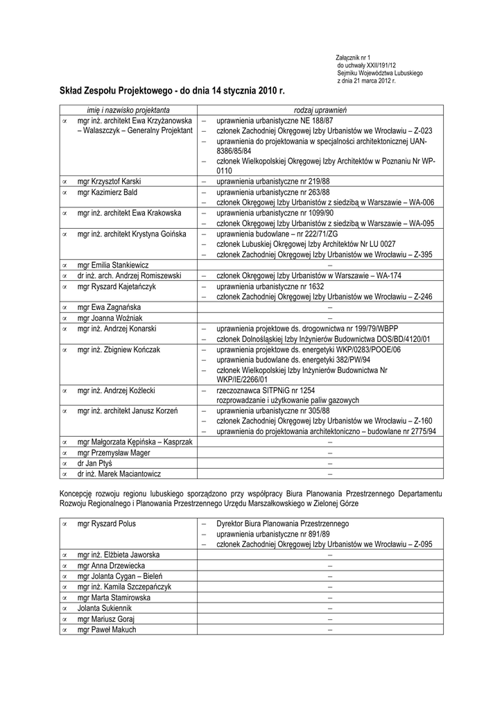 Załącznik nr 1 do uchwały XXII/191/12 Sejmiku Województwa Lubuskiego z dnia 21 marca 2012 r. Skład Zespołu Projektowego - do dnia 14 stycznia 2010 r. • imię i nazwisko projektanta mgr inż. architekt Ewa Krzyżanowska – Walaszczyk – Generalny Projektant − − − − • • mgr Krzysztof Karski mgr Kazimierz Bald − − − − − − − − • mgr inż. architekt Ewa Krakowska • mgr inż. architekt Krystyna Goińska • • • mgr Emilia Stankiewicz dr inż. arch. Andrzej Romiszewski mgr Ryszard Kajetańczyk • • • mgr Ewa Zagnańska mgr Joanna Woźniak mgr inż. Andrzej Konarski • mgr inż. Zbigniew Kończak − − − − − • mgr inż. Andrzej Koźlecki − • mgr inż. architekt Janusz Korzeń • • • • − − − mgr Małgorzata Kępińska – Kasprzak mgr Przemysław Mager dr Jan Ptyś dr inż. Marek Maciantowicz − − − rodzaj uprawnień uprawnienia urbanistyczne NE 188/87 członek Zachodniej Okręgowej Izby Urbanistów we Wrocławiu – Z-023 uprawnienia do projektowania w specjalności architektonicznej UAN8386/85/84 członek Wielkopolskiej Okręgowej Izby Architektów w Poznaniu Nr WP0110 uprawnienia urbanistyczne nr 219/88 uprawnienia urbanistyczne nr 263/88 członek Okręgowej Izby Urbanistów z siedzibą w Warszawie – WA-006 uprawnienia urbanistyczne nr 1099/90 członek Okręgowej Izby Urbanistów z siedzibą w Warszawie – WA-095 uprawnienia budowlane – nr 222/71/ZG członek Lubuskiej Okręgowej Izby Architektów Nr LU 0027 członek Zachodniej Okręgowej Izby Urbanistów we Wrocławiu – Z-395 − członek Okręgowej Izby Urbanistów w Warszawie – WA-174 uprawnienia urbanistyczne nr 1632 członek Zachodniej Okręgowej Izby Urbanistów we Wrocławiu – Z-246 − − uprawnienia projektowe ds. drogownictwa nr 199/79/WBPP członek Dolnośląskiej Izby Inżynierów Budownictwa DOS/BD/4120/01 uprawnienia projektowe ds. energetyki WKP/0283/POOE/06 uprawnienia budowlane ds. energetyki 382/PW/94 członek Wielkopolskiej Izby Inżynierów Budownictwa Nr WKP/IE/2266/01 rzeczoznawca SITPNiG nr 1254 rozprowadzanie i użytkowanie paliw gazowych uprawnienia urbanistyczne nr 305/88 członek Zachodniej Okręgowej Izby Urbanistów we Wrocławiu – Z-160 uprawnienia do projektowania architektoniczno – budowlane nr 2775/94 − − − − Koncepcję rozwoju regionu lubuskiego sporządzono przy współpracy Biura Planowania Przestrzennego Departamentu Rozwoju Regionalnego i Planowania Przestrzennego Urzędu Marszałkowskiego w Zielonej Górze • mgr Ryszard Polus • • • • • • • • mgr inż. Elżbieta Jaworska mgr Anna Drzewiecka mgr Jolanta Cygan – Bieleń mgr inż. Kamila Szczepańczyk mgr Marta Stamirowska Jolanta Sukiennik mgr Mariusz Goraj mgr Paweł Makuch − − − Dyrektor Biura Planowania Przestrzennego uprawnienia urbanistyczne nr 891/89 członek Zachodniej Okręgowej Izby Urbanistów we Wrocławiu – Z-095 − − − − − − − − Skład Zespołu Projektowego - od dnia 16 czerwca 2010 r. lp. 1. imię i nazwisko mgr inż. architekt Krystyna Goińska uprawnienia − − − 2. mgr Kazimierz Bald − − 3. mgr inż. architekt Ewa Krakowska − − 4. 5. mgr Emilia Stankiewicz mgr Andrzej Konarski − − 6. 7. 8. 9. mgr Małgorzata Kępińska – Kasprzak mgr Przemysław Mager uprawnienia budowlane nr 222/71/ZG członek Lubuskiej Okręgowej Izby Architektów Nr LU 0027 członek Zachodniej Okręgowej Izby Urbanistów we Wrocławiu – Z-395 uprawnienia urbanistyczne nr 263/88 członek Okręgowej Izby Urbanistów z siedzibą w Warszawie – WA-006 uprawnienia urbanistyczne nr 1099/90 członek Okręgowej Izby Urbanistów z siedzibą w Warszawie – WA-095 − uprawnienia projektowe ds. drogownictwa nr 199/79/WBPP członek Dolnośląskiej Izby Inżynierów Budownictwa DOS/BD/4120/01 − dr inż. Marek Maciantowicz mgr inż. Grzegorz Socha − − − funkcja/zagadnienia Generalny Projektant teks planu tekst planu tekst planu komunikacja i transport prognoza oddziaływania na środowisko prognoza oddziaływania na środowisko opracowanie części graficznej /rysunki map/ opracowanie części graficznej /rysunki map/ Współpraca i konsultacje – Urząd Marszałkowski Województwa Lubuskiego w Zielonej Górze: 1. 2. 3. 4. 5. 6. 7. 8. 9. 10. 11. 12. 13. 14. 15. mgr inż Maciej Nowicki mgr Ryszard Polus mgr inż. Elżbieta Jaworska mgr Anna Drzewiecka mgr Jolanta Cygan – Bieleń mgr inż. Kamila Szczepańczyk Jolanta Sukiennik mgr Marta Stamirowska mgr Mariusz Goraj mgr Paweł Makuch mgr inż. Danuta Wesołowska – Wujaszek mgr Wojciech Walewski dr Jerzy Tonder mgr inż. Andrzej Betka mgr inż. Roman Bąk Autorzy opracowania ekofizjograficznego Województwa Lubuskiego: 1) 2) 3) 4) 5) 6) 7) 8) 9) 10) 11) 12) 13) 14) 15) 16) 17) 18) 19) 20) 21) 22) 23) 24) 25) 26) 27) 28) 29) 30) 31) 32) 33) 34) 35) 36) prof. dr hab. Grzegorz Gabryś – Katedra Biologii, Wydział Nauk Biologicznych, Uniwersytet Zielonogórski dr hab. Leszek Jerzak – Katedra Ochrony Przyrody, Wydział Nauk Biologicznych, Uniwersytet Zielonogórski dr Marcin Bocheński – Katedra Ochrony Przyrody, Wydział Nauk Biologicznych, Uniwersytet Zielonogórski dr Bartłomiej Najbar, Instytut Inżynierii Lądowej i Środowiska, Zakład Ekologii Stosowanej, Uniwersytet Zielonogórski dr Piotr Reda, Katedra Biologii, Wydział Nauk Biologicznych, Uniwersytet Zielonogórski dr inż. Agnieszka Ważna, Katedra Biologii, Wydział Nauk Biologicznych, Uniwersytet Zielonogórski mgr inż. Jan Cichocki, Katedra Biologii, Wydział nauk Biologicznych, Uniwersytet Zielonogórski dr inż. Marek Maciantowicz, Regionalna Dyrekcja Lasów Państwowych, Uniwersytet Zielonogórski dr Paweł Czechowski, Instytut Turystyki i Rekreacji, PWSZ w Sulechowie mgr inż. Wojciech Zieleniewski, Polski Związek Wędkarski, Okręg w Zielonej Górze mgr Mariusz Mleczak, Glińsk 2/1, 66-200 Świebodzin mgr inż. Michał Budny, Leaf Project Studio, ul. Poleska 31/59, 51-354 Wrocław m