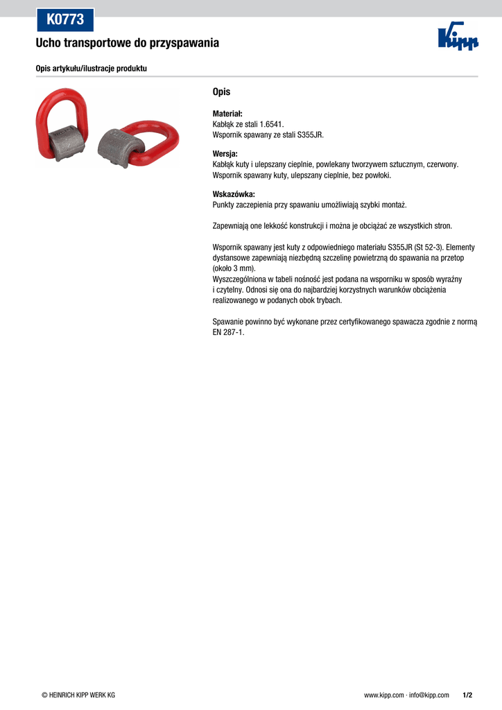 K0773 Ucho transportowe do przyspawania Opis artykułu/ilustracje produktu Opis Materiał: Kabłąk ze stali 1.6541. Wspornik spawany ze stali S355JR. Wersja: Kabłąk kuty i ulepszany cieplnie, powlekany tworzywem sztucznym, czerwony. Wspornik spawany kuty, ulepszany cieplnie, bez powłoki. Wskazówka: Punkty zaczepienia przy spawaniu umożliwiają szybki montaż. Zapewniają one lekkość konstrukcji i można je obciążać ze wszystkich stron. Wspornik spawany jest kuty z odpowiedniego materiału S355JR (St 52-3). Elementy dystansowe zapewniają niezbędną szczelinę powietrzną do spawania na przetop (około 3 mm). Wyszczególniona w tabeli nośność jest podana na wsporniku w sposób wyraźny i czytelny. Odnosi się ona do najbardziej korzystnych warunków obciążenia realizowanego w podanych obok trybach. Spawanie powinno być wykonane przez certyfikowanego spawacza zgodnie z normą EN 287-1. © HEINRICH KIPP WERK KG www.kipp.com · [email protected] 1/2 K0773 Ucho transportowe do przyspawania Rysunki Ucho transportowe do przyspawania Nr Zamówienia Wersja B B1 H H1 L L1 S Spoina K0773.1000 K0773.2000 K0773.3000 K0773.5000 K0773.1001 K0773.2001 K0773.3001 K0773.5001 bez elementu sprężynowego bez elementu sprężynowego bez elementu sprężynowego bez elementu sprężynowego z elementem sprezynowym z elementem sprezynowym z elementem sprezynowym z elementem sprezynowym 40 41 45 55 40 41 45 55 38 38 43 50 38 38 43 50 32 32 38 48 32 32 38 48 40 45 45 57 40 45 45 57 73 81 87 108 73 81 87 108 38 40 42 60 38 40 42 60 13 13 17 22 13 13 17 22 HV 5 + a3 HV 5 + a3 HV 8 + a3 HV 12 + a4 HV 5 + a3 HV 5 + a3 HV 8 + a3 HV 12 + a4 © HEINRICH KIPP WERK KG Nośność kg 1120 2000 3150 5300 1120 2000 3150 5300 www.kipp.com · [email protected] 2/2