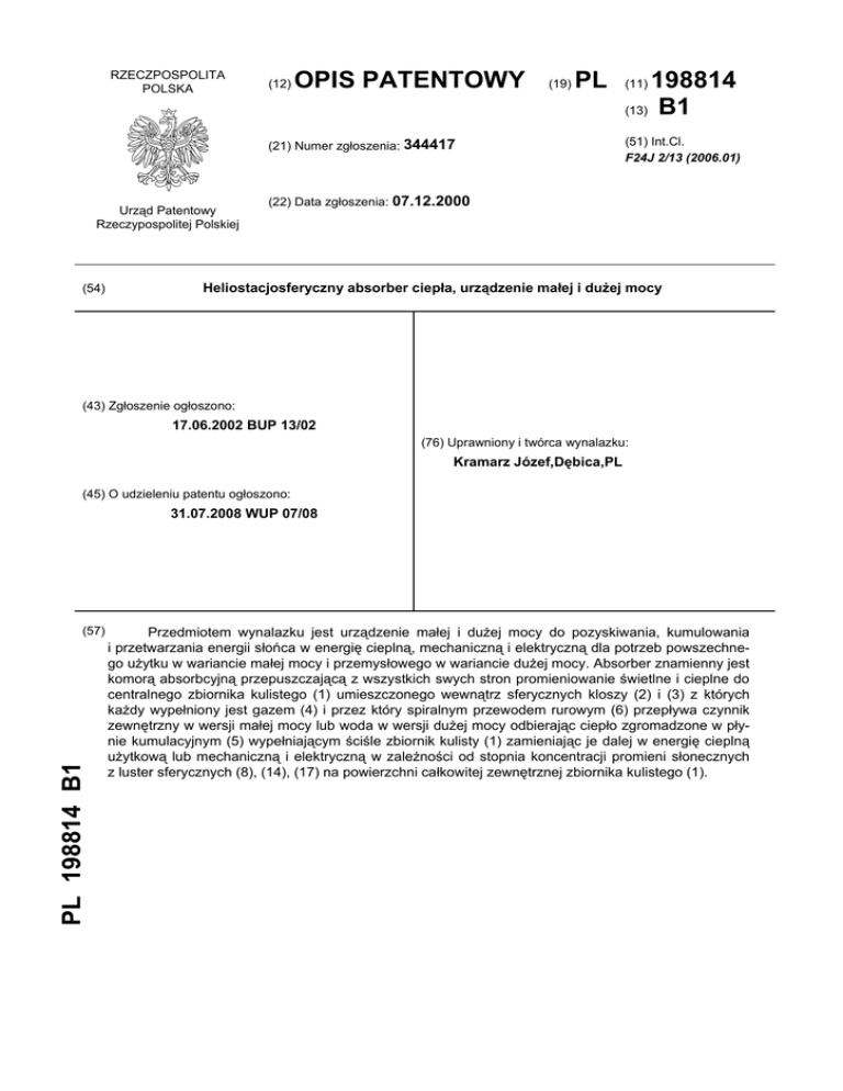 RZECZPOSPOLITA POLSKA (12) OPIS PATENTOWY (19) PL (21) Numer zgłoszenia: 344417 Urząd Patentowy Rzeczypospolitej Polskiej (54) 198814 (13) B1 (11) (51) Int.Cl. F24J 2/13 (2006.01) (22) Data zgłoszenia: 07.12.2000 Heliostacjosferyczny absorber ciepła, urządzenie małej i dużej mocy (43) Zgłoszenie ogłoszono: 17.06.2002 BUP 13/02 (76) Uprawniony i twórca wynalazku: Kramarz Józef,Dębica,PL (45) O udzieleniu patentu ogłoszono: 31.07.2008 WUP 07/08 PL 198814 B1 (57) Przedmiotem wynalazku jest urządzenie małej i dużej mocy do pozyskiwania, kumulowania i przetwarzania energii słońca w energię cieplną, mechaniczną i elektryczną dla potrzeb powszechnego użytku w wariancie małej mocy i przemysłowego w wariancie dużej mocy. Absorber znamienny jest komorą absorbcyjną przepuszczającą z wszystkich swych stron promieniowanie świetlne i cieplne do centralnego zbiornika kulistego (1) umieszczonego wewnątrz sferycznych kloszy (2) i (3) z których każdy wypełniony jest gazem (4) i przez który spiralnym przewodem rurowym (6) przepływa czynnik zewnętrzny w wersji małej mocy lub woda w wersji dużej mocy odbierając ciepło zgromadzone w płynie kumulacyjnym (5) wypełniającym ściśle zbiornik kulisty (1) zamieniając je dalej w energię cieplną użytkową lub mechaniczną i elektryczną w zależności od stopnia koncentracji promieni słonecznych z luster sferycznych (8), (14), (17) na powierzchni całkowitej zewnętrznej zbiornika kulistego (1). 2 PL 198 814 B1 Opis wynalazku Przedmiotem wynalazku jest heliostacjosferyczny absorber ciepła słonecznego przeznaczony zwłaszcza do pozyskiwania i kumulowania energii cieplnej promieniowania słonecznego widzialnego i podczerwonego, cieplnego do dalszego wykorzystania, magazynowania i przetwarzania na potrzeby powszechnego użytku domowego i przemysłowego zwany w skrócie absorber heliostacjosferyczny małej mocy i absorber heliostacjosferyczny dużej mocy do wytwarzania pary wodnej ich budowa oraz sposób pozyskiwania i kumulowania energii słońca za ich pomocą na tle ujawnionych rozwiązań z tej dziedziny. Znany jest w tej dziedzinie przykład kolektora energii słonecznej zawarty w opisie patentowym PL 167388 oraz intensywny kolektor ciepła słonecznego zawarty w opisie patentowym JP58092752 gdzie w pierwszym z nich w połączonym układzie płasko-rurowym następuje proces absorpcji tego ciepła do zbiornika rurowego wypełnionego cieczą natomiast w drugim proces absorpcji tego ciepła słonecznego jest poprzez zbiornik kulisty oddawany do zbiornika zewnętrznego - oba te przykłady tworzą znane dziś powszechnie kolektory słoneczne płaskie, rurowe i kuliste - stacjonarne mogące uzyskać moc niskiego rzędu oraz opłacalności z uwagi na brak mobilności oraz samych możliwości zwielokrotnienia i koncentracji wiązki cieplnej na powierzchni roboczej kolektora słonecznego. Kolektory te z zasady mocowane są na dachach domów, obiektów i wymagają dla uzyskania swej sprawności dużych powierzchni roboczych a nadto odpowiedniej lokalizacji względem słońca co nie zawsze jest możliwe w przypadku budynków wcześniej wybudowanych. Ponadto kolektory te a szczególnie płaskie pochłaniają i absorbują energię słońca tylko jedną stroną absorbera, którą w tym przypadku jest płyta płaska pochłaniająca wraz z przewodami rurowymi cieczowymi małej objętości, oświetlana i ogrzewana jednostronnie przez promieniowanie słoneczne co stanowi, że tylko ta część powierzchni absorbera jest częścią roboczą przyjmującą i pochłaniającą stałą, określoną tą powierzchnią ilość promieniowania wykorzystywaną efektywnie pod warunkiem, że promienie słoneczne padają w sposób ciągły i prostopadle na powierzchnię kolektora w ciągu całego dnia od wschodu do zachodu słońca i przez cały okrągły rok w przekroju poszczególnych pór roku. Niestety rozwiązania te z uwagi na swe duże powierzchnie robocze są z reguły pozbawione możliwości sterownych a tym samym możliwości efektywnego ich wykorzystania w okresie poszczególnych a różnych od siebie pór roku w których gęstość i siła promieniowania słonecznego jest zróżnicowana. Ponadto generalnie jako urządzenia przepływowe pozbawione są możliwości kumulowania w sobie pozyskanego ciepła, które bezpośrednio odprowadzane jest i gromadzone w wymiennikowi. Natomiast w rozwiązaniach przemysłowych znanych jako elektrownie słoneczne czy piece słoneczne pozyskiwanie energii słonecznej przebiega na ogromnych płaszczyznowo obszarach gdzie wiązka promieni słonecznych za pomocą płaskich luster koncentrowana jest z tego obszaru na wieży heliotermicznej czy na wklęsłym zwierciadle skupiającym te promienie na stosie, piecu słonecznym. Oba te rozwiązania wymagają ogromnych powierzchni przemysłowych i potężnych środków dla ich realizacji a sam proces pozyskiwania jest procesem otwartym na wolnej przestrzeni bez osłon termicznych, izolujących ruch cząsteczek powietrza w tym obszarze. Celem wynalazku jest wyeliminowanie wszystkich wad dotychczasowych rozwiązań i budowa absorbera jako jednostki podstawowej, pozyskującej i kumulującej w swoim wnętrzu energię słoneczną w wariancie małej mocy o minimum dwukrotnie większej sprawności od dotychczasowych kolektorów słonecznych przy jego zwartej i małej budowie sterowalnej na i za słońcem w sposób ciągły oraz w wariancie dużej mocy o minimum czterokrotnie większej sprawności od jednostki podstawowej przy zastosowaniu dodatkowych zewnętrznych i stałych z konstrukcją ruchomą absorbera, luster koncentrujących energię słoneczną na powierzchni absorbera i pozwalającej na szeregowe łączenie ze sobą w zależności od potrzeb, kolejnych urządzeń w miejscu dowolnego ich sytuowania w całe bloki energetyczne sterowane na i za słońcem jedną aparaturą i jedną wspólną siłownią, zapewniającą zgodny ruch absorberów. Istotą wynalazku jes