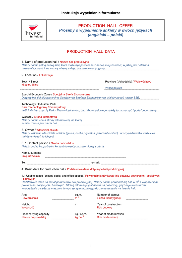 Instrukcja wypełniania formularza PRODUCTION HALL OFFER Prosimy o wypełnienie ankiety w dwóch językach (angielski – polski) PRODUCTION HALL DATA 1. Name of production hall / Nazwa hali produkcyjnej Należy podać pełną nazwę hali, która może być powiązana z nazwą miejscowości, w jakiej jest położona, nazwą ulicy, bądź inna nazwą własną całego obszaru inwestycyjnego. 2. Location / Lokalizacja Province (Voivodship) / Województwo Town / Street Miasto / Ulica Wielkopolskie Special Economic Zone / Specjalna Strefa Ekonomiczna Dotyczy hal zlokalizowanych w Specjalnych Strefach Ekonomicznych. Należy podać nazwę SSE. Technology / Industrial Park Park Technologiczny / Przemysłowy Jeśli hala jest częścią Parku Technologicznego, bądź Przemysłowego należy to zaznaczyć i podać jego nazwę. Website / Strona internetowa Należy podać adres strony internetowej, na której zamieszczona jest oferta hali. 3. Owner / Właściciel obiektu Należy wskazać właściciela obiektu (gmina, osoba prywatna, przedsiębiorstwo). W przypadku kilku właścicieli należy wskazać ilu ich jest. 3. 1 Contact person / Osoba do kontaktu Należy podać bezpośredni kontakt do osoby zaznajomionej z ofertą. Name, surname Imię, nazwisko Tel: e-mail: 4. Basic data for production hall / Podstawowe dane dotyczące hali produkcyjnej 4.1 Usable space (except: social and office space) / Powierzchnia użytkowa (nie dotyczy: powierzchni socjalnych i biurowych) 2 Podstawowe dane na temat parametrów hali produkcyjnej. Należy podać powierzchnię hali w m z wyłączeniem powierzchni socjalnych i biurowych. Istotną informacją jest nacisk na posadzkę, gdyż daje inwestorowi wyobrażenie o ciężarze maszyn i innego sprzętu możliwego do zamieszczenia na terenie hali. Area Powierzchnia sq.m. 2 m Number of storeys Liczba kondygnacji Height Wysokość m Year of construction Rok budowy Floor carrying capacity Nacisk na posadzkę kg / sq.m. 2 kg / m Year of modernization Rok modernizacji 1 Instrukcja wypełniania formularza 4.2 Present technical condition / Obecny stan techniczny Należy zaznaczyć stan techniczny, któremu odpowiada prezentowana hala. Excellent / Doskonały Standard / Średni Good / Dobry Poor / Słaby 4.3 Total area of land Całkowita powierzchnia terenu sq.m. Należy podać całkowitą powierzchnię terenu, na którym zlokalizowana jest hala. 2 m 5. Transport link / Połączenia transportowe Nearest motorway / National road Najbliższa droga szybkiego ruchu / krajowa km prosimy o podanie odległość w km od autostrady A2 oraz drogi krajowej z podaniem jej numeru Nearest voivodship city Najbliższe miasto wojewódzkie km prosimy o podanie nazwy miasta i odległość w km Nearest international airport Najbliższe lotnisko międzynarodowe km nazwa miasta i odległość w km 6. Infrastructure / Infrastruktura Należy zaznaczyć, które ze wskazanych elementów infrastruktury znajdują się na terenie, na którym zlokalizowana jest hala, bądź w bezpośrednim sąsiedztwie (w odległości max. 100 m). Power / Elektryczność Sewage system / Kanalizacja Water / Woda Access road for trucks / Dojazd dla ciężarówek Gas / Gaz Overhead cranes / Suwnice Heating / Ogrzewanie Railway siding / Bocznica 7. Terms of acquisition / Warunki nabycia Należy wskazać, które ze wskazanych warunków nabycia są akceptowane przez właściciela hali. Można zaznaczyć więcej niż jedną z możliwości. Ownership / Własność Perpetual usufruct / Użytkowanie wieczyste Lease / Wynajem PLN Cena w pln, hali i działki Należy umieścić przybliżoną cenę negocjacyjną terenu wraz z halą (widełki) w przypadku ofert prywatnych lub informacje z ostatniej wyceny. UWAGA! Wypełnienie tej rubryki jest konieczne. Jeśli w poprzednim punkcie (pkt. 7) wskazano kilka możliwych wariantów nabycia, należy w odniesieniu do każdego z nich wskazać cenę, bądź jeśli podana będzie jedna wartość, należy wskazać którego wariantu dotyczy. 7.1 Price in PLN, including hall and land 8. Additional information / Dodatkowe informacje W tym punkcie należy zawrzeć wszystkie dodatkowe informacje, o których nie ma mowy w powyższej części formularza, a które mogłyby być istotne dla inwestora, np. informacja o zwolnieniach z podatku, bądź innych udogodnieniach dla inwestycji lokalizowanych na terenie gminy. Date of the offer Data przygotowania oferty 2