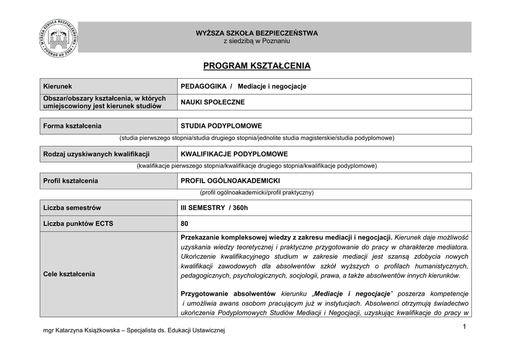 WYŻSZA SZKOŁA BEZPIECZEŃSTWA z siedzibą w Poznaniu PROGRAM KSZTAŁCENIA Kierunek PEDAGOGIKA / Mediacje i negocjacje Obszar/obszary kształcenia, w których umiejscowiony jest kierunek studiów NAUKI SPOŁECZNE Forma kształcenia STUDIA PODYPLOMOWE (studia pierwszego stopnia/studia drugiego stopnia/jednolite studia magisterskie/studia podyplomowe) Rodzaj uzyskiwanych kwalifikacji KWALIFIKACJE PODYPLOMOWE (kwalifikacje pierwszego stopnia/kwalifikacje drugiego stopnia/kwalifikacje podyplomowe) Profil kształcenia PROFIL OGÓLNOAKADEMICKI (profil ogólnoakademicki/profil praktyczny) Liczba semestrów III SEMESTRY / 360h Liczba punktów ECTS 80 Cele kształcenia Przekazanie kompleksowej wiedzy z zakresu mediacji i negocjacji. Kierunek daje możliwość uzyskania wiedzy teoretycznej i praktyczne przygotowanie do pracy w charakterze mediatora. Ukończenie kwalifikacyjnego studium w zakresie mediacji jest szansą zdobycia nowych kwalifikacji zawodowych dla absolwentów szkół wyższych o profilach humanistycznych, pedagogicznych, psychologicznych, socjologii, prawa, a także absolwentów innych kierunków. Przygotowanie absolwentów kierunku „Mediacje i negocjacje” poszerza kompetencje i umożliwia awans osobom pracującym już w instytucjach. Absolwenci otrzymują świadectwo ukończenia Podyplomowych Studiów Mediacji i Negocjacji, uzyskując kwalifikacje do pracy w mgr Katarzyna Książkowska – Specjalista ds. Edukacji Ustawicznej 1 WYŻSZA SZKOŁA BEZPIECZEŃSTWA z siedzibą w Poznaniu szkołach, domach dziecka, domach pomocy społecznej, zakładach karnych i poprawczych, itp. Absolwenci studiów podyplomowych z zakresu mediacji zdobędą kwalifikacje, które umożliwiają podejmowanie pracy mediacyjnej w instytucjach i organizacjach zajmujących się pomocą w sytuacjach kryzysowych, będą mogli uzyskiwać wpis na listy mediatorów prowadzone przez organizacje pozarządowe – stowarzyszenia, fundacje i/lub korporacje zawodowe itp., które są udostępniane sądom cywilnym rodzinnym i gospodarczym, będą mogli także prowadzić własną działalność gospodarczą lub znaleźć zatrudnienie w istniejących ośrodkach mediacyjnych. Kształtowanie wrażliwości etyczno – społecznej. Absolwenci otrzymują świadectwo ukończenia Podyplomowych Studiów Mediacji i Negocjacji, uzyskując kwalifikacje do pracy w szkołach, domach dziecka, domach pomocy społecznej, zakładach karnych i poprawczych. Zapoznanie słuchaczy z zasadami pracy mediatora i negocjatora. Program studiów obejmuje zagadnienia teoretyczne i praktyczne z zakresu mediacji i negocjacji, profilaktyki społecznej, diagnozy, psychologii. OGÓLNY OPIS STUDIÓW PODYPLOMOWYCH Celem studium jest teoretyczne i praktyczne przygotowanie do pracy w charakterze mediatora. Ukończenie kwalifikacyjnego studium w zakresie mediacji jest szansą zdobycia nowych kwalifikacji zawodowych dla absolwentów szkół wyższych o profilu humanistycznych. Celem studiów jest zapoznanie słuchaczy z: - analizą i oceną procesów dotyczących bezpieczeństwa i porządku publicznego, podejmowaniem decyzji podczas działania w warunkach kryzysowych; - sposobami oceny sytuacji kryzysowych i właściwego reagowania na negatywne zachowania osobnicze, sporządzania dokumentacji planistycznej reagowania kryzysowego; - możliwościami umiejętnego wykorzystania optymalnych technik organizacji i pracy w sytuacjach wyjątkowych; mgr Katarzyna Książkowska – Specjalista ds. Edukacji Ustawicznej 2 WYŻSZA SZKOŁA BEZPIECZEŃSTWA z siedzibą w Poznaniu - zarządzaniem sytuacjami kryzysowymi, motywowanymi zarówno przyczynami naturalnymi (np. klęski żywiołowe, katastrofy naturalne), jak i nienaturalnymi (np. awarie techniczne, zakłócenia porządku publicznego, zagrożenia o charakterze terrorystycznym, bunty i manifestacje samobójstw w ośrodkach resocjalizacyjnych, zakładach karnych, ataki na personel w szpitalach psychiatrycznych, przychodniach, manifestacje samobójstw w szkołach i miejscach pracy światka biznesu itp.); - podstawami sprawnego komunikowania się i prowadzenia negocjacji gwarantujących najwyższy stopień skuteczności i kreatywność działania; - sposobami nabywania kompetencji niezbędnych do prowadzenia właściwej komunikacji z osobami przejawiającymi negatywne zachowania osobnicze komunikacja werbalna i niewerbalna; - sposobami radzenia sobie ze stresem w sytuacjach kryzysowych; - kontaktowania się z mediami i właściwego przekazywania informacji o zdarzeniach - prowadzenia mediacji Studia przeznaczone są dla absolwentów wyższych uczelni (absolwentów studiów I stopnia lub absolwentów studiów II stopnia oraz studiów jednolitych magisterskich): - pracujących lub zamierzających podjąć pracę w służbach mundurowych (policja, służba więzienna, straż miejska, wojsko, straż pożarna, straż graniczna, służby celne), Agencji Bezpieczeństwa Wewnętrznego, Centralnego Biura Antykorupcyjnego, Biura Ochrony Rządu, - dla służb likwidujących zagrożenia powodowane działaniami terrorystycznymi. Zdobyta wiedza pozwoli w sposób efektywny wykorzystać uprawnienia i zasoby podmiotów wyszczególnionych w siatce bezpieczeństwa do skutecznego zabezpieczenia działań negocjatora na miejscu zdarzenia i poza nim; - pracujących lub zamierzających podjąć pracę w instytucjach zajmujących się zagadnieniami bezpieczeństwa i porządku publicznego, rozwiązywaniem konfliktów, interwencją kryzysową, w szczególności dla pracowników banków, pracowników agencji detektywistycznych, linii lotniczych, pracowników społecznych (kuratorzy, personel ośrodków pomocy społecznej), pracowników szpitali psychiatrycznych, instytucji rządowych i pozarządowych związanych z reagowaniem w sytuacjach kryzysowych, duchowieństwa, dla nauczycieli i wychowawców, dla wszystkich wybranych grup ryzyka zawodowego, obciążonych wieloma aspektami niebezpieczeństwa i zagrożenia zewnętrznego (w tym pracownicy firm pryw