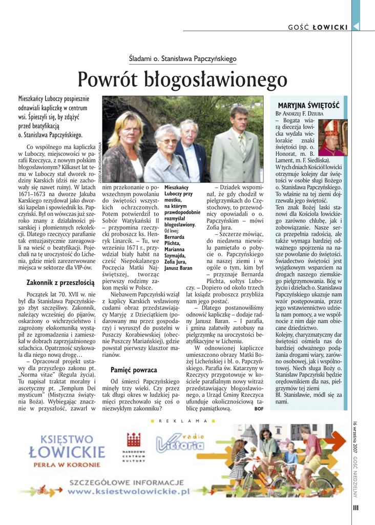 GOŚĆ ŁOWICKI Śladami o. Stanisława Papczyńskiego Powrót błogosławionego Mieszkańcy Luboczy pospiesznie odnawiali kapliczkę w centrum wsi. Śpieszyli się, by zdążyć przed beatyfikacją o. Stanisława Papczyńskiego. Zakonnik z przeszłością Początek lat 70. XVII w. nie był dla Stanisława Papczyńskiego zbyt szczęśliwy. Zakonnik, należący wcześniej do pijarów, oskarżony o wichrzycielstwo i zagrożony ekskomuniką wystąpił ze zgromadzenia i zamieszkał w dobrach zaprzyjaźnionego szlachcica. Opatrzność szykowała dla niego nową drogę… – Opracował projekt ustawy dla przyszłego zakonu pt. „Norma vitae” (Reguła życia). Tu napisał traktat moralny i ascetyczny pt. „Templum Dei mysticum” (Mistyczna świątynia Boża). Wybiegając znacznie w przyszłość, zawarł w ZDJĘCIA BOHDAN FUDAŁA Co wspólnego ma kapliczka w Luboczy, miejscowości w parafii Rzeczyca, z nowym polskim błogosławionym? Kilkaset lat temu w Luboczy stał dworek rodziny Karskich (dziś nie zachowały się nawet ruiny). W latach 1671–1673 na dworze Jakuba Karskiego rezydował jako dworski kapelan i spowiednik ks. Papczyński. Był on wówczas już szeroko znany z działalności pisarskiej i płomiennych rekolekcji. Dlatego rzeczyccy parafianie tak entuzjastycznie zareagowali na wieść o beatyfikacji. Pojechali na tę uroczystość do Lichenia, gdzie mieli zarezerwowane miejsca w sektorze dla VIP-ów. MARYJNA ŚWIĘTOŚĆ nim przekonanie o po- Mieszkańcy – Dziadek wspomiwszechnym powołaniu Luboczy przy nał, że gdy chodził w do świętości wszyst- mostku, pielgrzymkach do Czękich ochrzczonych. na którym stochowy, to przewodPotem potwierdził to prawdopodobnie nicy opowiadali o o. Sobór Watykański II rozmyślał Papczyńskim – mówi błogosławiony. – przypomina rzeczyZofia Jura. Od lewej: cki proboszcz ks. Hen- Bernarda – Szczerze mówiąc, ryk Linarcik. – Tu, we Plichta, do niedawna niewiewrześniu 1671 r., przy- Marianna lu pamiętało o pobywdział biały habit na Szymajda, cie o. Papczyńskiego cześć Niepokalanego Zofia Jura, na naszej ziemi i w Poczęcia Matki Naj- Janusz Baran ogóle o tym, kim był świętszej, tworząc – przyznaje Bernarda pierwszy rodzimy zaPlichta, sołtys Lubokon męski w Polsce. czy. – Dopiero od około trzech Niebawem Papczyński wziął lat ksiądz proboszcz przybliża z kaplicy Karskich wsławiony nam jego postać. cudami obraz przedstawiają– Dlatego postanowiliśmy cy Maryję z Dzieciątkiem (po- odnowić kapliczkę – dodaje raddarowany mu przez gospoda- ny Janusz Baran. – I parafia, rzy) i wyruszył do pustelni w i gmina załatwiły autobusy na Puszczy Korabiewskiej (obec- pielgrzymkę na uroczystości benie Puszczy Mariańskiej), gdzie atyfikacyjne w Licheniu. powstał pierwszy klasztor maW odnowionej kapliczce rianów. umieszczono obrazy Matki Bożej Licheńskiej i bł. o. Papczyńskiego. Parafia św. Katarzyny w Pamięć powraca Rzeczycy przygotowuje w koOd śmierci Papczyńskiego ściele parafialnym nowy witraż minęły trzy wieki. Czy przez przedstawiający błogosławiotak długi okres w ludzkiej pa- nego, a Urząd Gminy Rzeczyca mięci przechowało się coś o ufunduje okolicznościową taniezwykłym zakonniku? blicę pamiątkową. BOF R E K L A M A 16 września 2007 GOŚĆ NIEDZIELNY BP ANDRZEJ F. DZIUBA – Bogata wiarą diecezja łowicka wydała wielorakie znaki świętości (np. o. Honorat, m. B. Lament, m. F. Siedliska). W tych dniach Kościół łowicki otrzymuje kolejny dar świętości w osobie sługi Bożego o. Stanisława Papczyńskiego. To właśnie na tej ziemi dojrzewała jego świętość. Ten znak Bożej łaski stanowi dla Kościoła łowickiego zarówno chlubę, jak i zobowiązanie. Nasze serca przepełnia radością, ale także wymaga bardziej odważnego spojrzenia na nasze powołanie do świętości. Świadectwo świętości jest wyjątkowym wsparciem na drogach naszego ziemskiego pielgrzymowania. Bóg w życiu i dziełach o. Stanisława Papczyńskiego ukazuje nam wzór postępowania, przez jego wstawiennictwo udziela nam pomocy, a we wspólnocie z nim daje nam obiecane dziedzictwo. Kolejny, charyzmatyczny dar świętości ośmiela nas do bardziej odważnego podążania drogami wiary, zarówno osobowej, jak i wspólnotowej. Niech sługa Boży o. Stanisław Papczyński będzie orędownikiem dla nas, pielgrzymów tej ziemi Bł. Stanisławie, módl się za nami. III