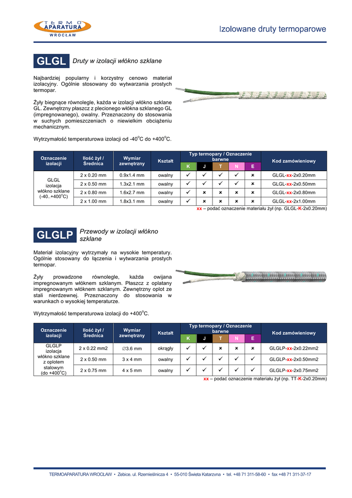 GLGL Druty w izolacji włókno szklane Najbardziej popularny i korzystny cenowo materiał izolacyjny. Ogólnie stosowany do wytwarzania prostych termopar. Żyły biegnące równolegle, każda w izolacji włókno szklane GL. Zewnętrzny płaszcz z plecionego włókna szklanego GL (impregnowanego), owalny. Przeznaczony do stosowania w suchych pomieszczeniach o niewielkim obciążeniu mechanicznym. o o Wytrzymałość temperaturowa izolacji od -40 C do +400 C. Oznaczenie izolacji GLGL izolacja włókno szklane o (-40..+400 C) Ilość żył / Średnica Wymiar zewnętrzny Kształt 2 x 0.20 mm 0.9x1.4 mm owalny 2 x 0.50 mm 1.3x2.1 mm owalny 2 x 0.80 mm 1.6x2.7 mm owalny 2 x 1.00 mm 1.8x3.1 mm owalny Typ termopary / Oznaczenie barwne K J T N E ü ü ü ü ü ü û û ü ü û û ü ü û û û û û û Kod zamówieniowy GLGL-xx-2x0.20mm GLGL-xx-2x0.50mm GLGL-xx-2x0.80mm GLGL-xx-2x1.00mm xx – podać oznaczenie materiału żył (np. GLGL-K-2x0.20mm) GLGLP Przewody w izolacji włókno szklane Materiał izolacyjny wytrzymały na wysokie temperatury. Ogólnie stosowany do łączenia i wytwarzania prostych termopar. Żyły prowadzone równolegle, każda owijana impregnowanym włóknem szklanym. Płaszcz z oplatany impregnowanym włóknem szklanym. Zewnętrzny oplot ze stali nierdzewnej. Przeznaczony do stosowania w warunkach o wysokiej temperaturze. o Wytrzymałość temperaturowa izolacji do +400 C. Oznaczenie izolacji GLGLP izolacja włókno szklane z oplotem stalowym o (do +400 C) Ilość żył / Średnica Wymiar zewnętrzny Kształt 2 x 0.22 mm2 ∅3.6 mm 2 x 0.50 mm 2 x 0.75 mm Typ termopary / Oznaczenie barwne Kod zamówieniowy K J T N E okrągły ü ü û û û GLGLP-xx-2x0.22mm2 3 x 4 mm owalny ü ü ü ü ü GLGLP-xx-2x0.50mm2 4 x 5 mm owalny ü ü ü ü ü GLGLP-xx-2x0.75mm2 xx – podać oznaczenie materiału żył (np. TT-K-2x0.20mm) TERMOAPARATURA WROCŁAW • Zębice, ul. Rzemieślnicza 4 • 55-010 Święta Katarzyna • tel. +48 71 311-58-60 • fax +48 71 311-37-17 1