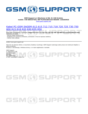 GSM-Support ul. Bitschana 2/38, 31-420 Kraków mobile +48 608107455, NIP PL9451852164 REGON: 120203925 www.gsm-suport.net Kabel PC-GSM SAGEM 612 615 712 715 718 720 725 730 750 800 815 818 820 830 835 850 Kabel jest kompatybilny z modelami Sagem 612 615 712 715 718 720 725 730 750 800 815 818 820 830 835 850. Zastosowanie kabla: - Edycja książki telefonicznej - Programy do usuwania simlockow, serwisowe i inne do naprawy telefonu. - Odczyt kodu zabezp. ©2012 www.gsm-suport.net Opis ten nie stanowi oferty w rozumieniu Kodeksu Cywilnego. GSM-Support zastrzega sobie prawo do możliwych błędów w opisie produktu. Prosimy o weryfikację z Państwa strony, a w razie wątpliwości o kontakt. GSM-Support ul. Bitschana 2/38 31-420 Kraków POLSKA tel. 608107455 e-mail: [email protected] Powered by TCPDF (www.tcpdf.org)