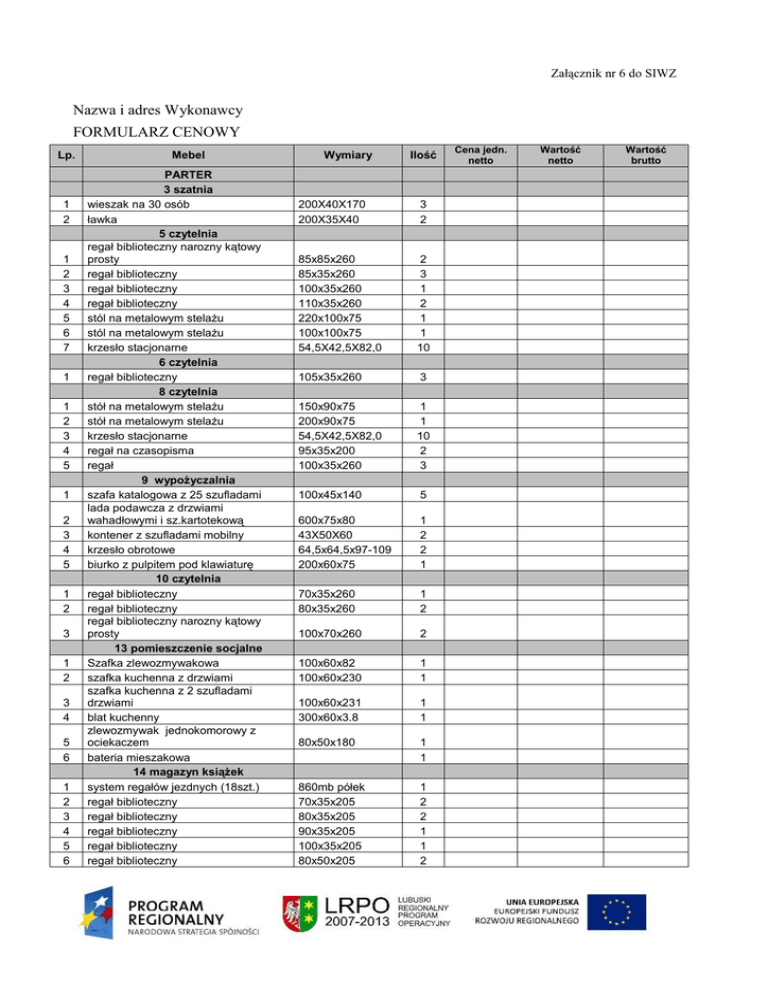 Załącznik nr 6 do SIWZ Nazwa i adres Wykonawcy FORMULARZ CENOWY Lp. 1 2 1 2 3 4 5 6 7 1 1 2 3 4 5 1 2 3 4 5 1 2 3 1 2 3 4 5 6 1 2 3 4 5 6 Mebel PARTER 3 szatnia wieszak na 30 osób ławka 5 czytelnia regał biblioteczny narozny kątowy prosty regał biblioteczny regał biblioteczny regał biblioteczny stól na metalowym stelaŜu stól na metalowym stelaŜu krzesło stacjonarne 6 czytelnia regał biblioteczny 8 czytelnia stół na metalowym stelaŜu stół na metalowym stelaŜu krzesło stacjonarne regał na czasopisma regał 9 wypoŜyczalnia szafa katalogowa z 25 szufladami lada podawcza z drzwiami wahadłowymi i sz.kartotekową kontener z szufladami mobilny krzesło obrotowe biurko z pulpitem pod klawiaturę 10 czytelnia regał biblioteczny regał biblioteczny regał biblioteczny narozny kątowy prosty 13 pomieszczenie socjalne Szafka zlewozmywakowa szafka kuchenna z drzwiami szafka kuchenna z 2 szufladami drzwiami blat kuchenny zlewozmywak jednokomorowy z ociekaczem bateria mieszakowa 14 magazyn ksiąŜek system regałów jezdnych (18szt.) regał biblioteczny regał biblioteczny regał biblioteczny regał biblioteczny regał biblioteczny Wymiary Ilość 200X40X170 200X35X40 3 2 85x85x260 85x35x260 100x35x260 110x35x260 220x100x75 100x100x75 54,5X42,5X82,0 2 3 1 2 1 1 10 105x35x260 3 150x90x75 200x90x75 54,5X42,5X82,0 95x35x200 100x35x260 1 1 10 2 3 100x45x140 5 600x75x80 43X50X60 64,5x64,5x97-109 200x60x75 1 2 2 1 70x35x260 80x35x260 1 2 100x70x260 2 100x60x82 100x60x230 1 1 100x60x231 300x60x3.8 1 1 80x50x180 1 1 860mb półek 70x35x205 80x35x205 90x35x205 100x35x205 80x50x205 1 2 2 1 1 2 Cena jedn. netto Wartość netto Wartość brutto Lp. 7 8 9 1 1 2 3 4 5 6 7 1 2 3 4 5 6 1 2 3 4 5 6 7 Mebel regał biblioteczny naroŜny prosty krzesło stacjonarne stolik na metalowym stelaŜu korytarz stół na metalowym stelaŜu 17 dział opracowania zbiorów Biurko kątowe stół Kontener stacjonarny z szufladami Regał krzesło obrotowe stól na metalowym stelaŜu krzesło stacjonarne 18 czytelnia multimedialna krzesło obrotowe stół na metalowym stelaŜu krzesło stacjonarne regał biblioteczny regał biblioteczny regał biblioteczny narozny kątowy prosty 19 biuro kierownika i pokój narad szafa aktowa szafa aktowo ubraniowa stół konferencyjny Biurko kątowe Kontener stacjonarny z szufladami Fotel obrotowy krzesło stacjonarne Wymiary Ilość 80x80x205 80x60x75 4 1 1 170x60x75 1 160x140x75 160x80 x75 430x70x72 80x35x260 64,5x64,5x97-109 100x100x75 54,5X42,5X82,0 1 1 1 3 2 1 4 64,5x64,5x97-109 150x70x75 54,5x42,5x82 80x35x260 100x35x260 1 12 22 7 1 100x70x260 2 80x40x230 80x40x230 220x70x75 160x140x75 430x70x72 64,5x64,5x97-109 54,5x42,5x82 3 1 1 1 1 1 8 Cena jedn. netto Wartość netto Wartość brutto Razem wartość netto ............................................... miejsce i data ........................................ podpis Wykonawcy