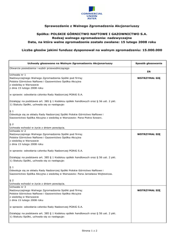 Sprawozdanie z Walnego Zgromadzenia Akcjonariuszy Spółka: POLSKIE GÓRNICTWO NAFTOWE I GAZOWNICTWO S.A. Rodzaj walnego zgromadzenia: nadzwyczajne Data, na która walne zgromadzenie zostało zwołane: 15 lutego 2008 roku Liczba głosów jakimi fundusz dysponował na walnym zgromadzeniu: 15.000.000 Uchwały głosowane na Walnym Zgromadzeniu Akcjonariuszy Sposób głosowania Otwarcie posiedzenia i wybór przewodniczącego ZA Uchwała nr 1 Nadzwyczajnego Walnego Zgromadzenia Spółki pod firmą: Polskie Górnictwo Naftowe i Gazownictwo Spółka Akcyjna z siedzibą w Warszawie z dnia 15 lutego 2008 roku WSTRZYMAŁ SIĘ w sprawie: odwołania członka Rady Nadzorczej PGNiG S.A. Działając na podstawie art. 385 § 1 Kodeksu spółek handlowych oraz § 56 ust. 2 pkt. 1) Statutu Spółki, uchwala się co następuje: §1 Odwołuje się ze składu Rady Nadzorczej Spółki Polskie Górnictwo Naftowe i Gazownictwo Spółka Akcyjna z siedzibą w Warszawie: Pana Piotra Szwarc. §2 Uchwała wchodzi w życie z dniem powzięcia. Uchwała nr 2 Nadzwyczajnego Walnego Zgromadzenia Spółki pod firmą: Polskie Górnictwo Naftowe i Gazownictwo Spółka Akcyjna z siedzibą w Warszawie z dnia 15 lutego 2008 roku WSTRZYMAŁ SIĘ w sprawie: odwołania członka Rady Nadzorczej PGNiG S.A. Działając na podstawie art. 385 § 1 Kodeksu spółek handlowych oraz § 56 ust. 2 pkt. 1) Statutu Spółki, uchwala się co następuje: §1 Odwołuje się ze składu Rady Nadzorczej Spółki Polskie Górnictwo Naftowe i Gazownictwo Spółka Akcyjna z siedzibą w Warszawie: Pana Jarosława Wojtowicza. §2 Uchwała wchodzi w życie z dniem powzięcia. Uchwała nr 3 Nadzwyczajnego Walnego Zgromadzenia Spółki pod firmą: Polskie Górnictwo Naftowe i Gazownictwo Spółka Akcyjna z siedzibą w Warszawie z dnia 15 lutego 2008 roku w sprawie: odwołania członka Rady Nadzorczej PGNiG S.A. Działając na podstawie art. 385 § 1 Kodeksu spółek handlowych oraz § 56 ust. 2 pkt. 1) Statutu Spółki, uchwala się co następuje: Strona 1 z 2 WSTRZYMAŁ SIĘ §1 Odwołuje się ze składu Rady Nadzorczej Spółki Polskie Górnictwo Naftowe i Gazownictwo Spółka Akcyjna z siedzibą w Warszawie: Pana Andrzeja Rościszewskiego. §2 Uchwała wchodzi w życie z dniem powzięcia. Uchwała nr 4 Nadzwyczajnego Walnego Zgromadzenia Spółki pod firmą: Polskie Górnictwo Naftowe i Gazownictwo Spółka Akcyjna z siedzibą w Warszawie z dnia 15 lutego 2008 roku WSTRZYMAŁ SIĘ w sprawie: odwołania członka Rady Nadzorczej PGNiG S.A. Działając na podstawie art. 385 § 1 Kodeksu spółek handlowych oraz § 56 ust. 2 pkt. 1) Statutu Spółki, uchwala się co następuje: §1 Odwołuje się ze składu Rady Nadzorczej Spółki Polskie Górnictwo Naftowe i Gazownictwo Spółka Akcyjna z siedzibą w Warszawie: Pana Wojciecha Arkuszewskiego. §2 Uchwała wchodzi w życie z dniem powzięcia. Uchwała nr 5 Nadzwyczajnego Walnego Zgromadzenia Spółki pod firmą: Polskie Górnictwo Naftowe i Gazownictwo Spółka Akcyjna z siedzibą w Warszawie z dnia 15 lutego 2008 roku WSTRZYMAŁ SIĘ w sprawie: powołania członka Rady Nadzorczej PGNiG S.A. Działając na podstawie art. 385 § 1 Kodeksu spółek handlowych oraz § 56 ust. 2 pkt. 1) Statutu Spółki, uchwala się co następuje: §1 Powołuje się w skład Rady Nadzorczej Spółki Polskie Górnictwo Naftowe i Gazownictwo Spółka Akcyjna z siedzibą w Warszawie: Pana Stanisława Rychlickiego (PESEL: 44041002115). §2 Uchwała wchodzi w życie z dniem powzięcia. Uchwała nr 6 Nadzwyczajnego Walnego Zgromadzenia Spółki pod firmą: Polskie Górnictwo Naftowe i Gazownictwo Spółka Akcyjna z siedzibą w Warszawie z dnia 15 lutego 2008 roku w sprawie: powołania członka Rady Nadzorczej PGNiG S.A. Działając na podstawie art. 385 § 1 Kodeksu spółek handlowych oraz § 56 ust. 2 pkt. 1) Statutu Spółki, uchwala się co następuje: §1 Powołuje się w skład Rady Nadzorczej Spółki Polskie Górnictwo Naftowe i Gazownictwo Spółka Akcyjna z siedzibą w Warszawie: Pana Grzegorza Banaszka (PESEL: 65070311933). §2 Uchwała wchodzi w życie z dniem powzięcia. Strona 2 z 2 WSTRZYMAŁ SIĘ