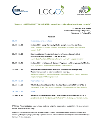 Warsztat „SUSTAINABILITY IN BUSINESS – osiągnij korzyści z odpowiedzialnego rozwoju” 29 stycznia 2014, środa Centrum Konferencyjne Adgar Plaza, Warszawa, ul. Postępu 17a AGENDA 10.00 Rejestracja, kawa powitalna 10.30 – 11.00 Sustainability along the Supply Chain: going beyond the borders. Inigo Canalejo, Customer Solutions Manager & European Sustainability Leader, CHEP 11.00 – 11.20 Zrównoważone wykorzystanie zasobów transportowych dzięki dynamicznemu planowaniu - case Bakalland. Marta Cudziło, Project Manager, Instytut Logistyki i Magazynowania 11.20 – 11.45 Sustainability w łańcuchach dostaw. Przykłady efektywnych działań Nestle. Piotr Dąbrowski, Supply Chain Manager, Nestle Polska 11.45 – 12.00 Współpraca nauki i biznesu w ramach Platformy Technologicznej. Wzajemne wsparcie w zrównoważonym rozwoju. Małgorzata Kirchner, Project Manager, Marcin Foltyński, Project Manager, Instytut Logistyki i Magazynowania 12.00 – 12.15 Przerwa kawowa 12.15 – 14.15 What is Sustainability and How Can Your Business Profit from It? Cz. 1. Jonathan T. Scott, The Center for Industrial Productivity and Sustainability. 14.15 – 15.00 Lunch 15.00 – 16.30 What is Sustainability and How Can Your Business Profit from It? Cz. 2. Jonathan T. Scott, The Center for Industrial Productivity and Sustainability. UWAGA: Warsztat będzie prowadzony zarówno w języku polskim jak I angielskim. Nie zapewniamy tłumaczenia symultanicznego. Warsztaty zostały zorganizowane w ramach projektu „LOGOS. Model koordynacji wirtualnych łańcuchów dostaw spełniający wymogi społecznej odpowiedzialności biznesu” dofinansowanego ze środków Narodowego Centrum Badań i Rozwoju. Workshop: „SUSTAINABILITY IN BUSINESS – how to benefit from the responsible development” 29th January 2014, Wednesday Adgar Plaza Conference Center, Warsaw, Postępu 17a AGENDA 10.00 Registration, welcome coffee 10.30 – 11.00 Sustainability along the Supply Chain: going beyond the borders. Inigo Canalejo, Customer Solutions Manager & European Sustainability Leader, CHEP 11.00 – 11.20 Sustainable use of transport resources through dynamic transport planning – Bakalland case study. Marta Cudziło, Project Manager, Instytut Logistyki i Magazynowania 11.20 – 11.45 Sustainability in Supply Chains. Examples of Nestle’s effective activieties. Piotr Dąbrowski, Supply Chain Manager, Nestle Polska 11.45 – 12.00 Co-operation between science and business within the Technology Platform. Mutual support in sustainable development. Małgorzata Kirchner, Project Manager, Marcin Foltyński, Project Manager, Instytut Logistyki i Magazynowania 12.00 – 12.15 Coffee break 12.15 – 14.15 What is Sustainability and How Can Your Business Profit from It? Part 1. Jonathan T. Scott, The Center for Industrial Productivity and Sustainability. 14.15 – 15.00 Lunch 15.00 – 16.30 What is Sustainability and How Can Your Business Profit from It? Part 2. Jonathan T. Scott, The Center for Industrial Productivity and Sustainability. NOTICE: The workshop’s presentations will be either in Polish or in English. We do not provide simultaneous translation. The workshop is organised within the project "LOGOS. Model of coordination of virtual supply chain that meets the requirements of corporate social responsibility" funded by the National Research and Development Centre.